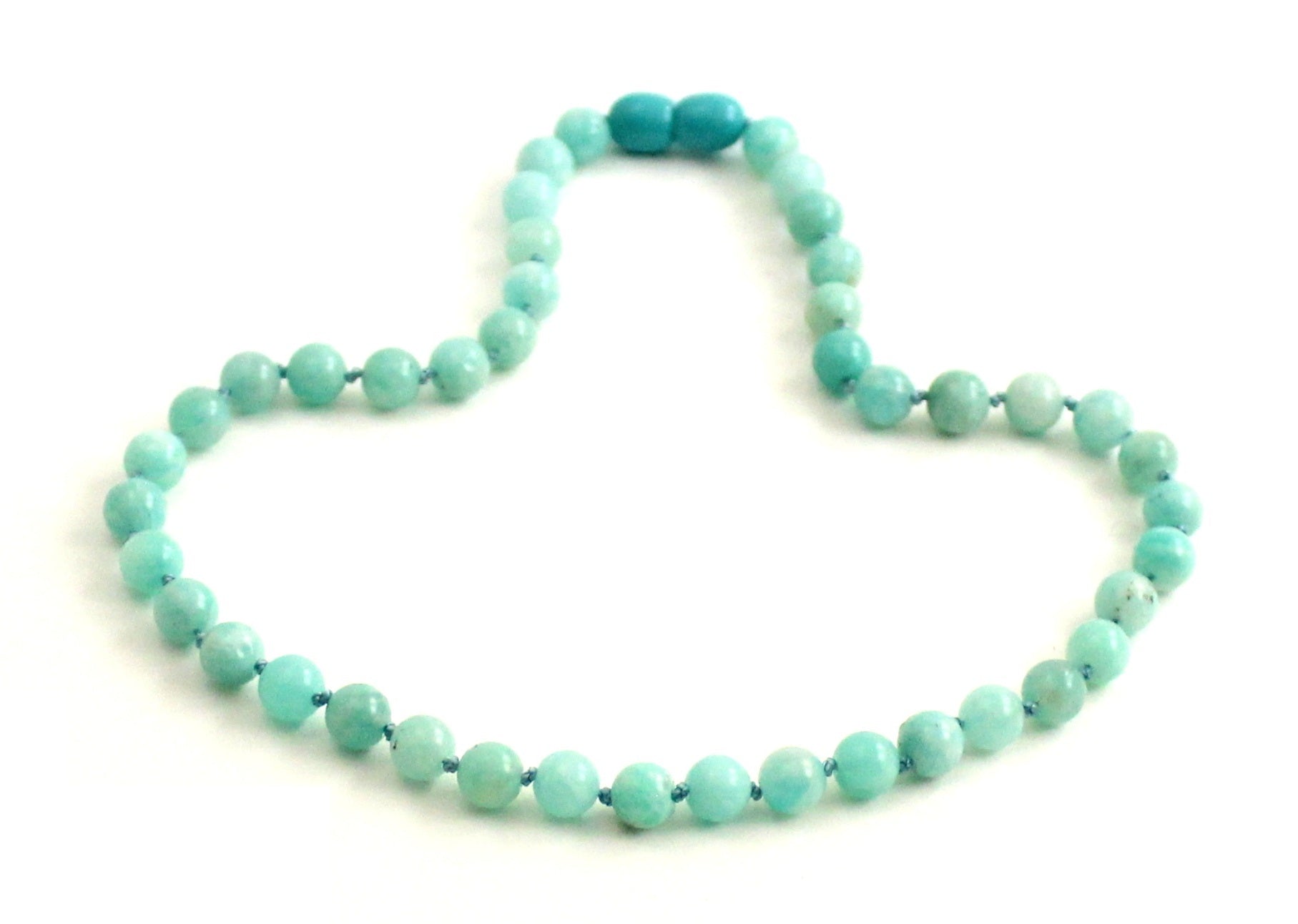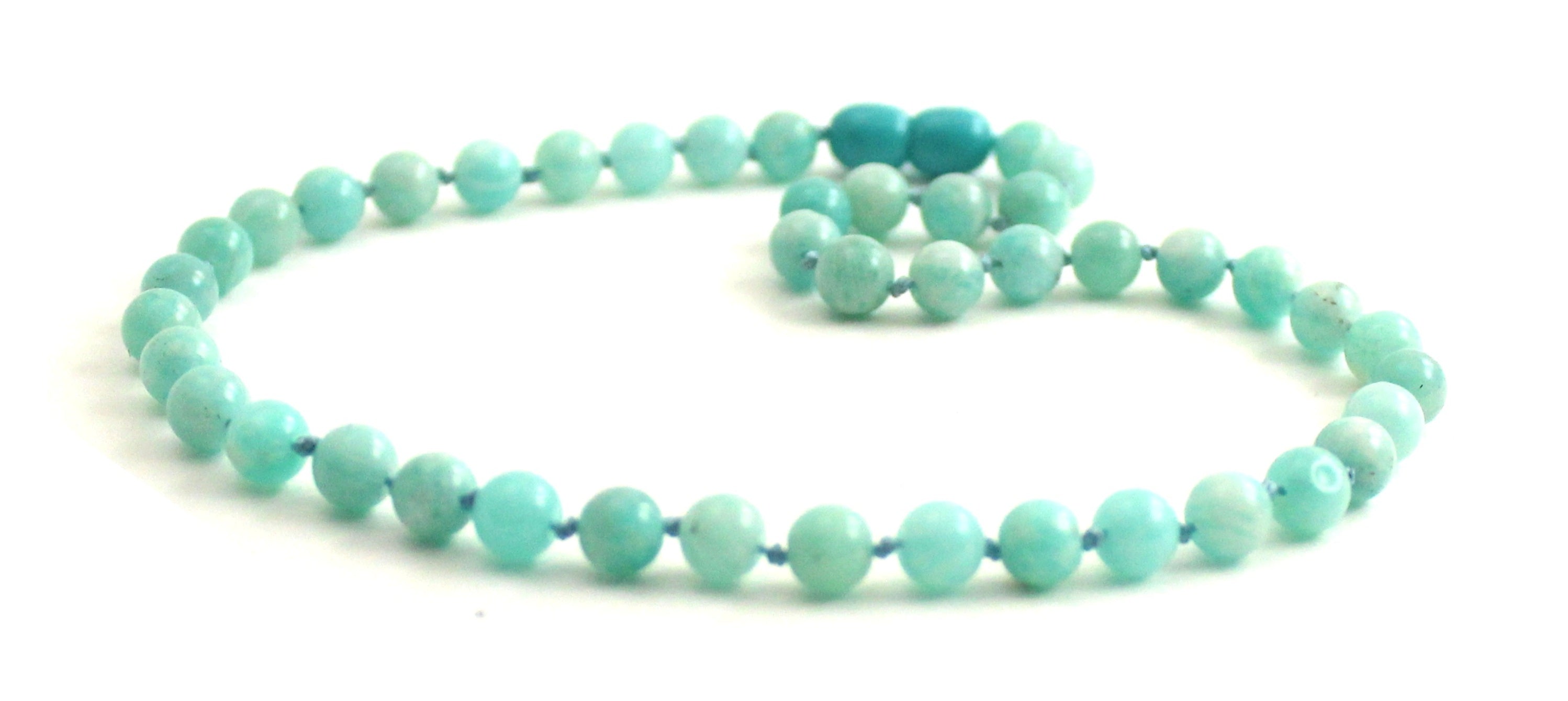 Amazonite Color: Green; Closure: Plastic Clasp (Screw); Bead Diameter: ~5 mm; Gemstone Beads: Amazonite; Amazonite Bead Shape: Round (Oval); String: Gray (Polyester 100%); Necklace Weight: ~7 g (32 cm); Unlock the... Read more