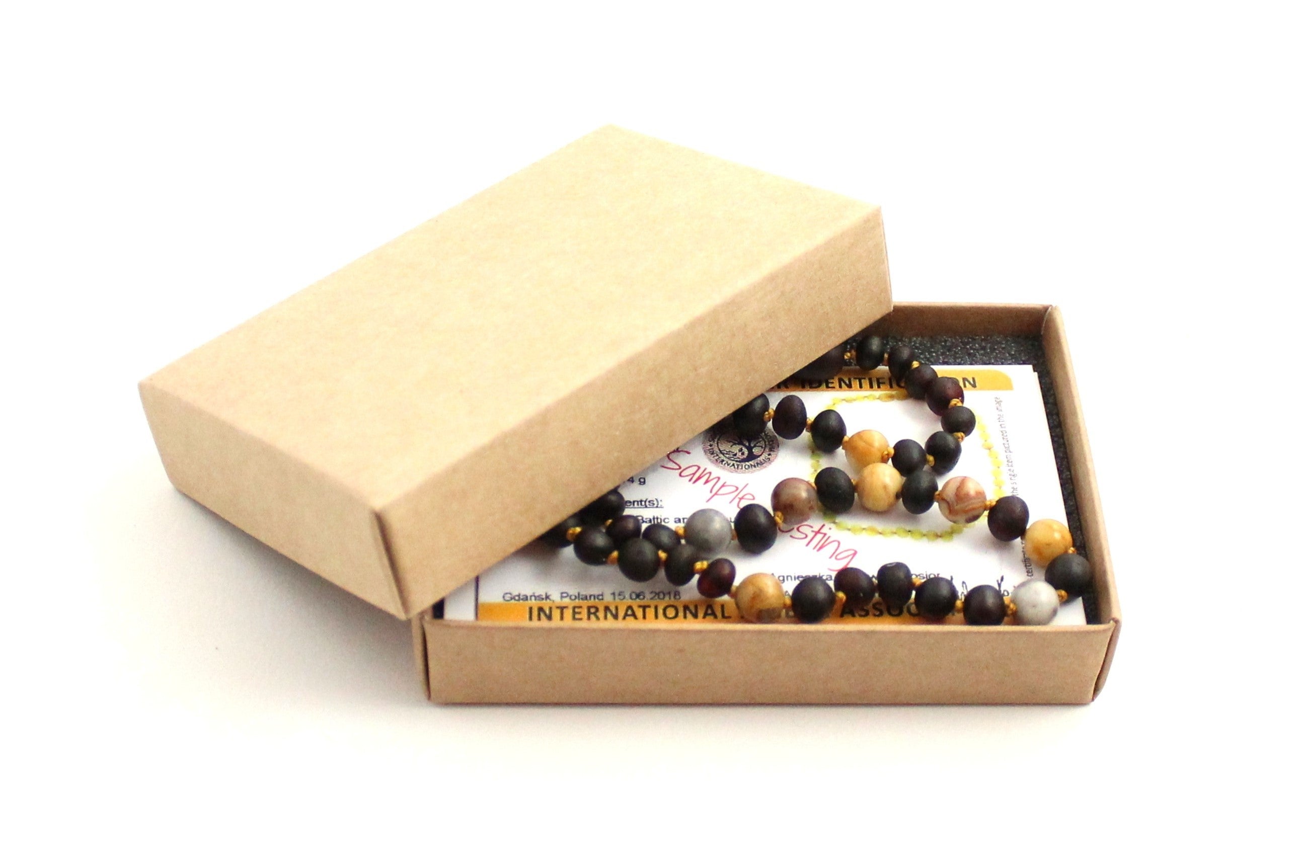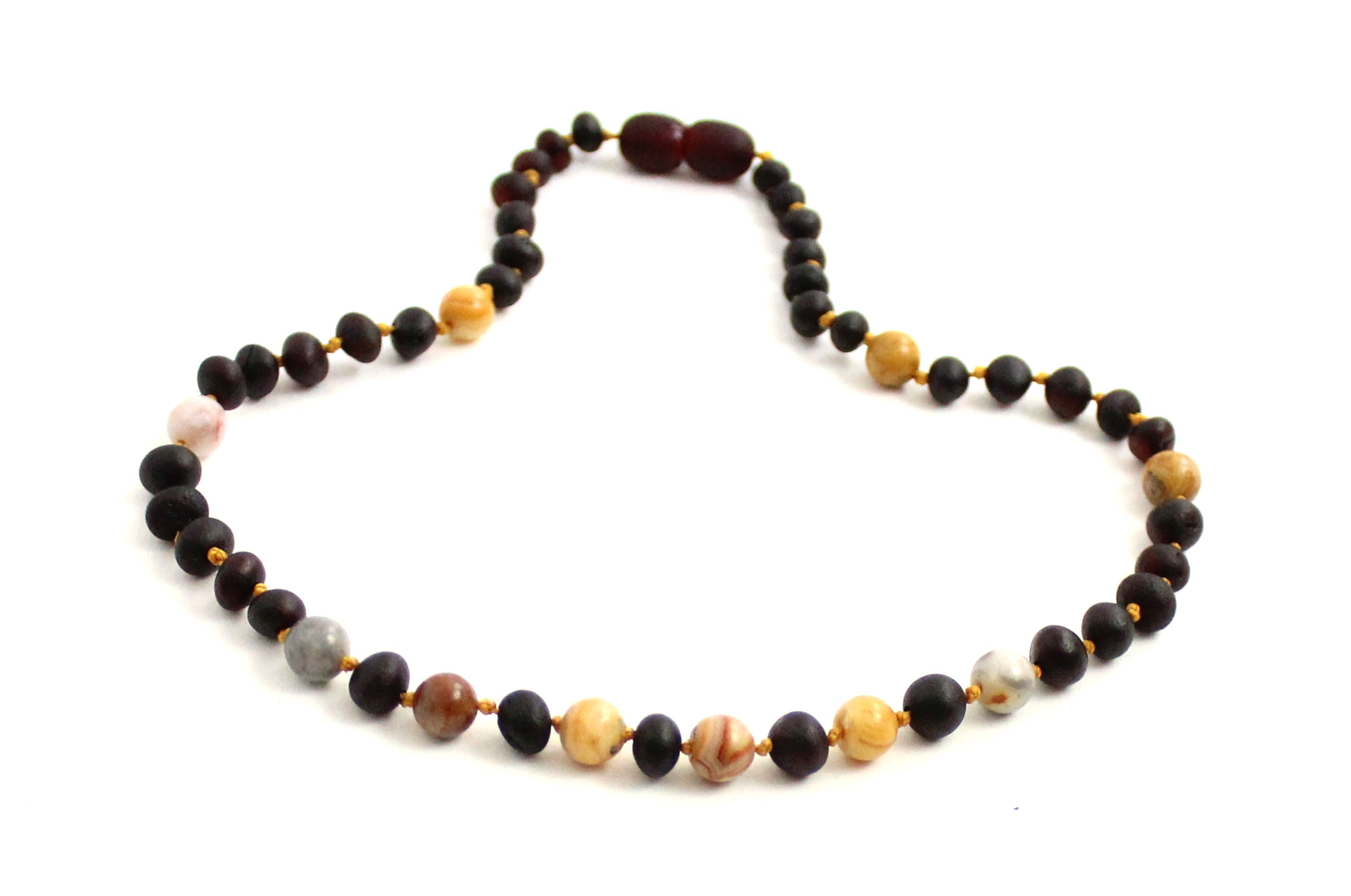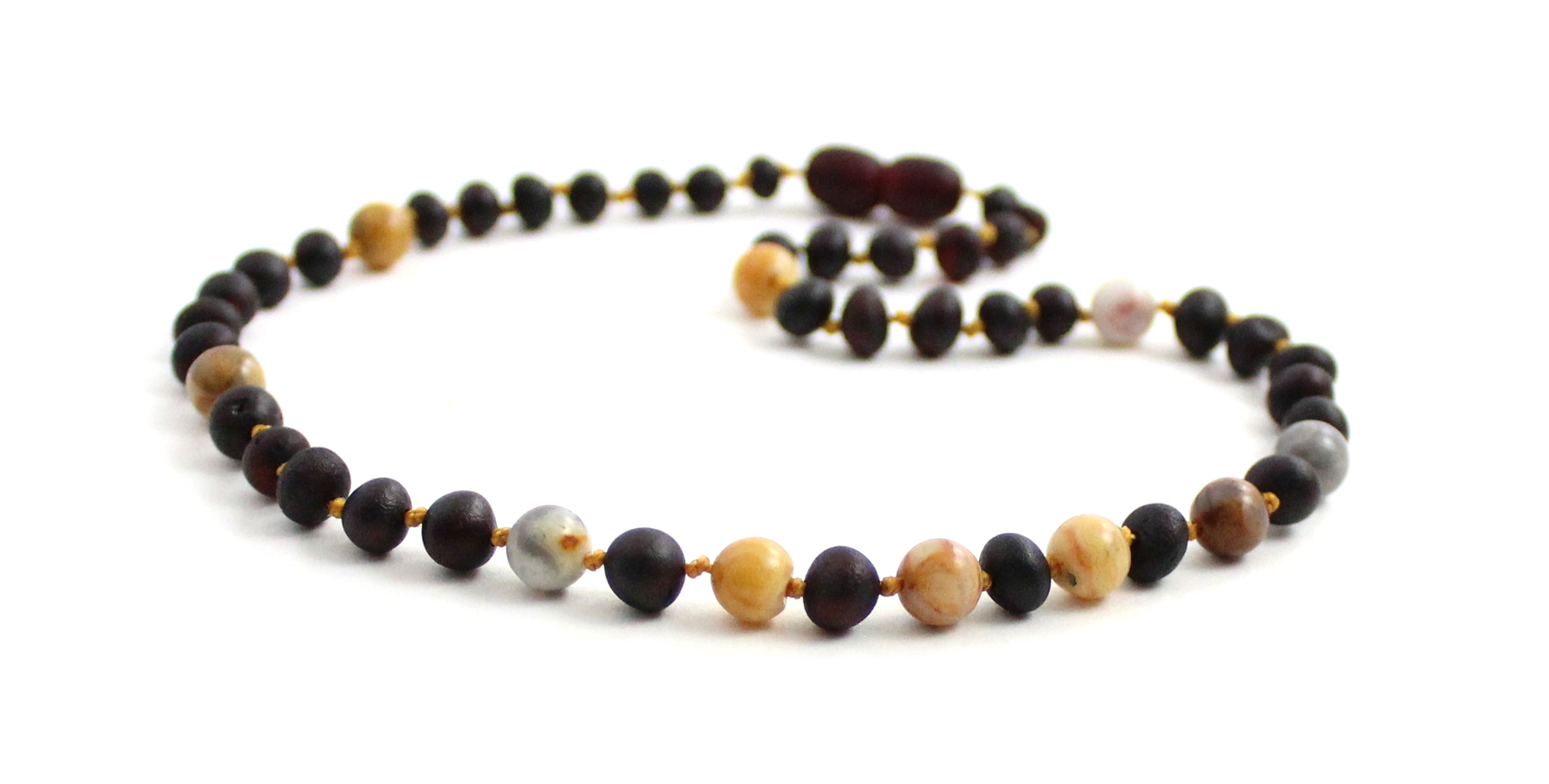 Bead Diameter: ~3-5 mm (Baltic Amber), ~6 mm (Gemstones); Amber Bead Surface: Raw; Gemstone Beads: Crazy Agate (Gray); Closure: Plastic Clasp (Screw); Amber Color: Cherry (Black);... Read more