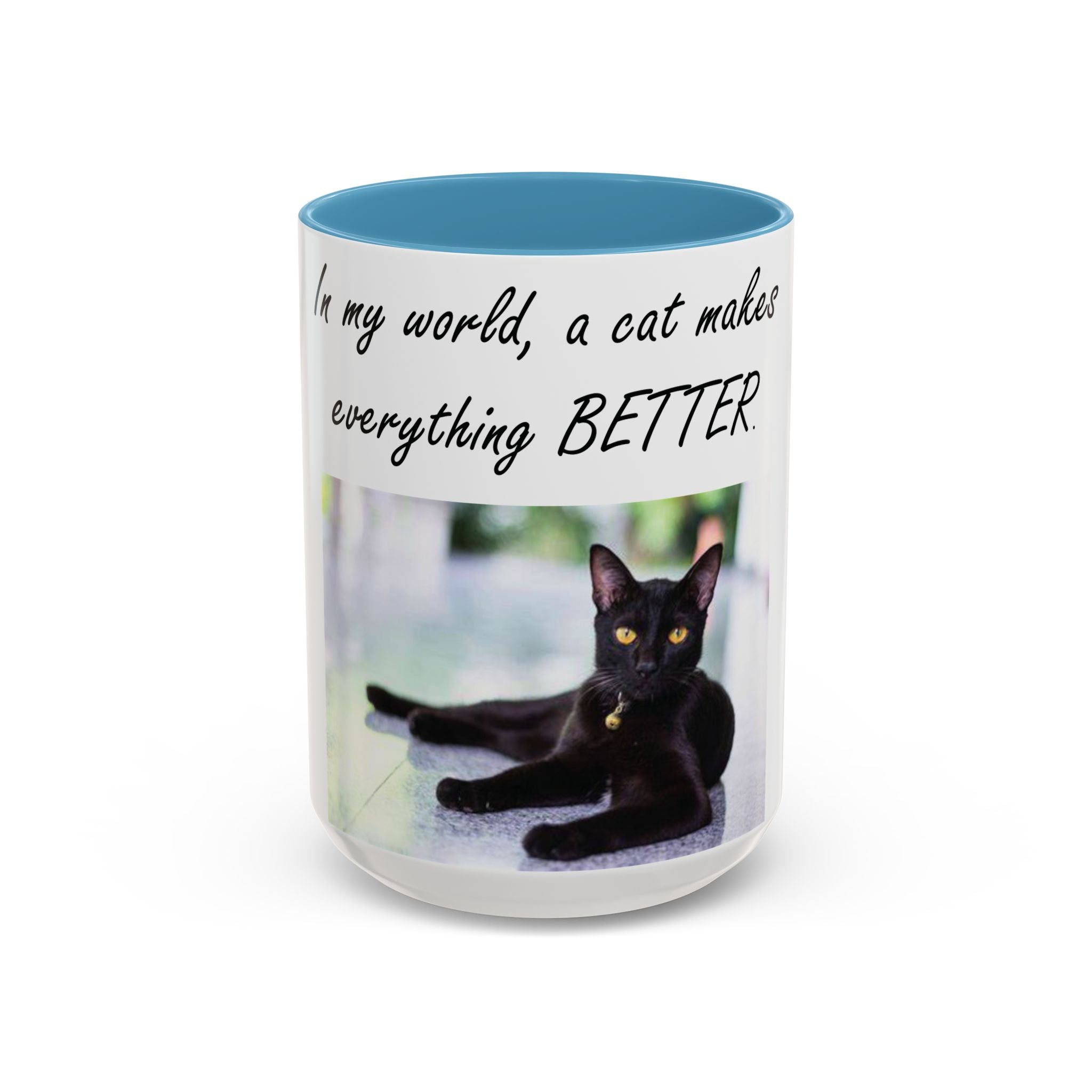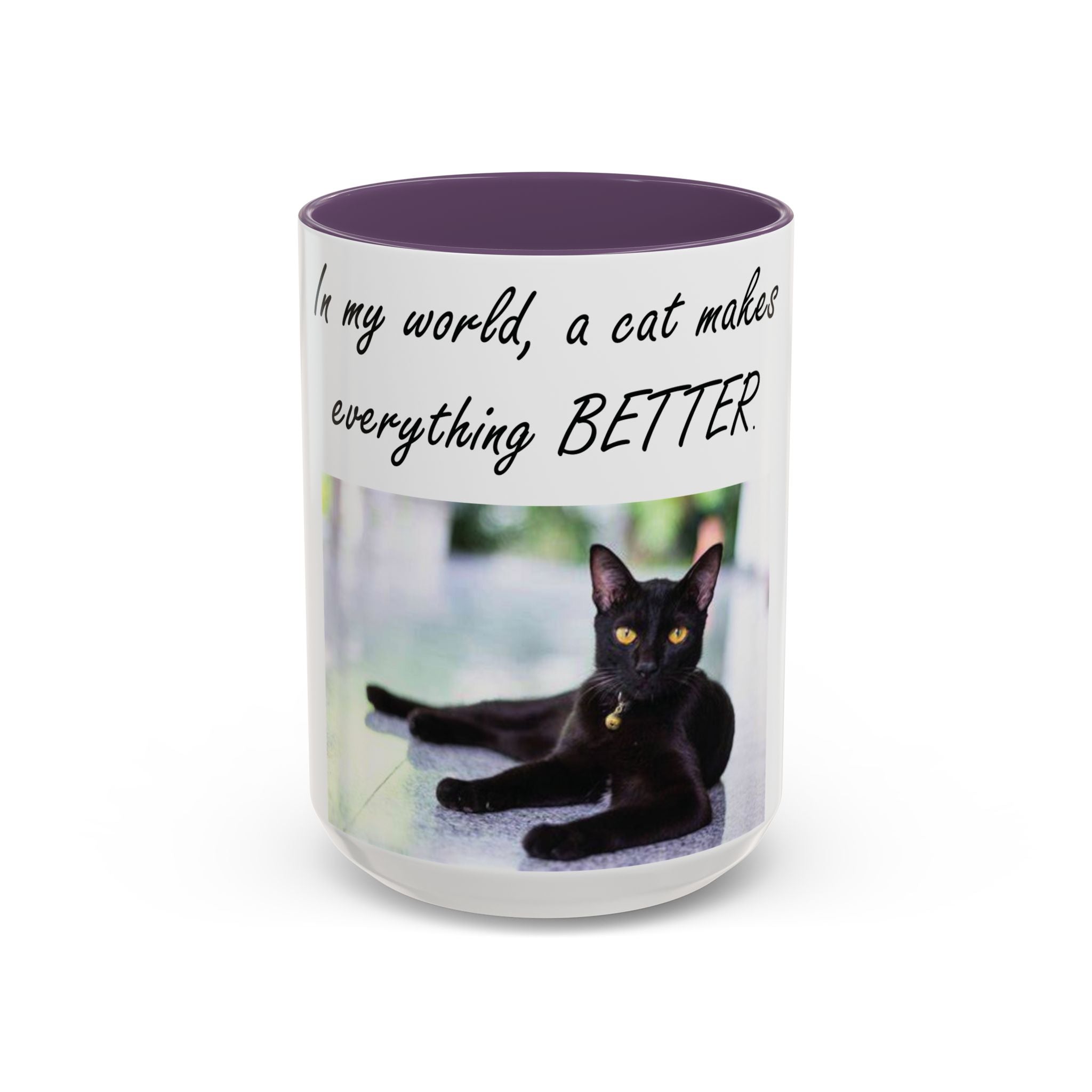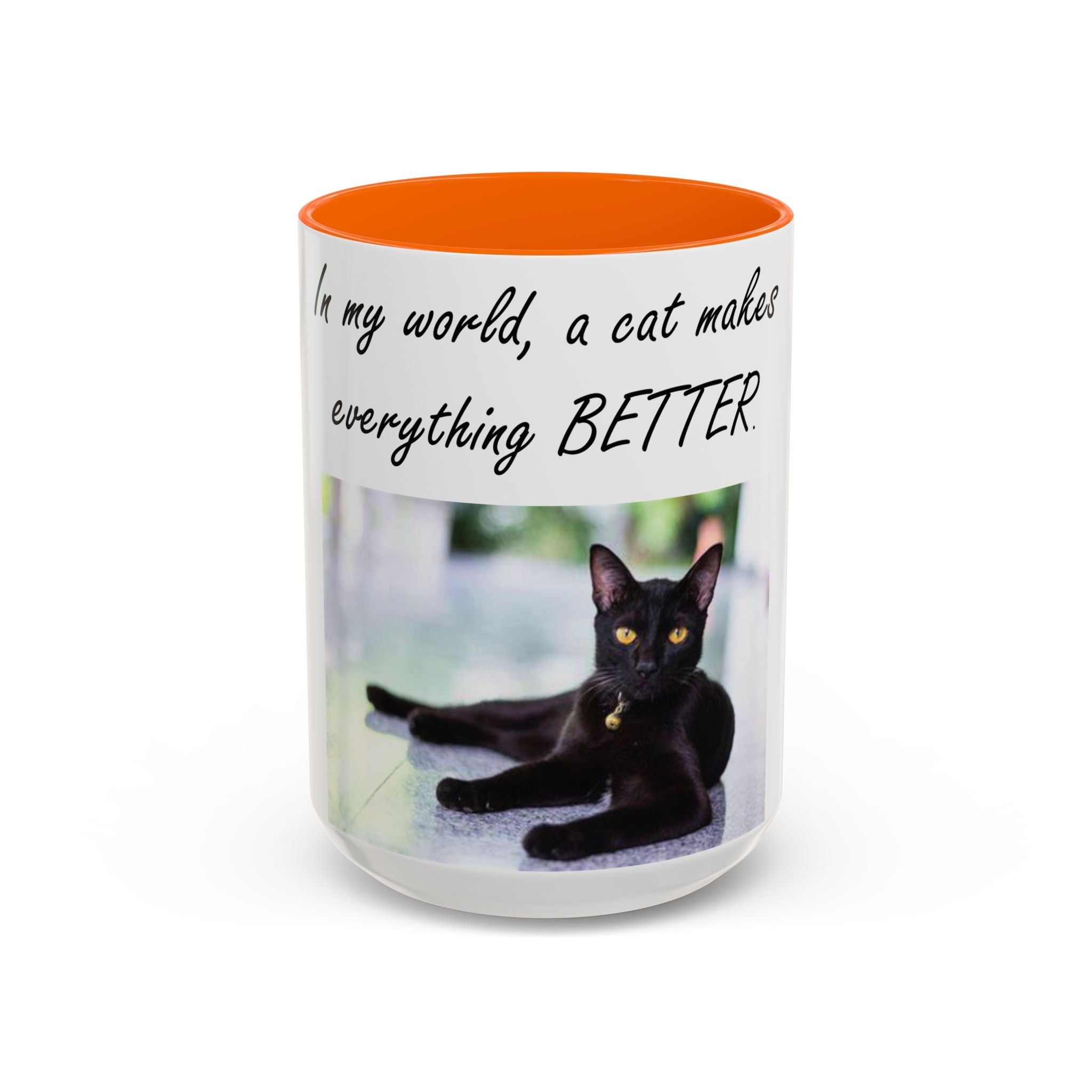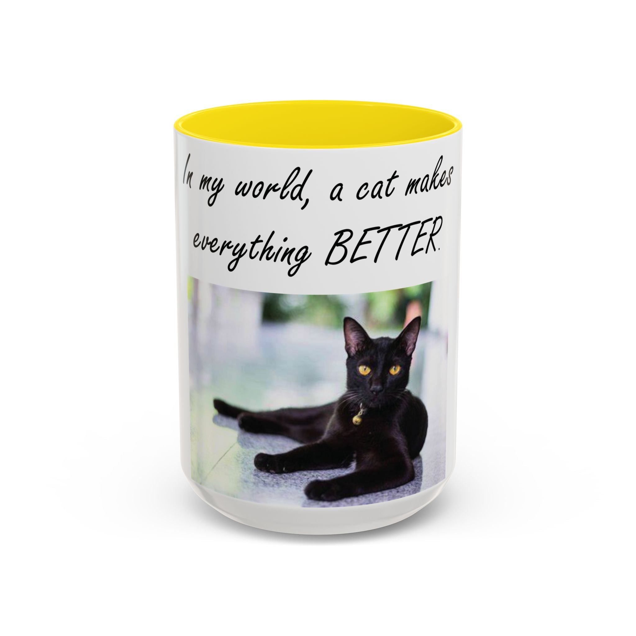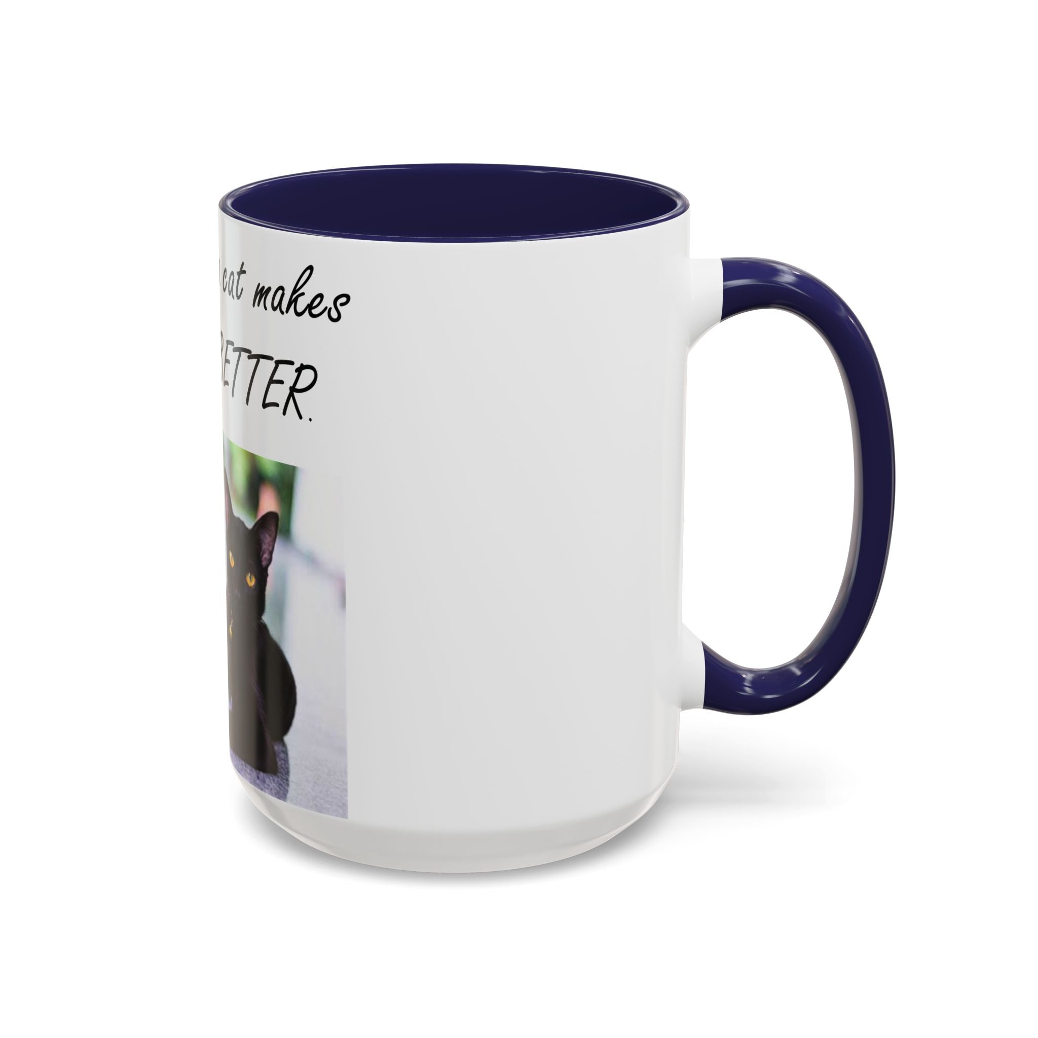 Enjoy your favorite hot beverages in style with this vibrant Accent Coffee Mug. Made from durable white ceramic, this mug not only offers a glossy finish but also features a colorful interior and handle that add a playful touch to your morning routine. It's perfect for cat lovers seeking a daily pick-me-up, as the charming design reminds you that a cat makes everything better. Ideal for sipping coffee, tea, or hot chocolate, this mug is a great addition to your kitchenware or office desk. With its microwave-safe and dishwasher-safe properties, it's convenient for everyday use. The Accent Coffee Mug makes a thoughtful gift for birthdays, holidays, or just because. Bring some cheer to your mornings and elevate your beverage experience!