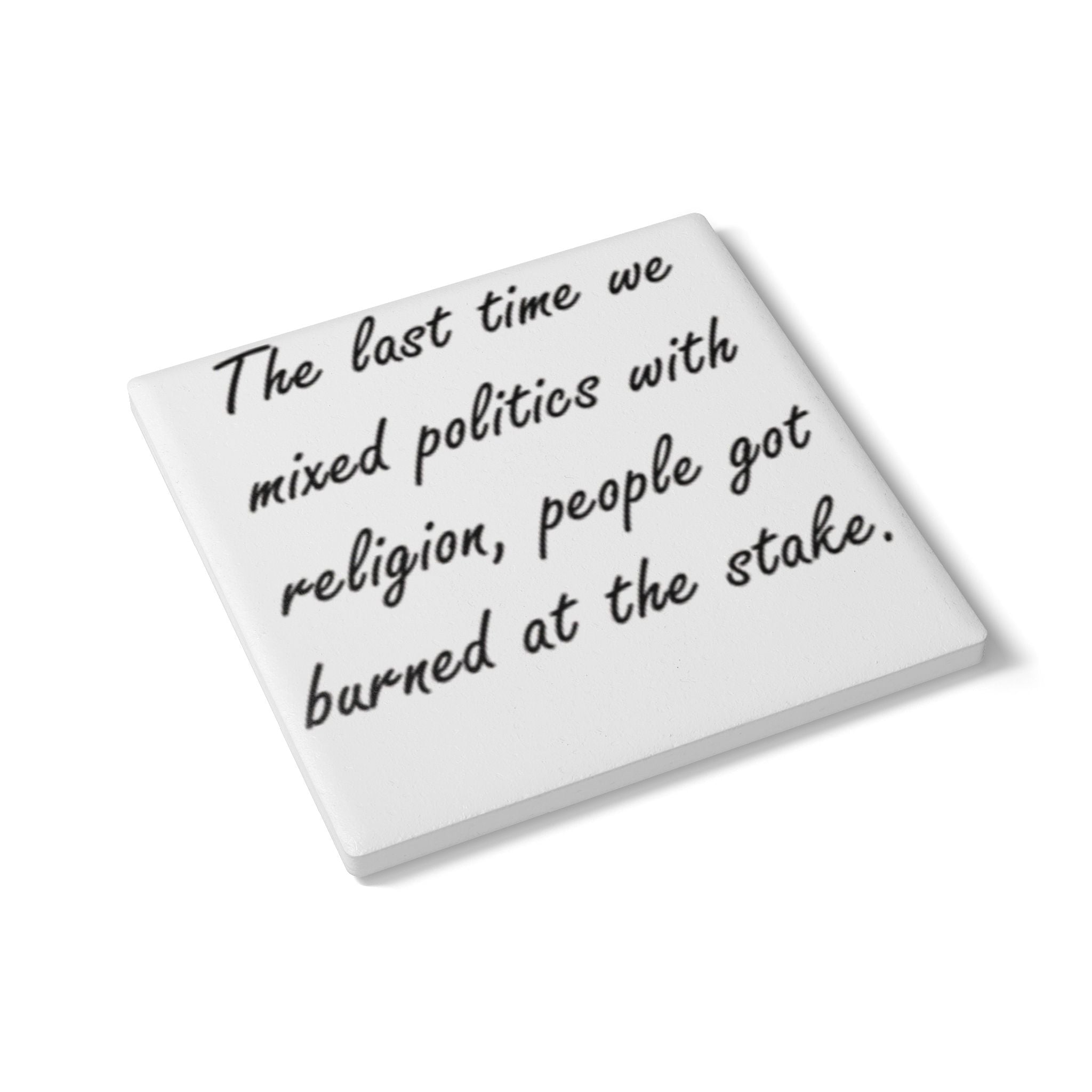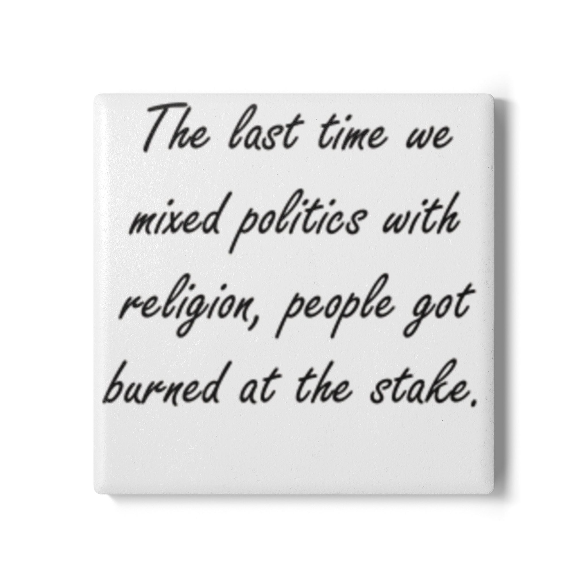Bring both wit and wisdom to your table with our premium Ceramic Coaster featuring a thought-provoking quote. Crafted from 100% white ceramic with a durable cork backing, this coaster protects your surfaces while sparking conversations. The design boldly states, “The last time we mixed politics with religion, people got burned at the stake,” serving as a reminder of historical lessons and the complexities of these intertwining themes.