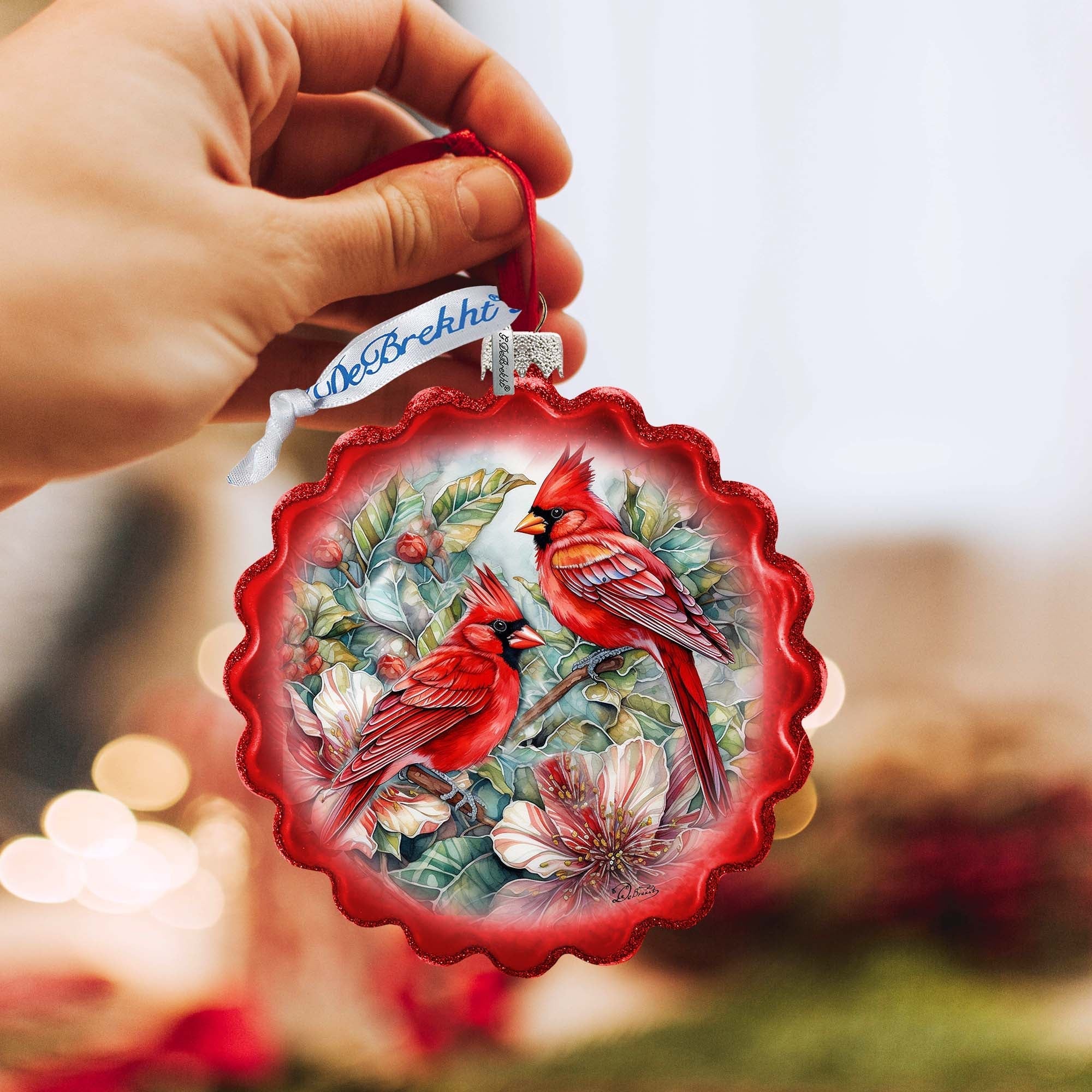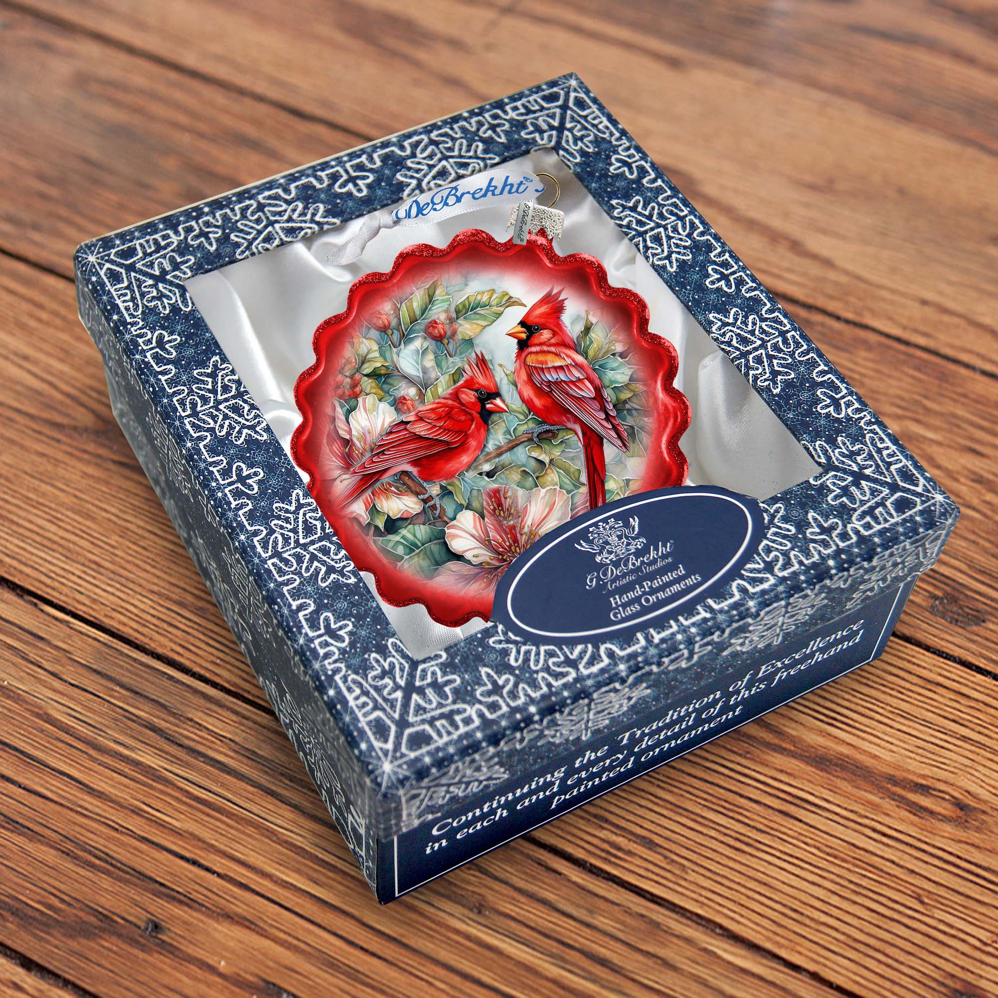 This hand-crafted glass ornament features ornately detailed cardinals perched in a wreath of holly, bringing the beauty of nature to your holiday Decor. Perfect for nature lovers, this unique G. Debrekht decoration will last for years to come.
