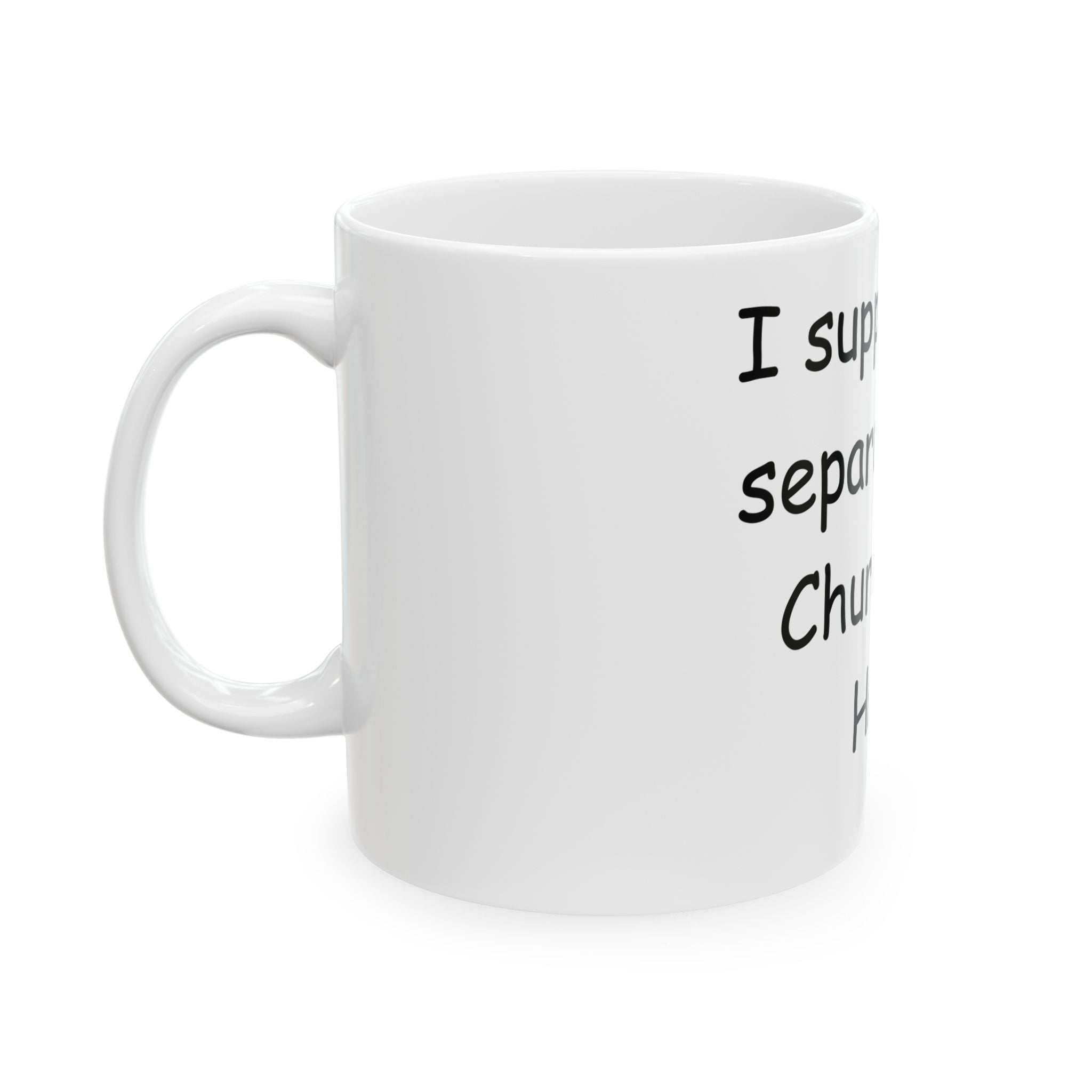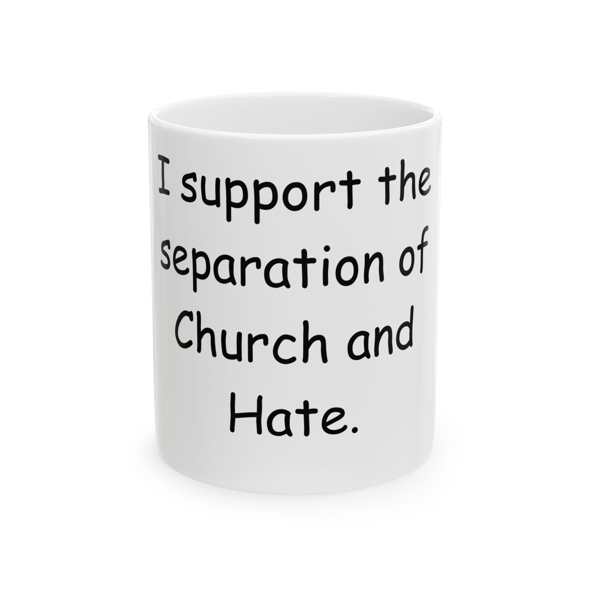 Start your day with a mug that speaks volumes. Featuring the bold and thought-provoking message 'I support the separation of Church and Hate,' this ceramic mug combines style and purpose. Its glossy finish and vibrant design make it an eye-catching addition to any routine, while its meaningful statement sparks conversations about inclusivity and equality. Perfect for coffee lovers, tea enthusiasts, and anyone who values compassion and unity. Whether it's a thoughtful gift or a personal statement piece, this mug is designed to inspire while keeping your favorite beverages close at hand.