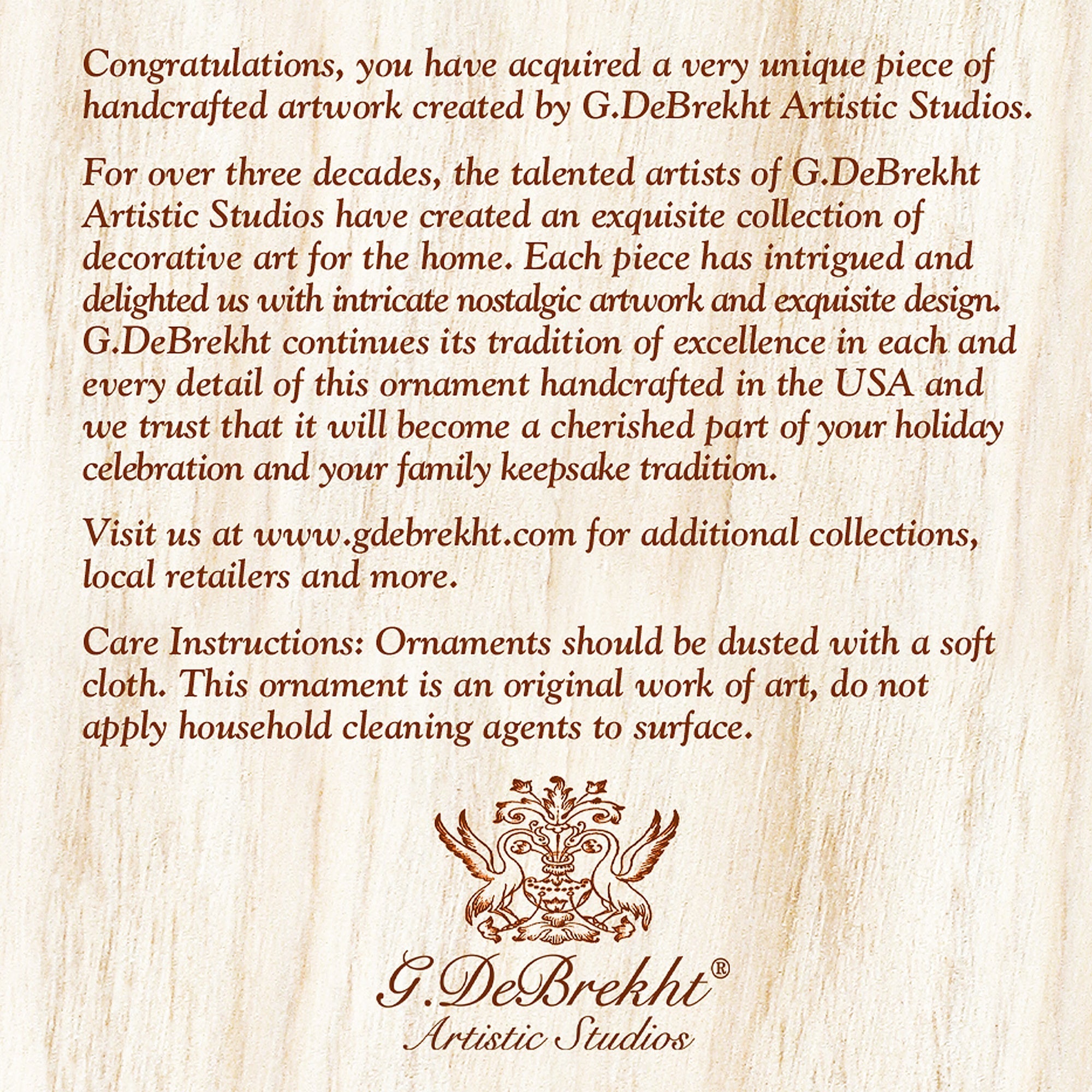 About Collection: The Mercury glass “Tree-gallery” Keepsake Glass Ornaments are artistically hand-crafted with added touches of gold and silver for a subtle glow. This Collection has been inspired by an old world-Eastern European family, who for almost 200 years had been painting beautiful miniature lacquered paper-mâché boxes inlaid with mother of pearl. It took years of perfecting this technique to establish this new and innovative form of painting that we now proudly present in our exclusive G. DeBrekht Glass ornaments. They are made, as in the old days- from 1.5 mm hand-blown Mercury Glass, silver powdered from the inside and then sandblasted from the outside. The combination of colors and the multi-layer painting techniques create a deep iridescent effect. We take pride in perfecting every piece by adding touches of gold, finishing them with a lovely satin ribbon, and presenting them in a gift box. Approximate size: 3” x 2”. Hand-made in the USA, every piece is unique- and will be passed on to future generations to cherish.