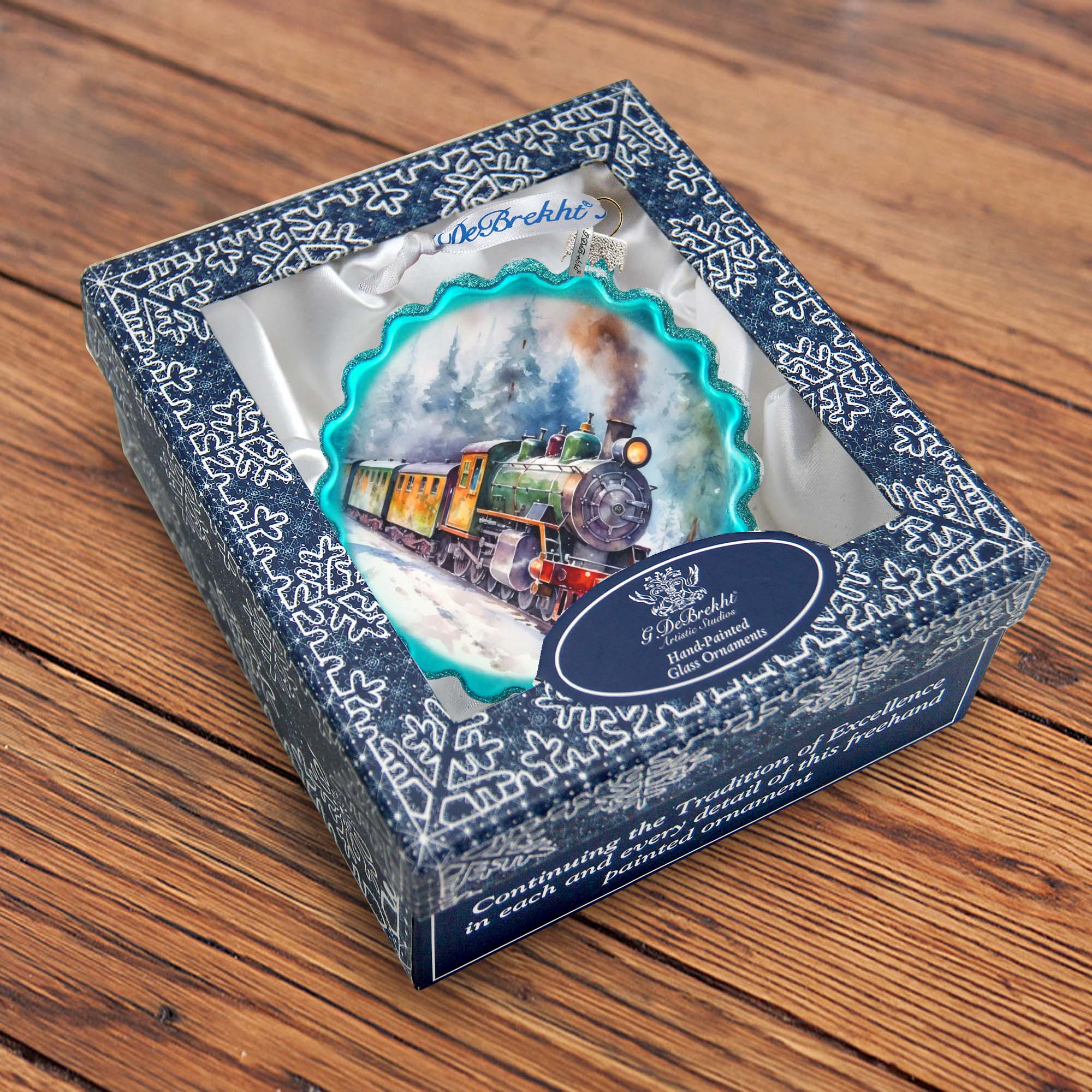 The Christmas Train Wreath Glass Ornament by G. Debrekht is a festive addition to your Christmas Decor. Crafted from high-quality glass, this ornament features an intricately detailed locomotive train, making it a perfect gift or display piece.