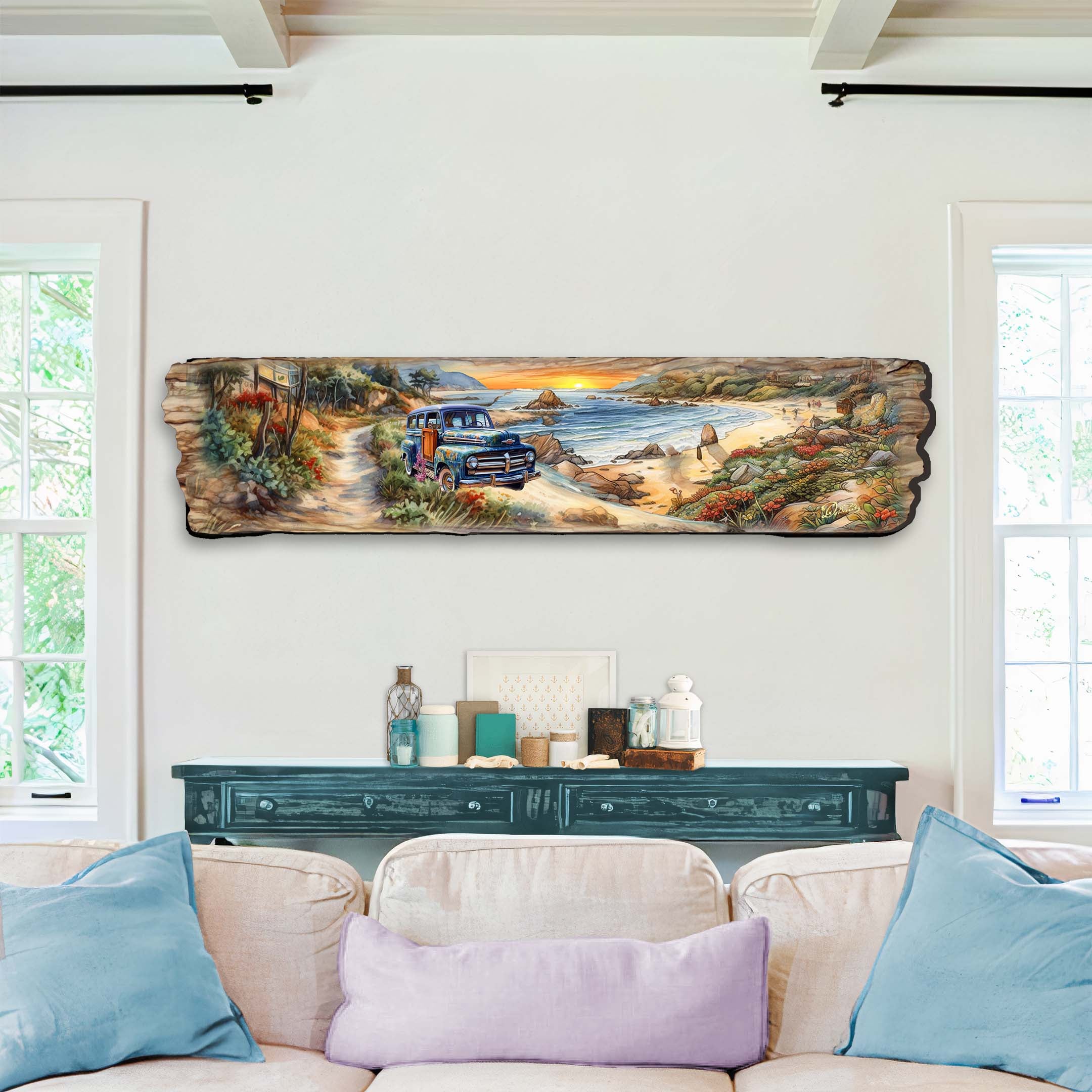 Transport yourself to a peaceful coastal retreat with the Coastal Sunrise Wall Art by G. DeBrekht. This stunning piece features a vintage car against a serene beach backdrop captured during a beautiful sunset. Add a touch of coastal charm to your home décor with this unique and timeless piece.