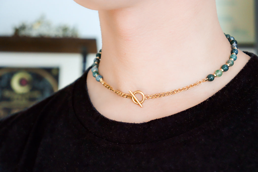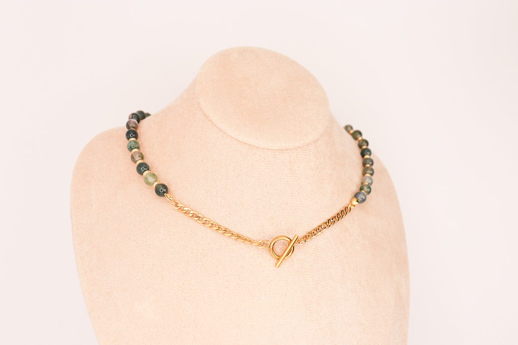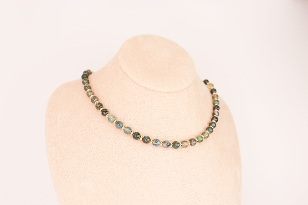 Wear this Moss Agate necklace to reconnect with Nature and Life. Appreciate the beauty of this stone's patterns, imitating moss embedded in translucent quartz beads. Live the present moment, feel the well-being and happiness of loving life.