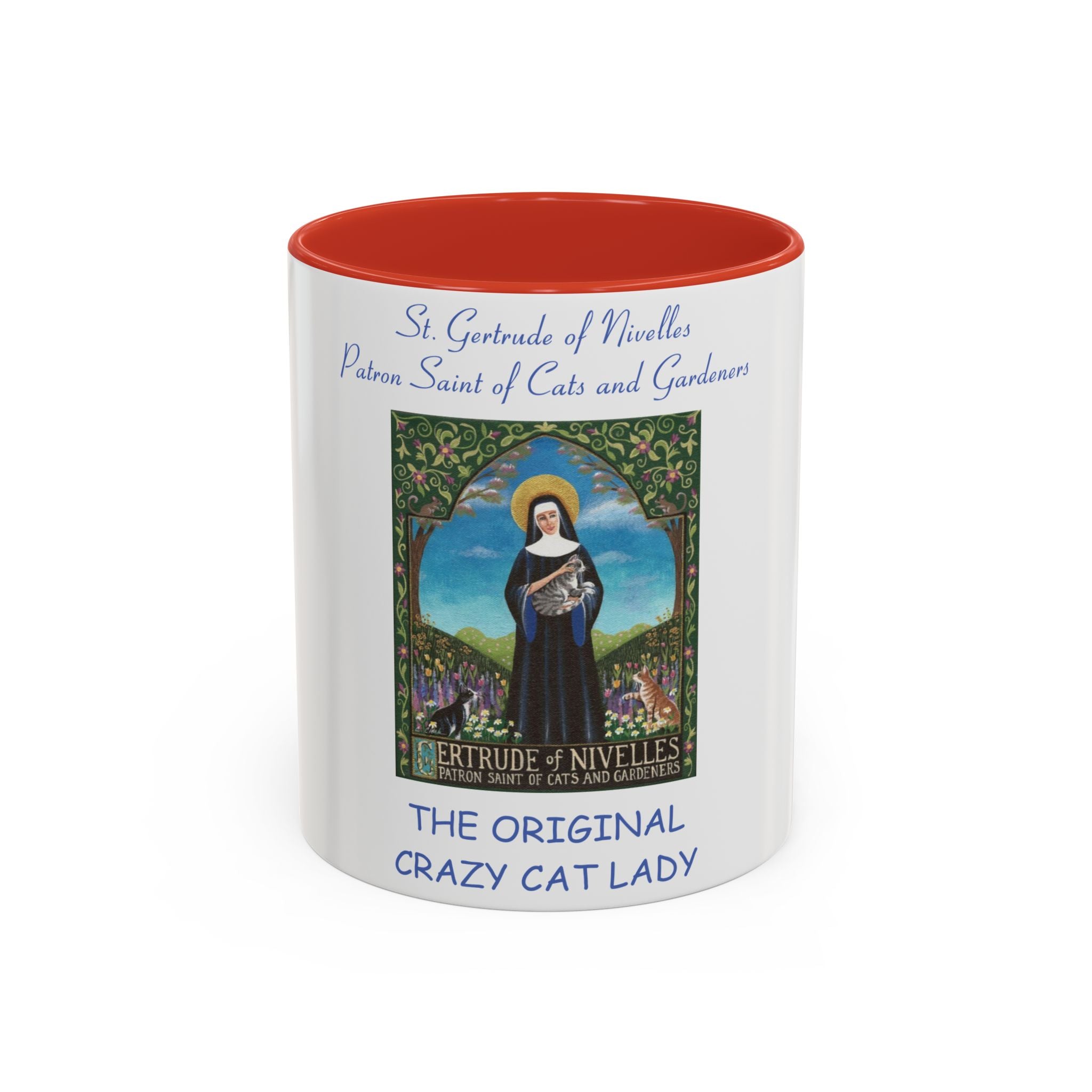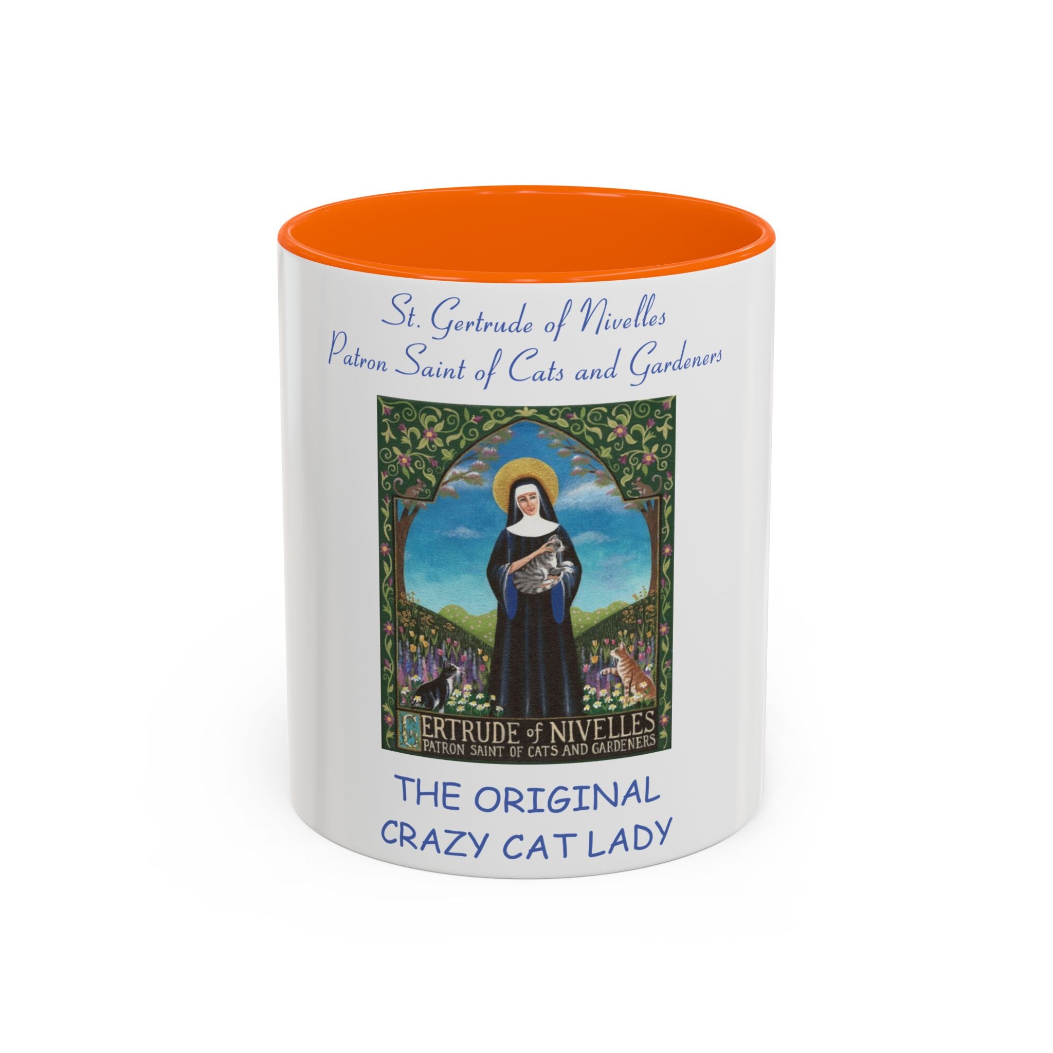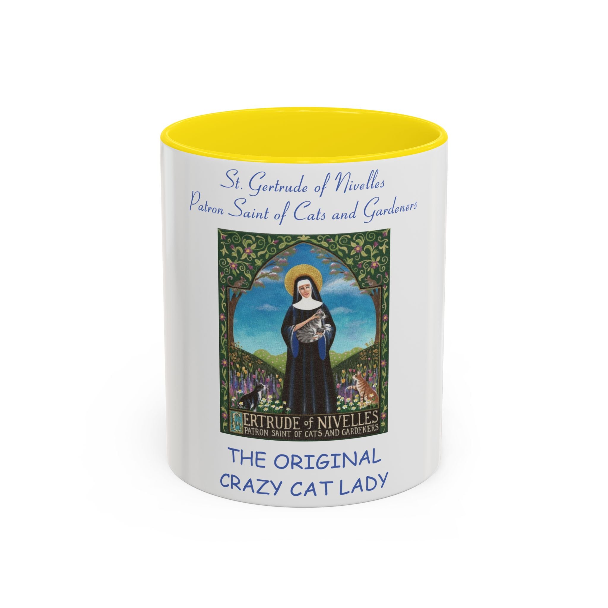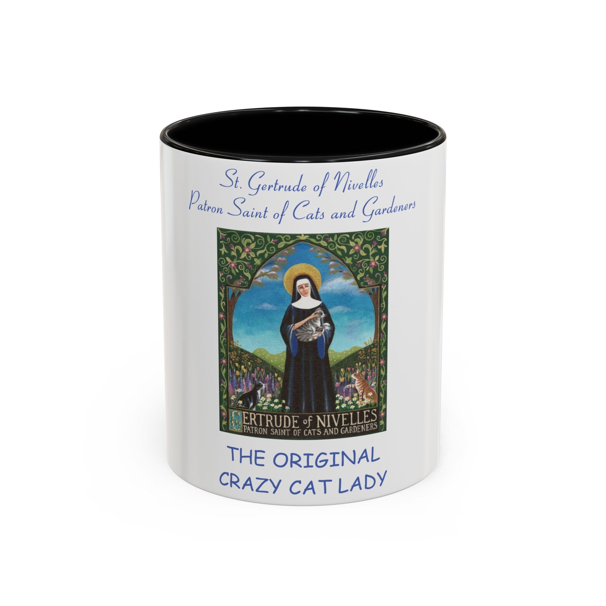 Start your day with a smile and a sip from this exclusive Accent Coffee Mug featuring a one-of-a-kind design by Judith Ann Dykeman (JAD). Celebrating St. Gertrude of Nivelles, the beloved Patron Saint of Cats and Gardeners, this mug blends timeless tradition with a touch of humor through the playful caption: 'St. Gertrude of Nivelles, Patron Saint of Cats and Gardeners. The Original Crazy Cat Lady.'