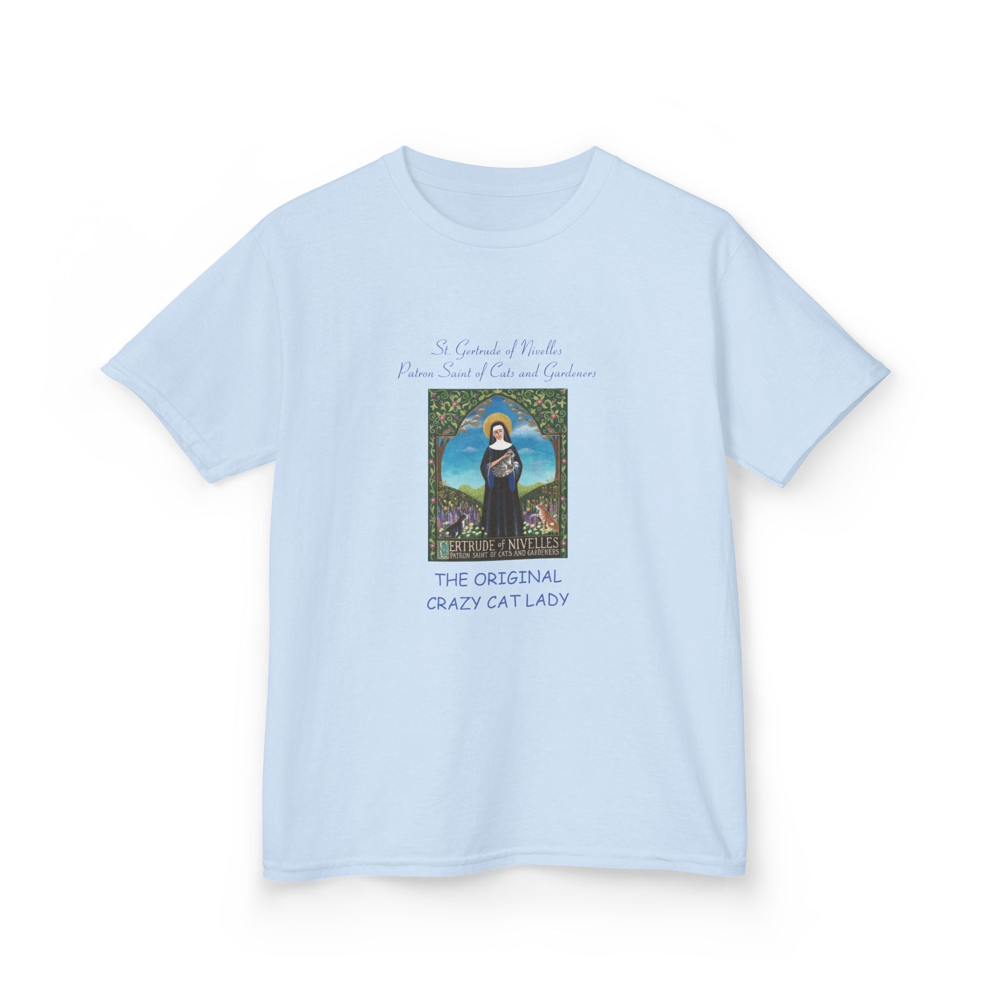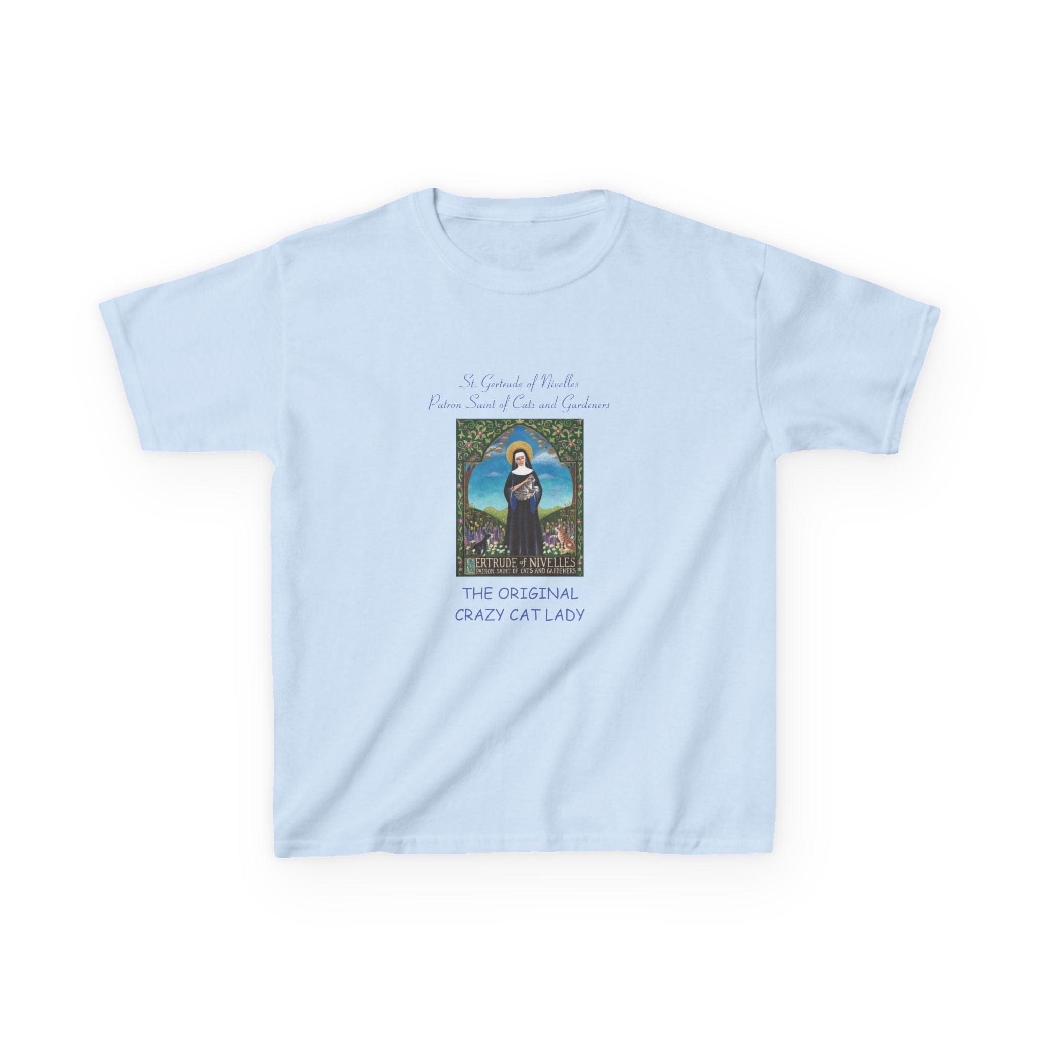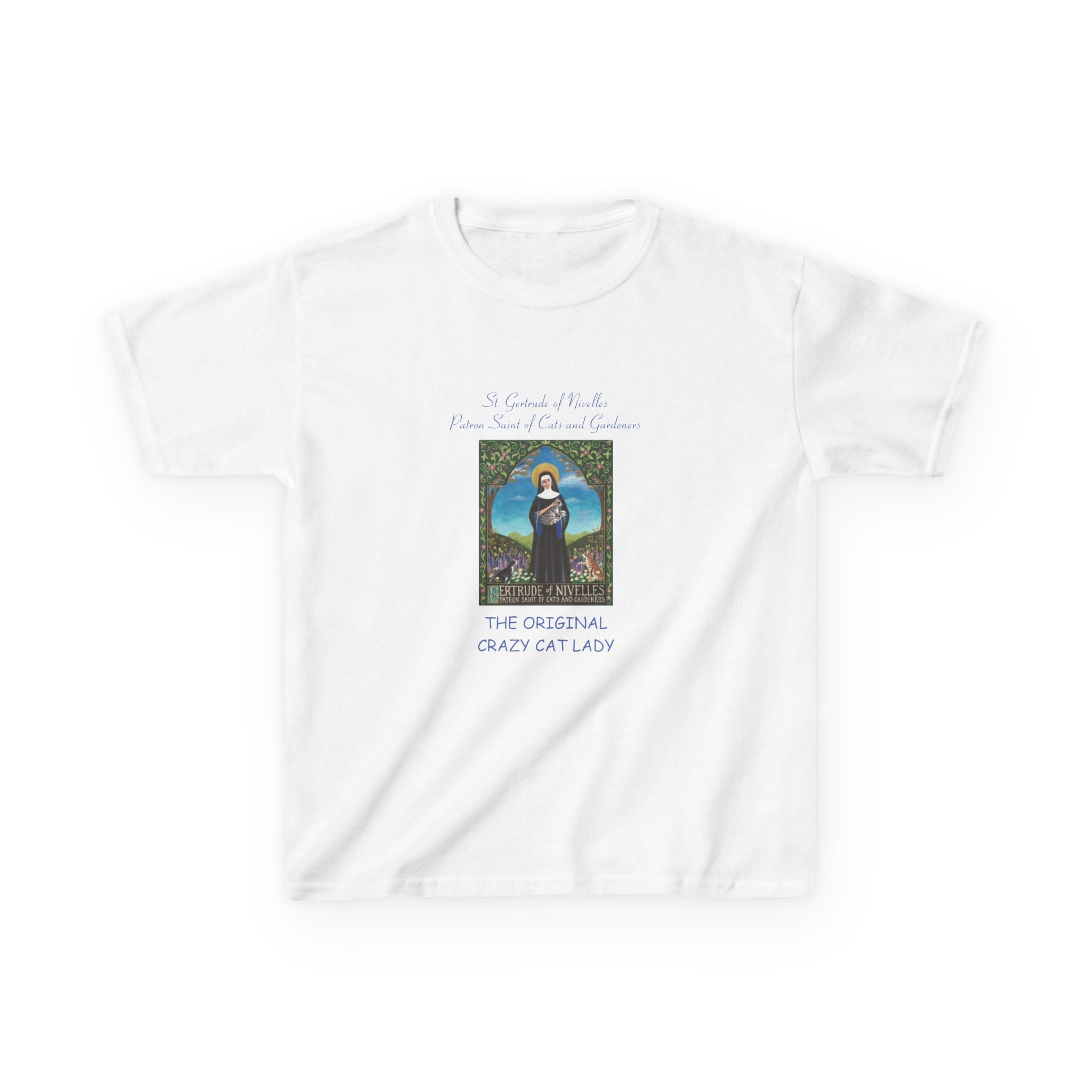 Celebrate tradition and whimsy with this exclusive Kids Heavy Cotton™ Tee designed by Judith Ann Dykeman (JAD). Featuring St. Gertrude of Nivelles, the cherished Patron Saint of Cats and Gardeners, this tee blends timeless artistry with a playful twist. The caption, 'St. Gertrude of Nivelles, Patron Saint of Cats and Gardeners. The Original Crazy Cat Lady,' adds charm and humor, making it perfect for young wearers who love to express their personalities. Crafted from ethically sourced US cotton, this tee ensures comfort and durability for everyday adventures or special occasions.