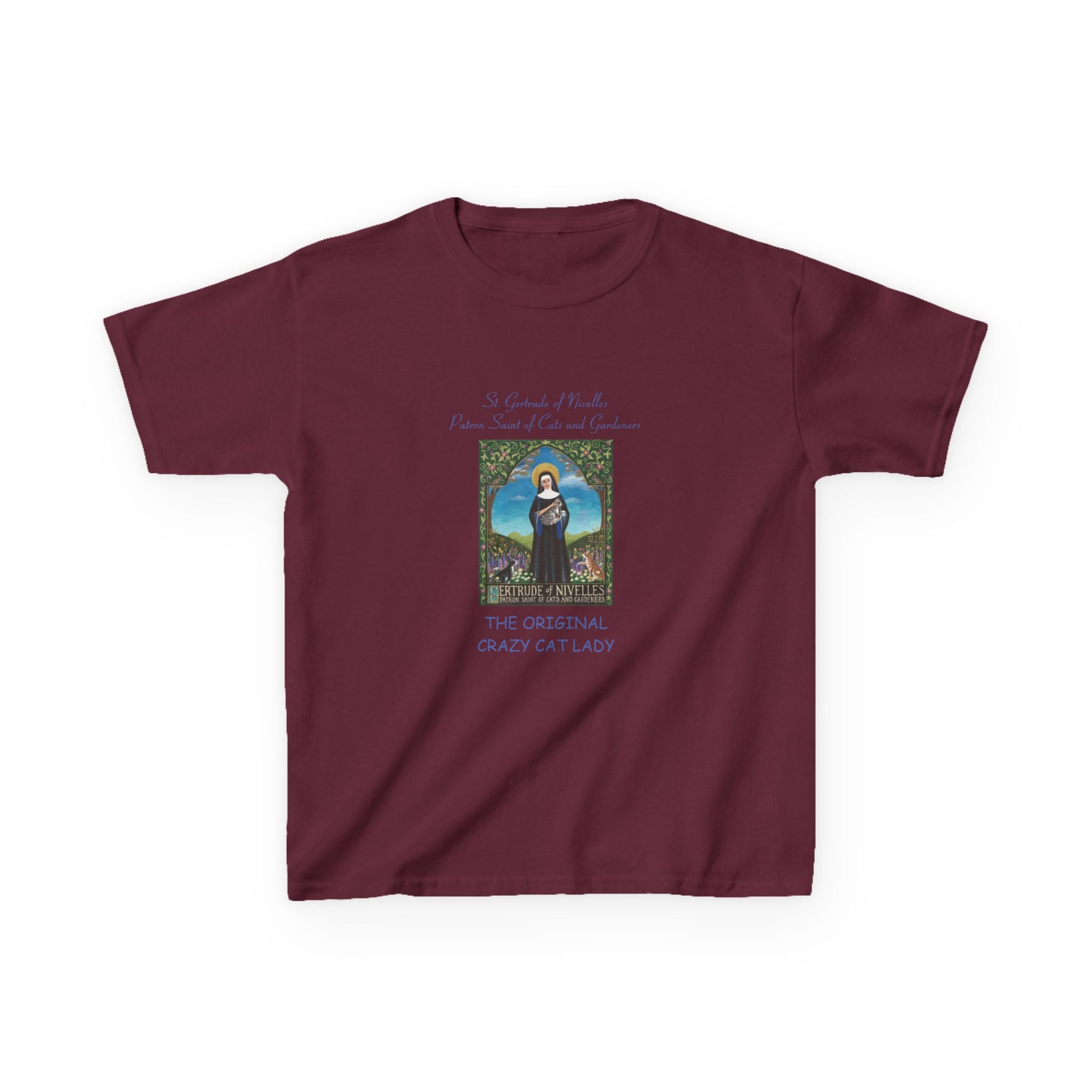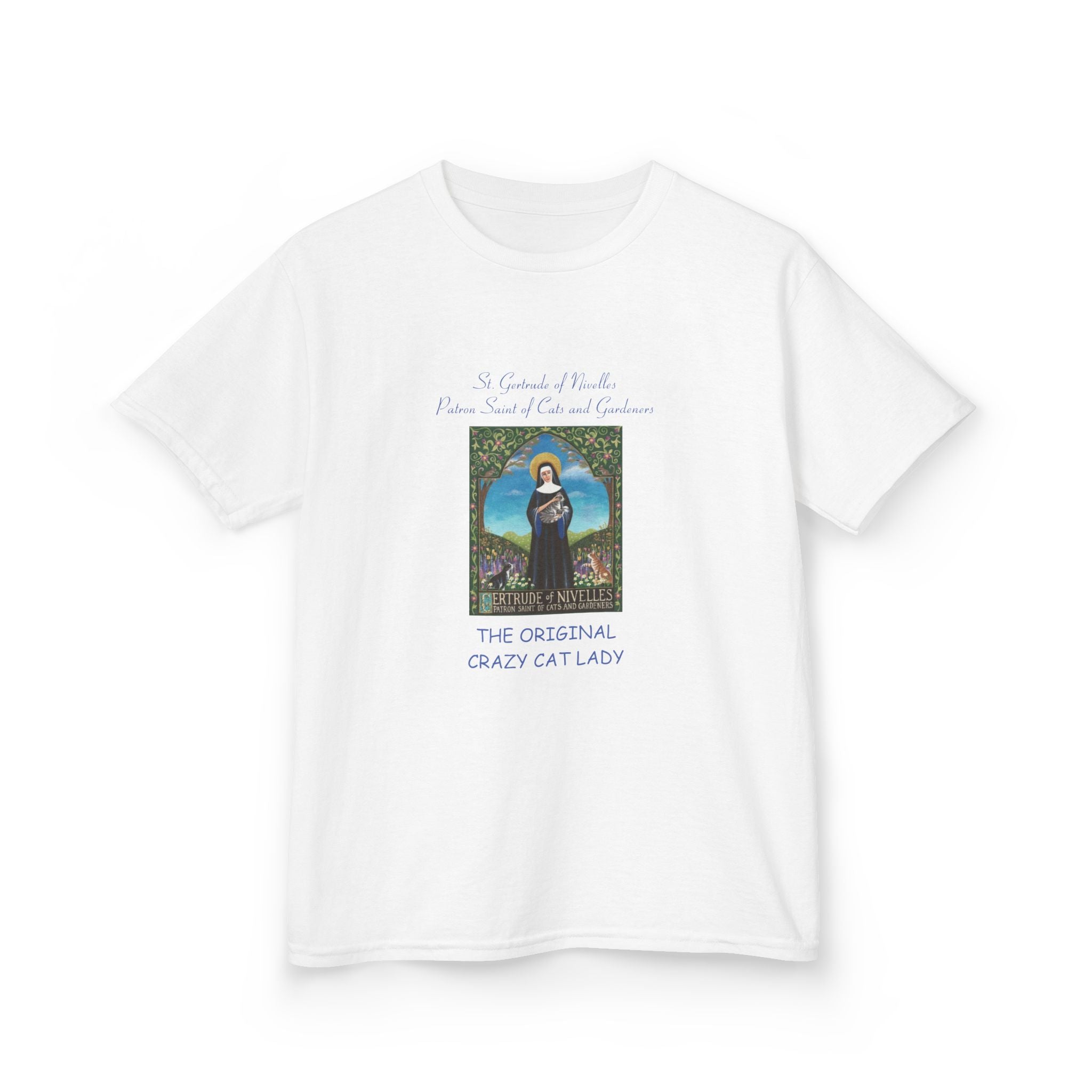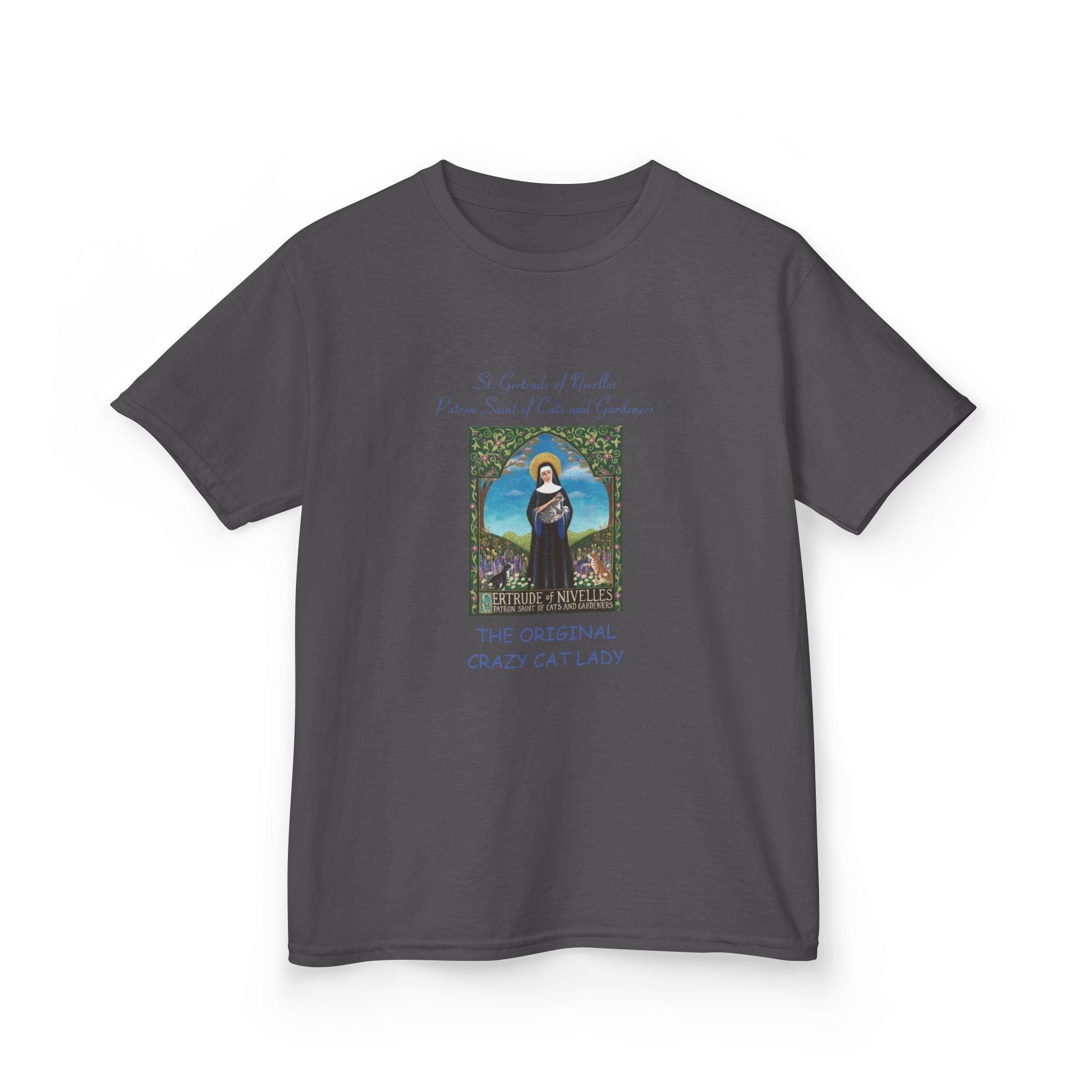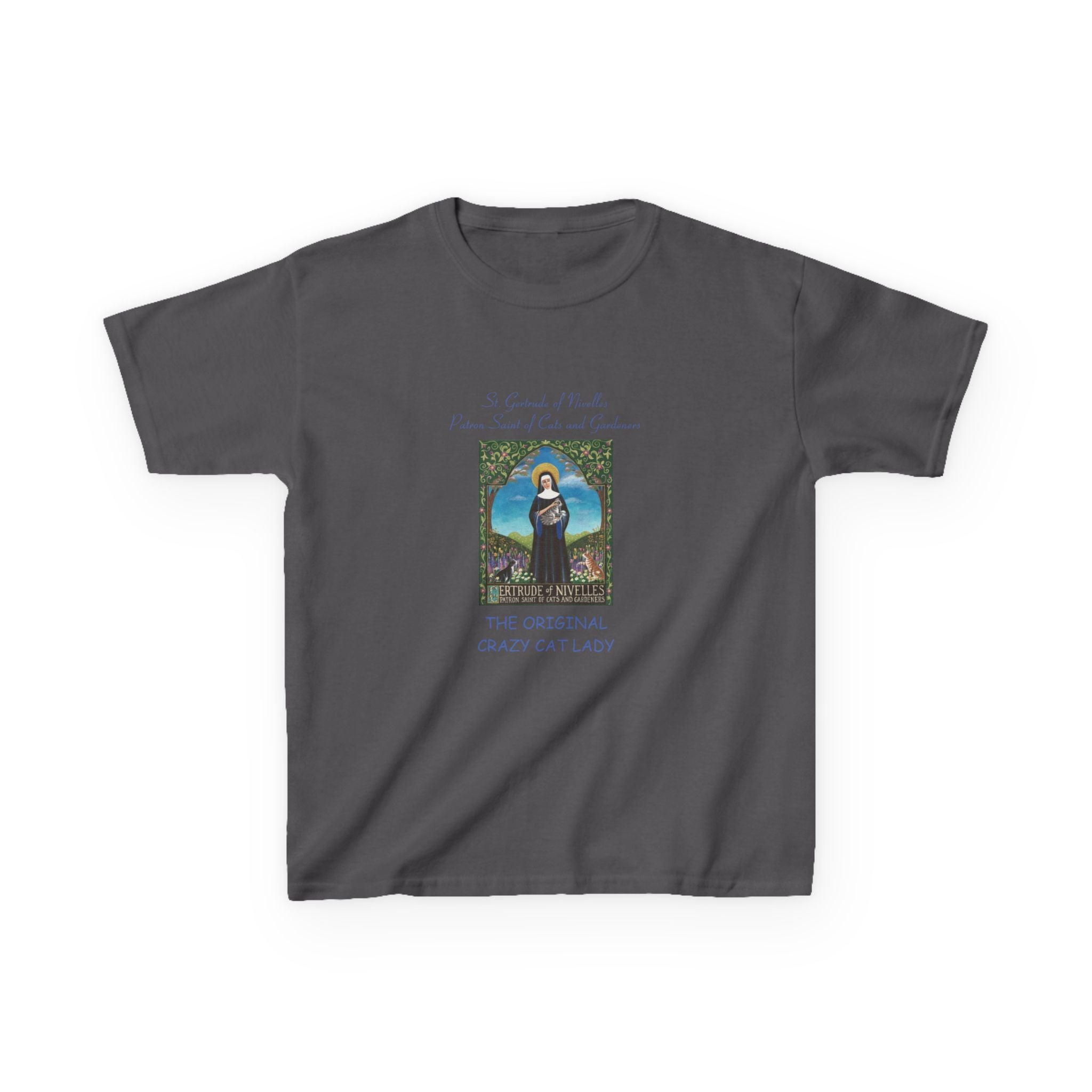 Celebrate tradition and whimsy with this exclusive Kids Heavy Cotton™ Tee designed by Judith Ann Dykeman (JAD). Featuring St. Gertrude of Nivelles, the cherished Patron Saint of Cats and Gardeners, this tee blends timeless artistry with a playful twist. The caption, 'St. Gertrude of Nivelles, Patron Saint of Cats and Gardeners. The Original Crazy Cat Lady,' adds charm and humor, making it perfect for young wearers who love to express their personalities. Crafted from ethically sourced US cotton, this tee ensures comfort and durability for everyday adventures or special occasions.