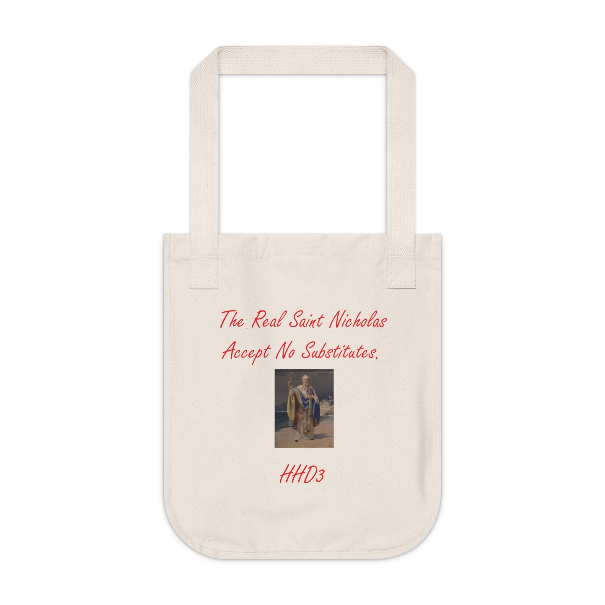 Carry the Legacy of St. Nicholas with Style This Organic Canvas Tote Bag features an original design by Herbie Dykeman (HHD3) that celebrates the timeless charm of St. Nicholas. The artwork showcases a captivating image of St. Nicholas, paired with the playful phrase, “The real St. Nicholas, Accept no substitutes.” As the historical inspiration behind Santa Claus and the patron saint of children, St. Nicholas brings a touch of tradition and whimsy to this eco-friendly tote. Made from 100% certified organic cotton, it’s both sustainable and stylish—perfect for trips to the farmer’s market, casual outings, or festive gatherings. With its spacious interior and sturdy design, this tote is as practical as it is meaningful, making it an ideal gift for holidays, birthdays, or anyone who appreciates artistry with a touch of history.