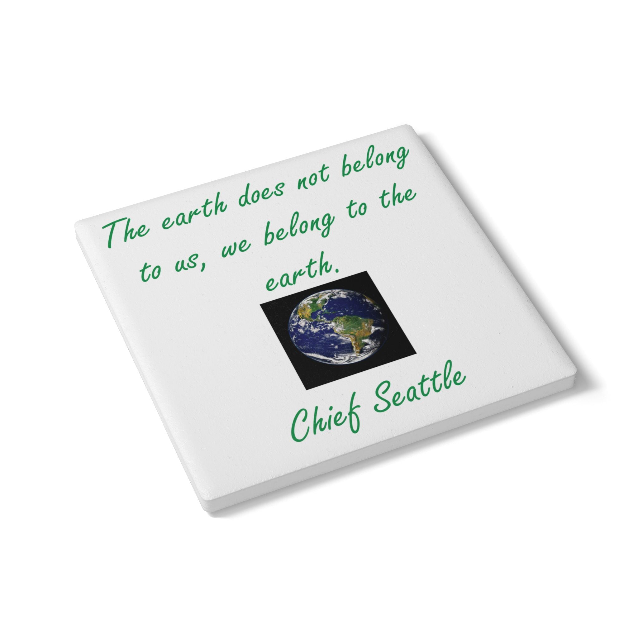 Celebrate our connection to the Earth with this stunning Ceramic Coaster, featuring the profound words of Chief Seattle: "The earth does not belong to us; we belong to the earth." Paired with a breathtaking image of our planet from space, this design serves as a powerful reminder of our shared responsibility and reverence for nature. Crafted from premium white ceramic, this coaster seamlessly combines style and practicality, protecting surfaces while inspiring reflection. Its durable construction and non-slip cork backing ensure stability, making it perfect for both hot and cold beverages. Ideal for nature lovers, environmental advocates, or anyone who appreciates indigenous wisdom, this coaster is a thoughtful addition to any home or workspace. Whether as a gift or a personal reminder, it invites meaningful conversations and deeper appreciation for the world we call home.