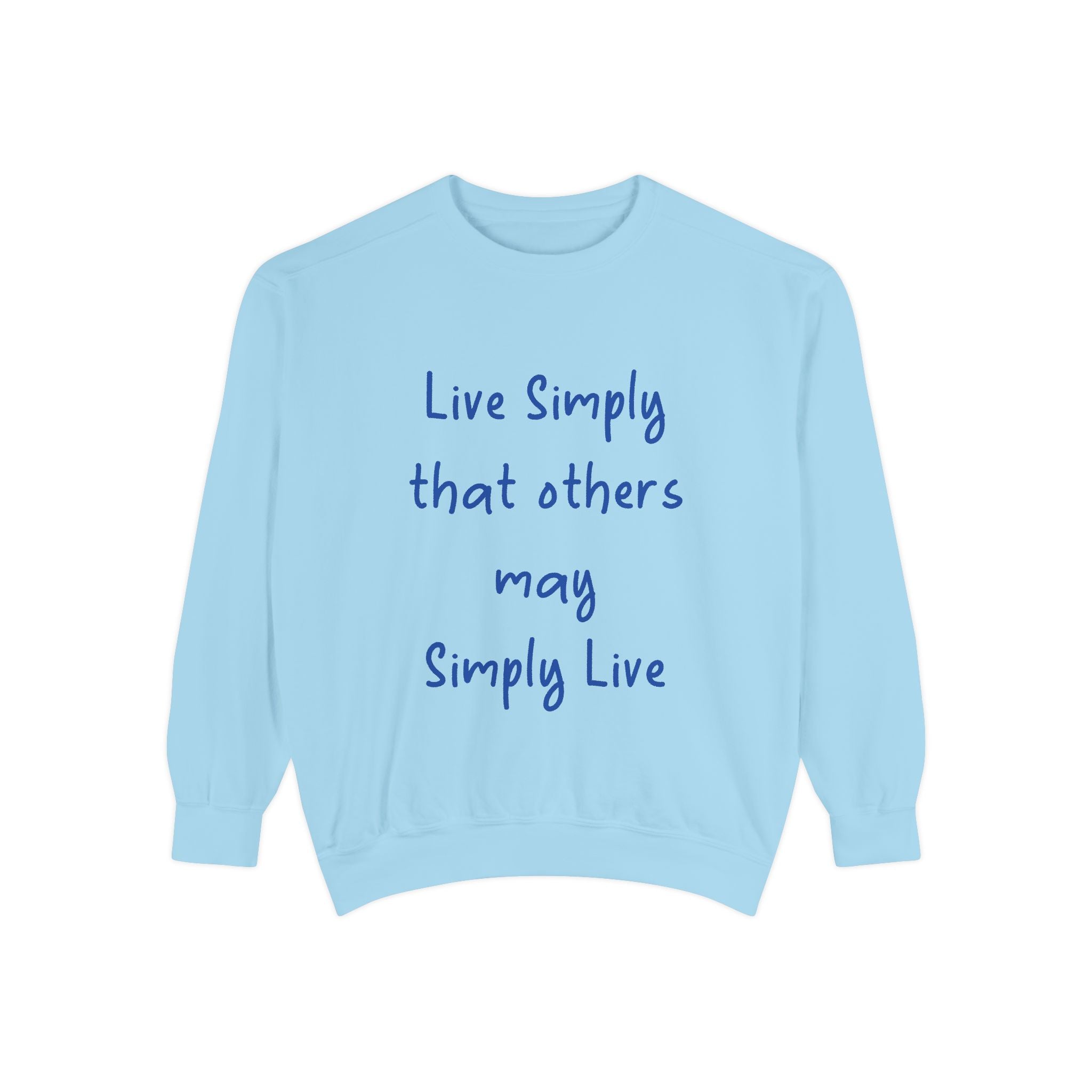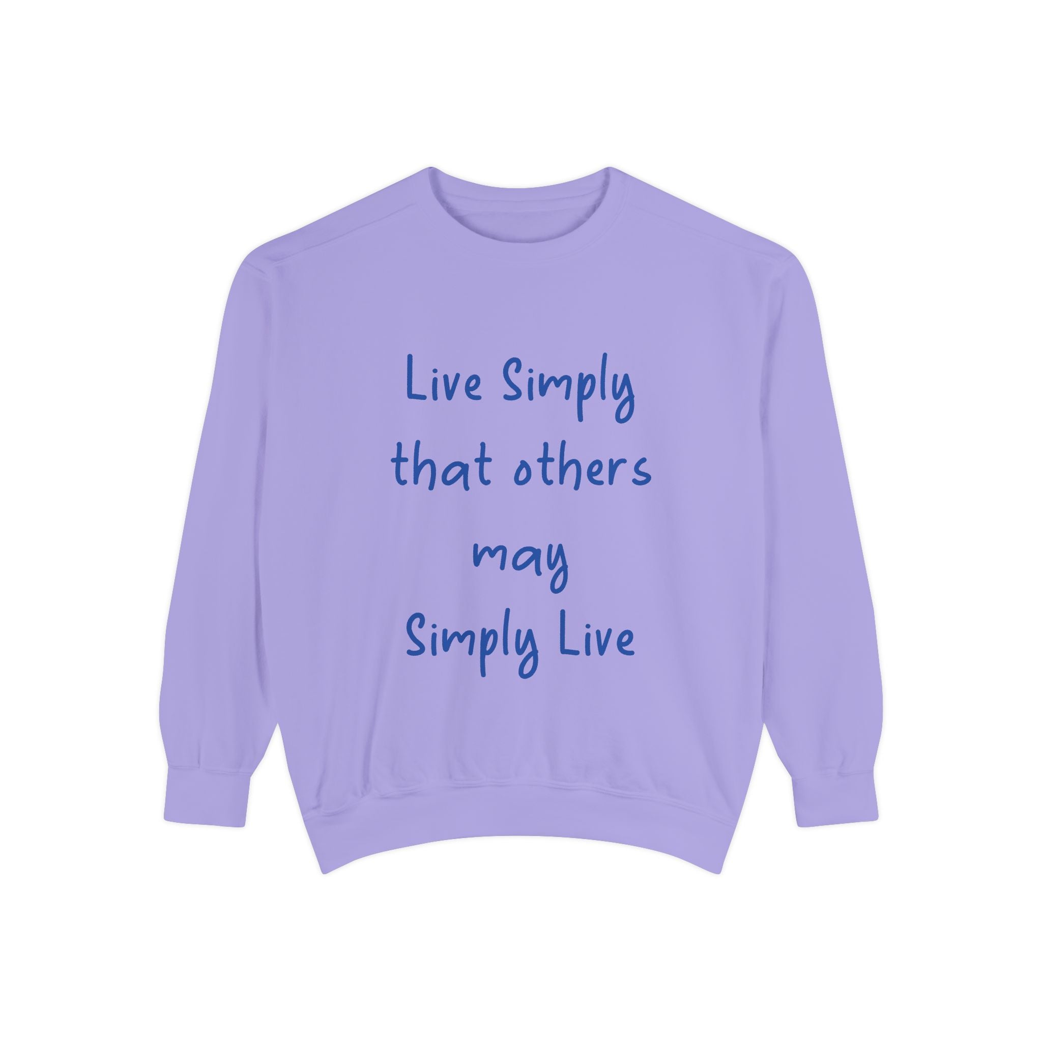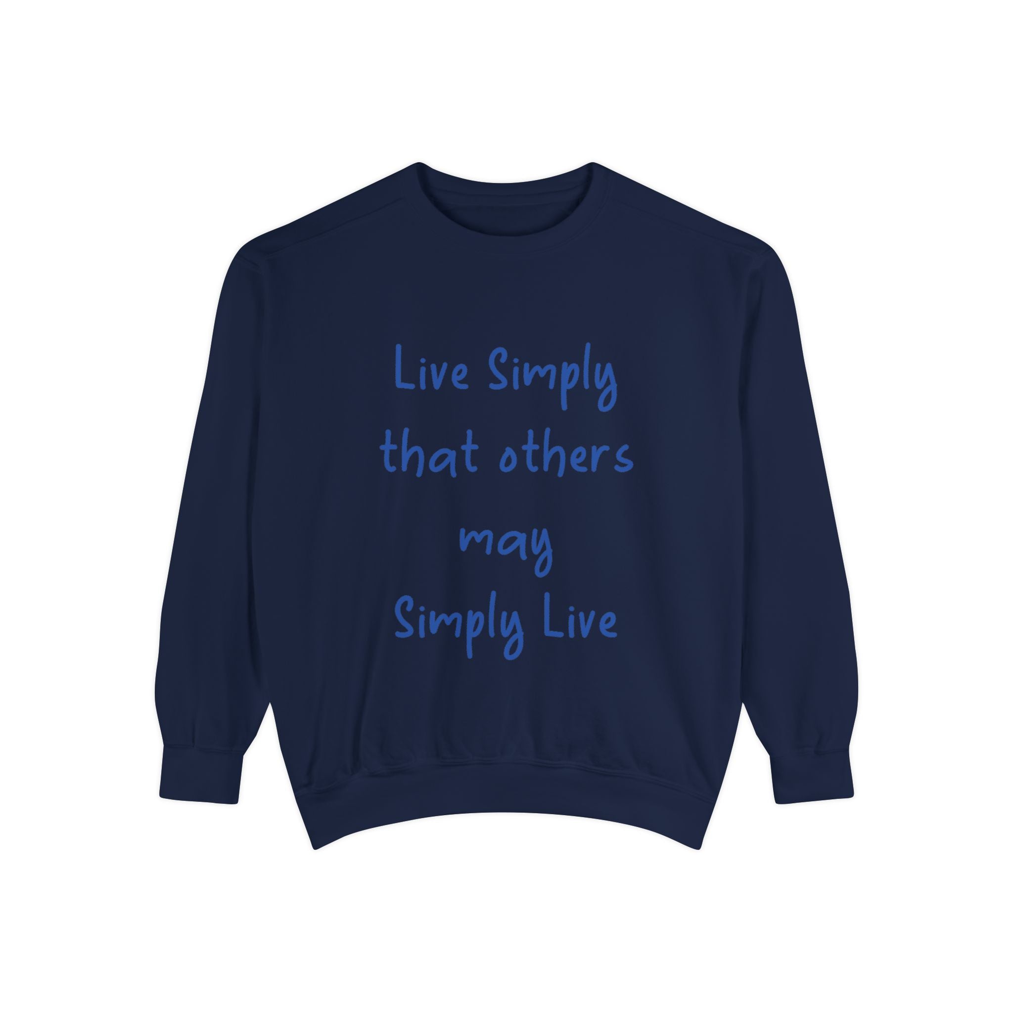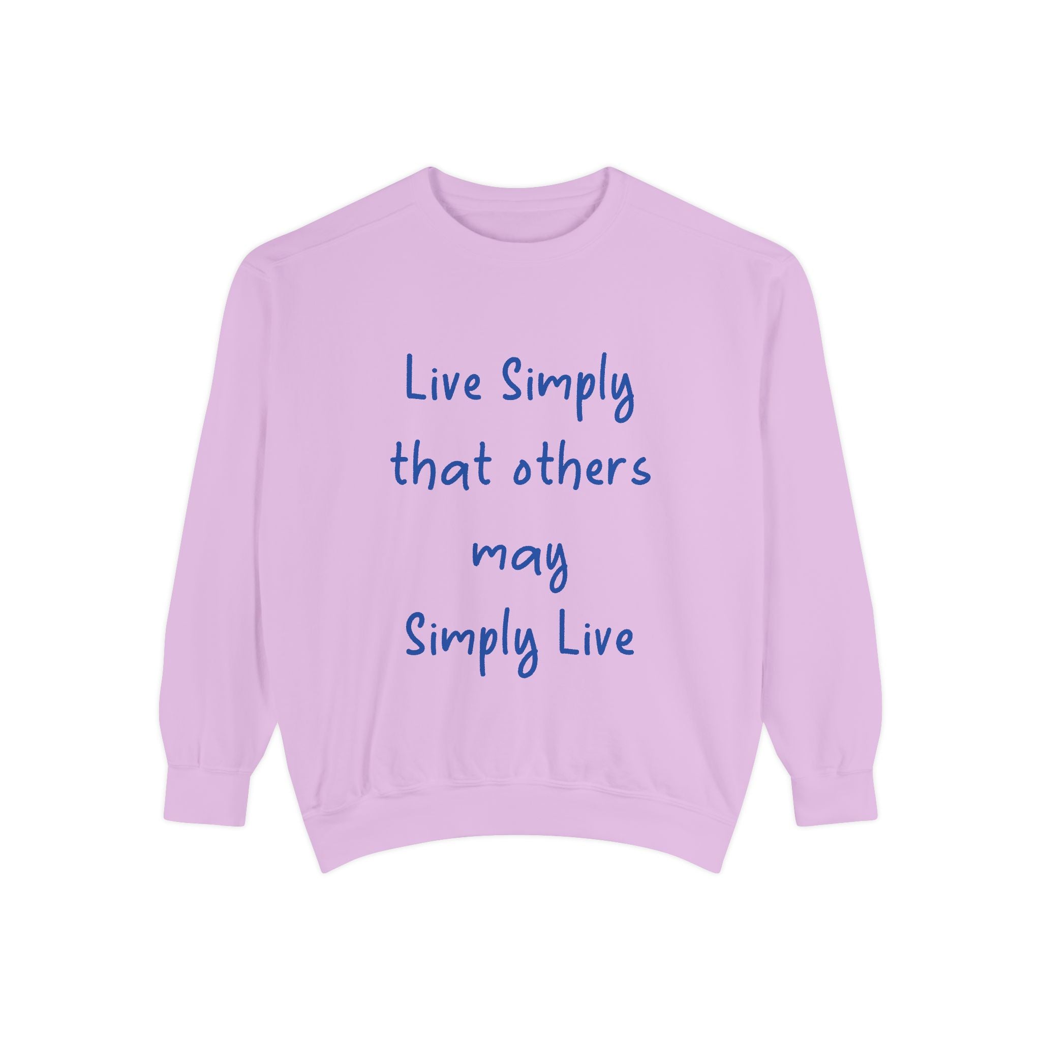 Embrace comfort and style with this Unisex Garment-Dyed Sweatshirt. Crafted from a luxurious blend of 80% cotton and 20% polyester, it offers a soft, cozy feel that’s perfect for any casual outing. Whether you're lounging at home or hitting the streets, this relaxed fit sweatshirt seamlessly fits into your wardrobe. The charming quote, "Live Simply that others may Simply Live," adds a touch of inspiration to your day, making it a great conversation starter. It's perfect for anyone who loves a laid-back aesthetic, ideal for gifting during holidays like Christmas, Birthdays, or even as a thoughtful gesture for Earth Day. Celebrate life's simple pleasures and promote a mindful lifestyle with this beautiful addition to your collection.