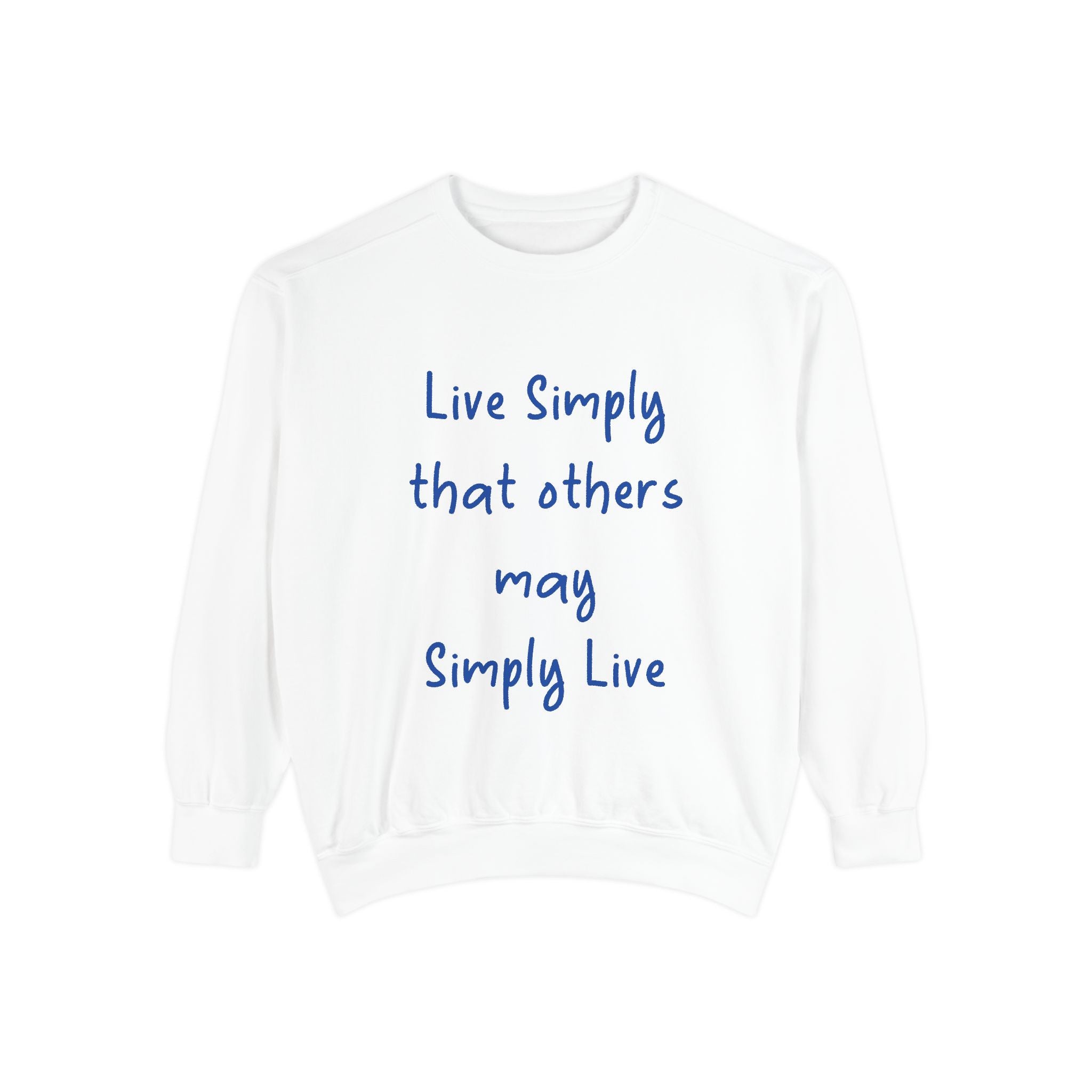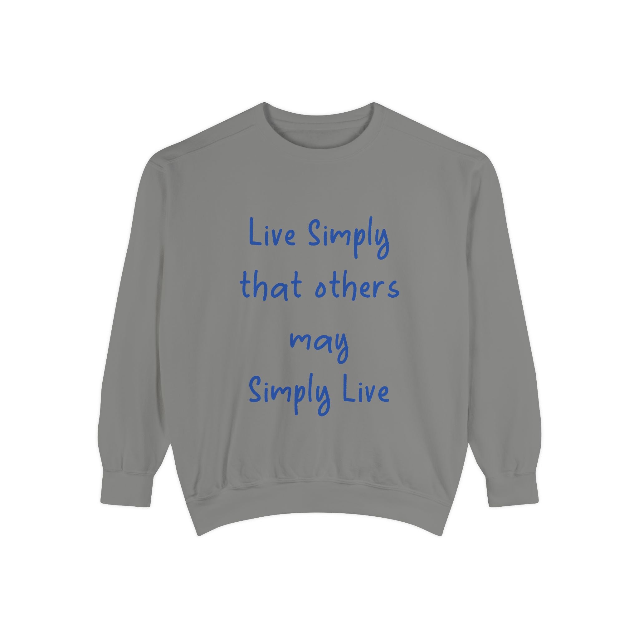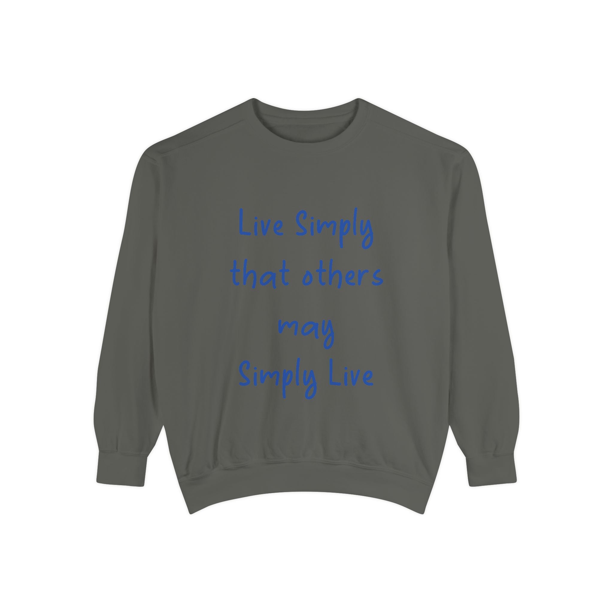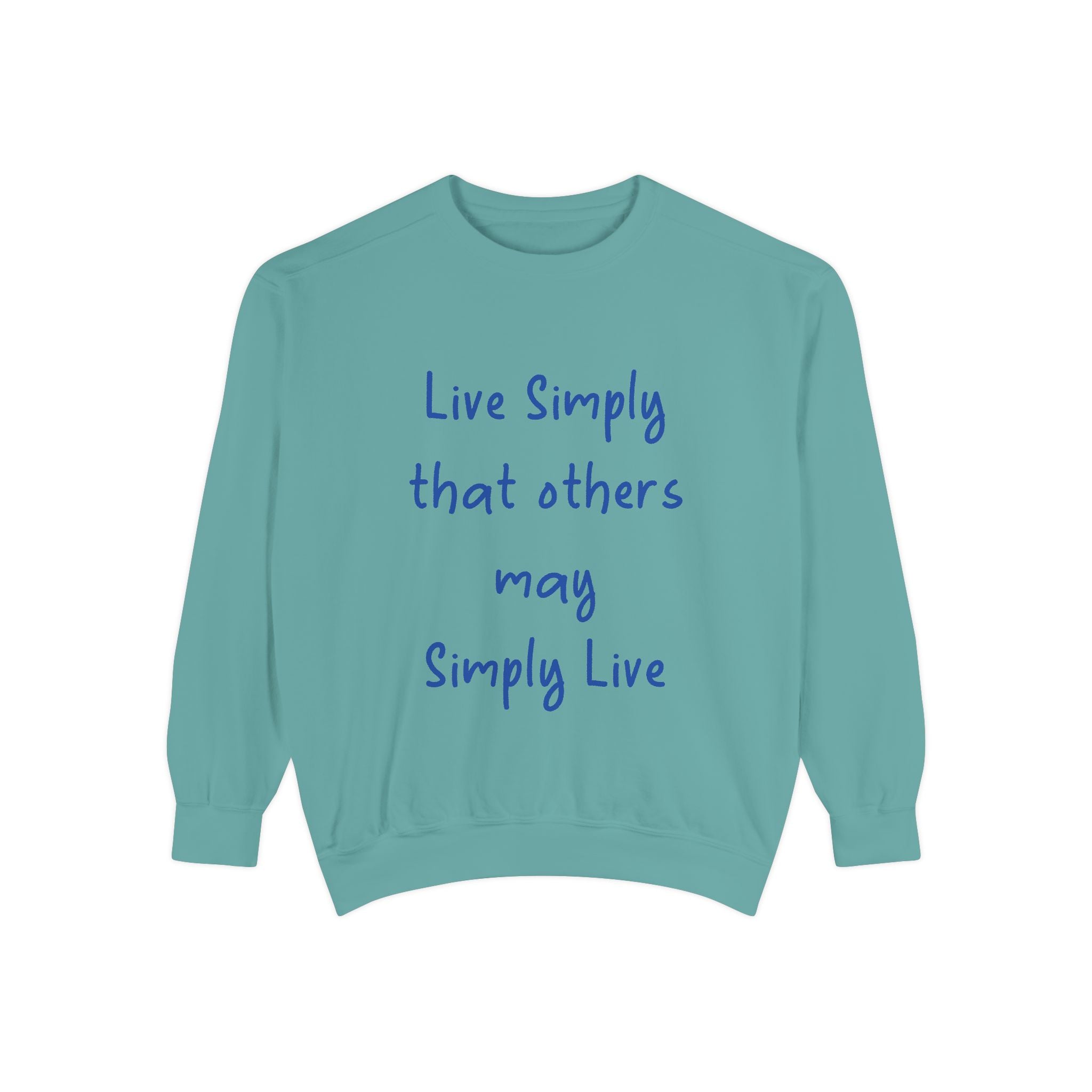Embrace comfort and style with this Unisex Garment-Dyed Sweatshirt. Crafted from a luxurious blend of 80% cotton and 20% polyester, it offers a soft, cozy feel that’s perfect for any casual outing. Whether you're lounging at home or hitting the streets, this relaxed fit sweatshirt seamlessly fits into your wardrobe. The charming quote, "Live Simply that others may Simply Live," adds a touch of inspiration to your day, making it a great conversation starter. It's perfect for anyone who loves a laid-back aesthetic, ideal for gifting during holidays like Christmas, Birthdays, or even as a thoughtful gesture for Earth Day. Celebrate life's simple pleasures and promote a mindful lifestyle with this beautiful addition to your collection.