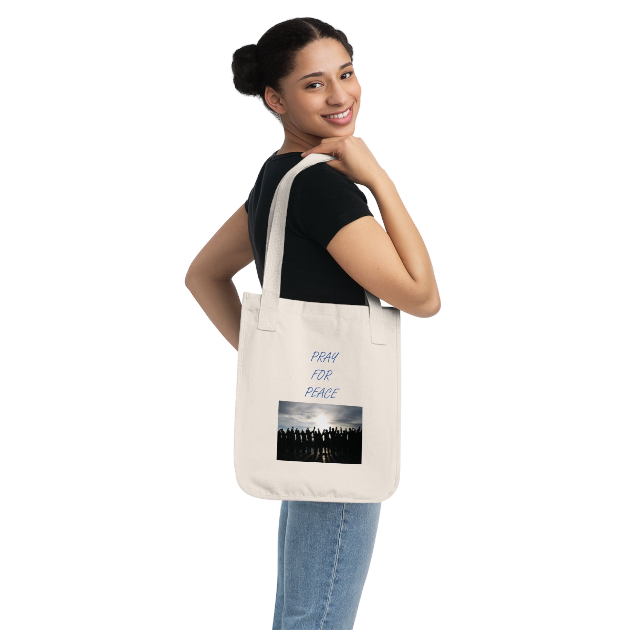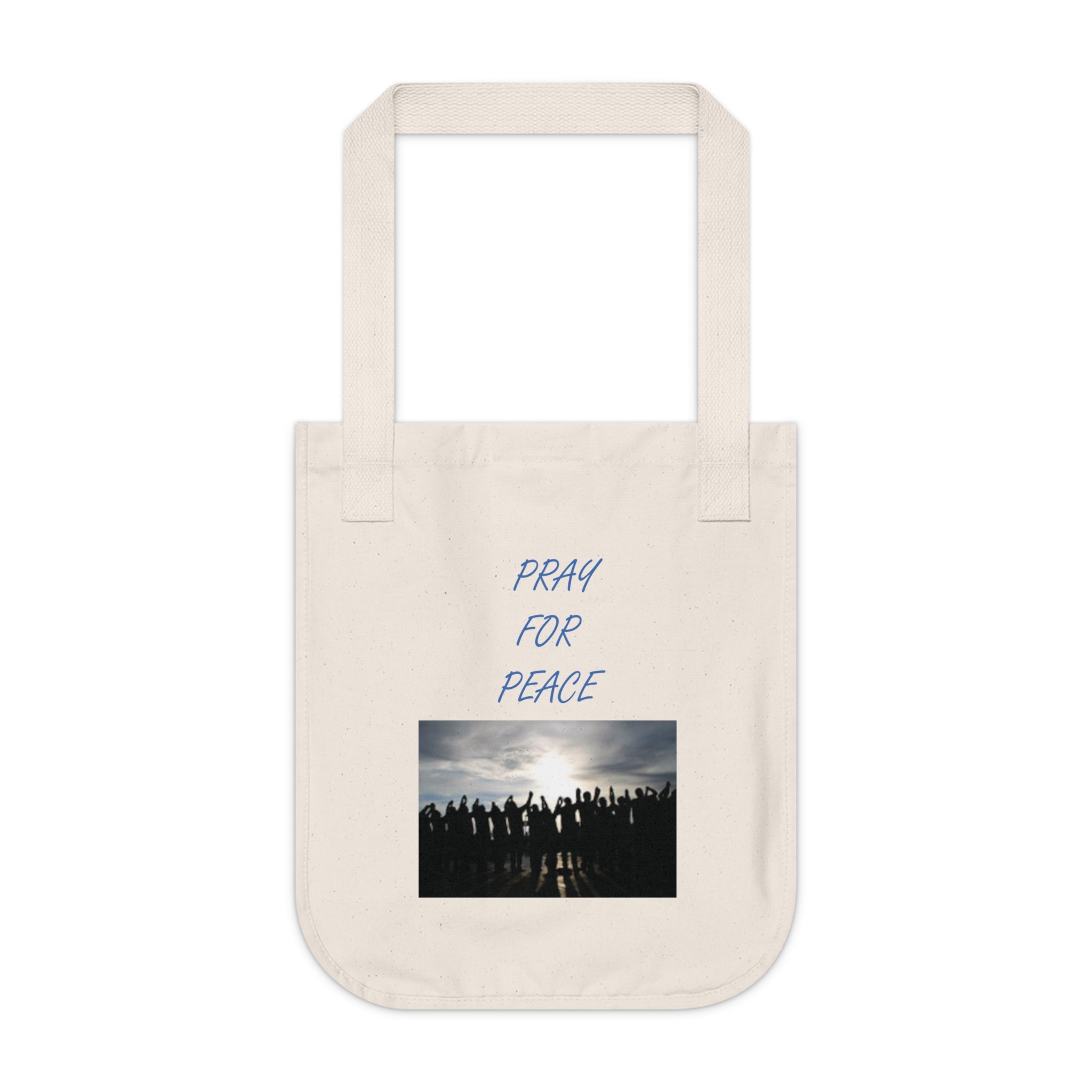 Carry a message of hope and unity with this Organic Canvas Tote Bag, featuring the inspiring design: "Pray for Peace." The artwork portrays a group of individuals standing together, arms uplifted toward a radiant rising sun, symbolizing prayer, harmony, and solidarity. This tote is more than a bag—it’s a statement of peace and togetherness.