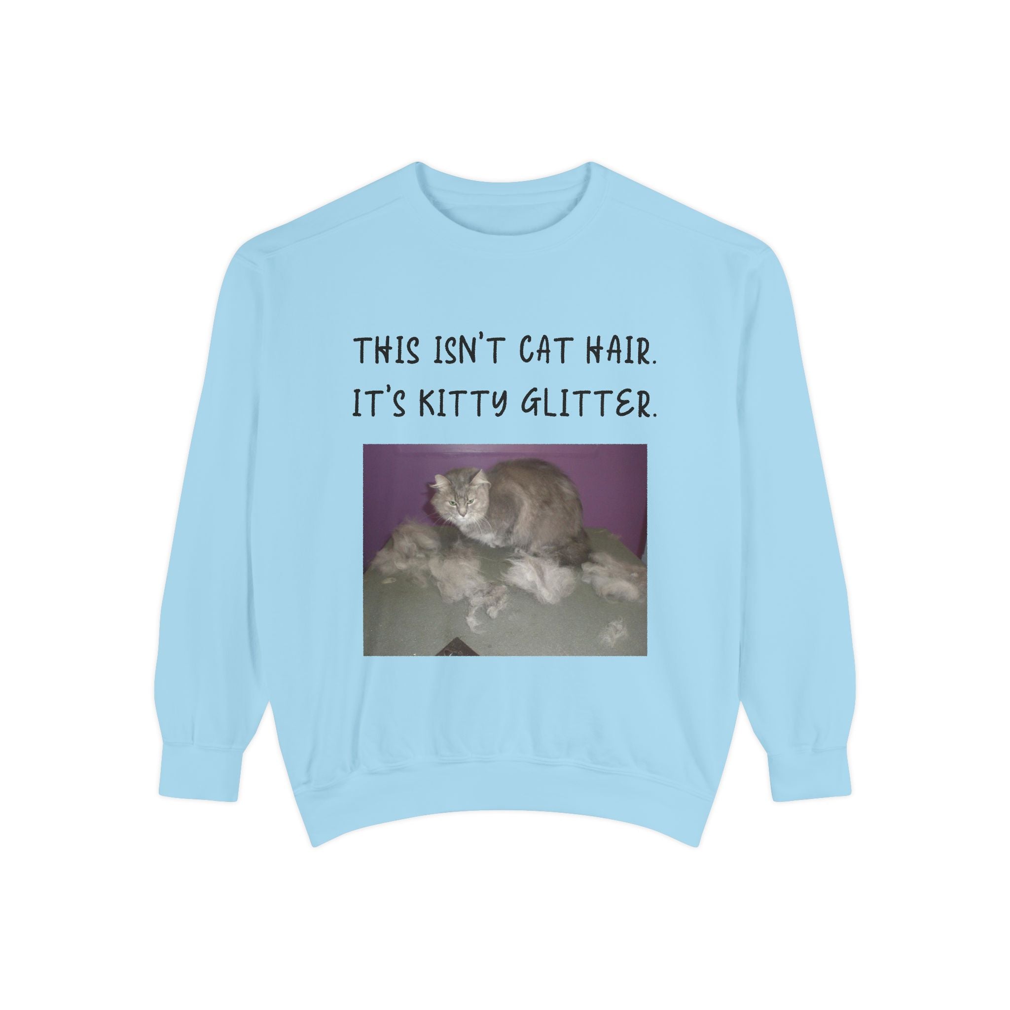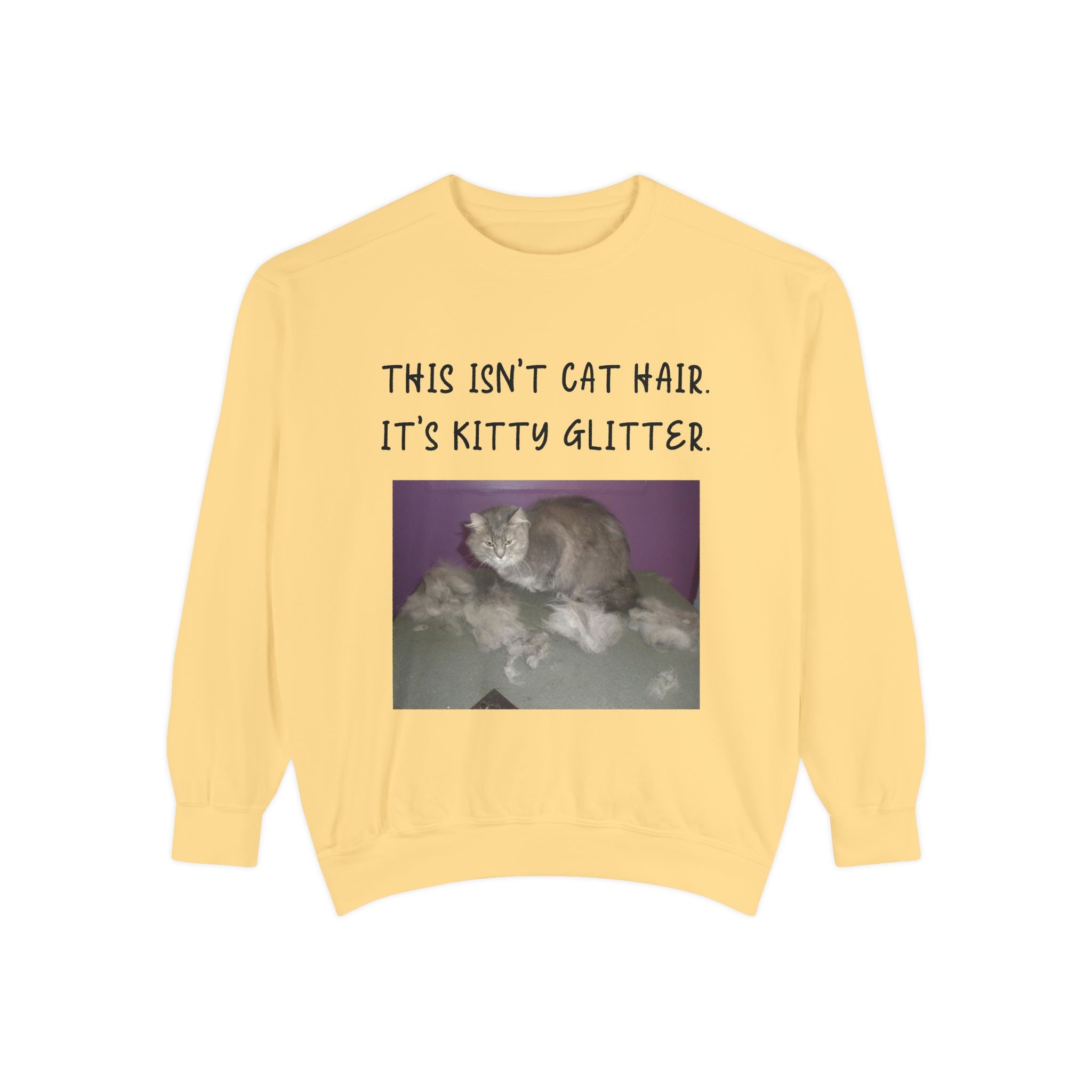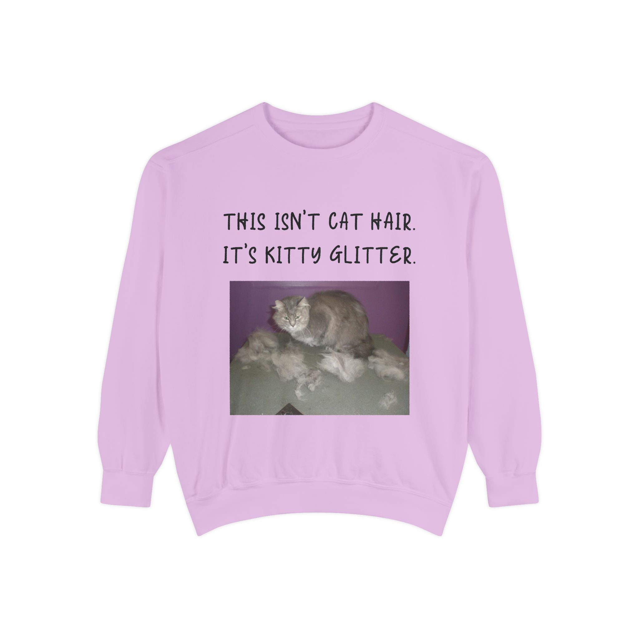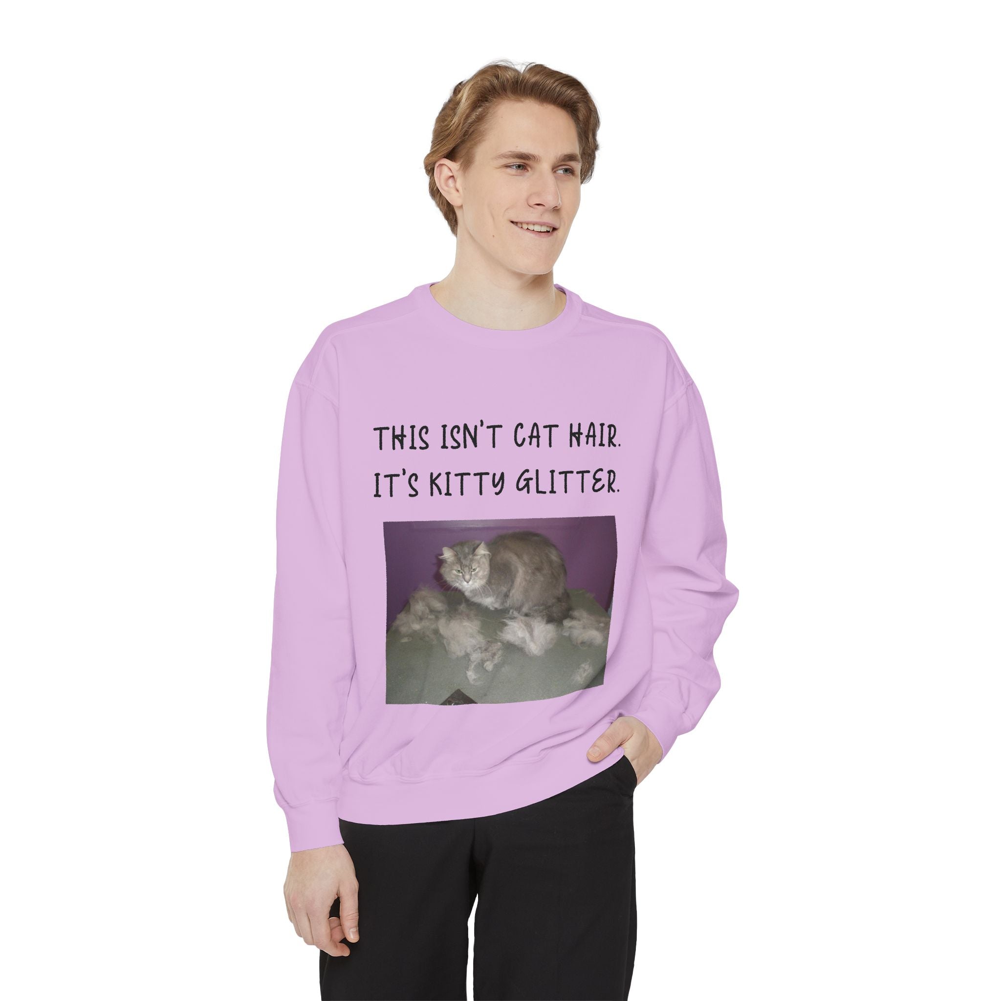 Introducing our cozy Unisex Garment-Dyed Sweatshirt, perfect for those who appreciate humor and comfort in their everyday wardrobe. This sweatshirt gives off a relaxed vibe, making it an ideal addition to weekend lounging or casual outings. The playful message, "This Isn't Cat Hair. It's Kitty Glitter," will surely resonate with cat lovers and pet owners, adding a touch of fun to any outfit. Whether it's a chilly day at home or a casual meetup with friends, this sweatshirt fits seamlessly into your life and style. It's a perfect gift for birthdays, holidays, or just because, suitable for anyone who enjoys a good laugh and a comfortable fit. Celebrate your love for pets with this cozy apparel during any occasion, making it a beloved staple for the season. Embrace the warmth and humor it brings!