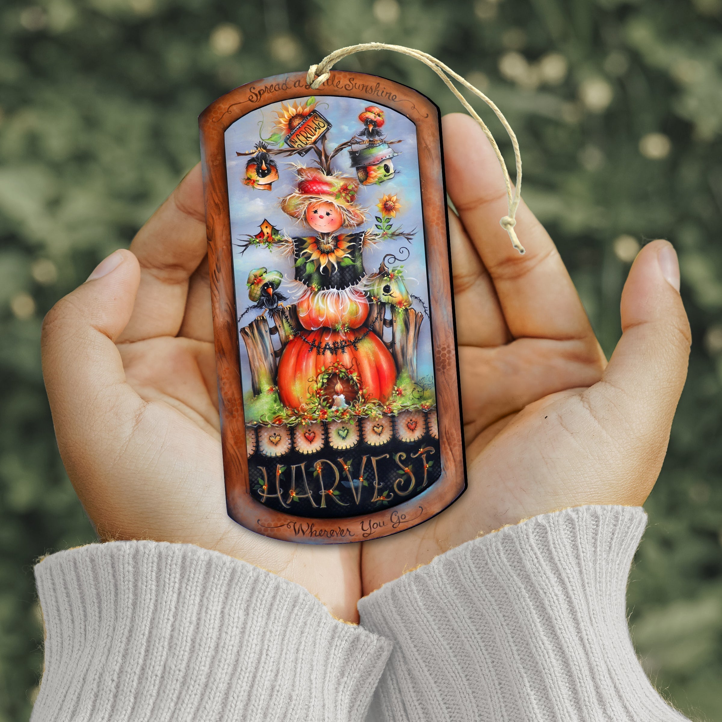 Handcrafted by J. Mills-Price, these Harvest Pumpkin Scarecrow Wooden Ornaments are the perfect addition to any Thanksgiving Decor. Crafted with precision and great attention to detail, you can be sure that these ornaments will bring out the best in your holiday display.