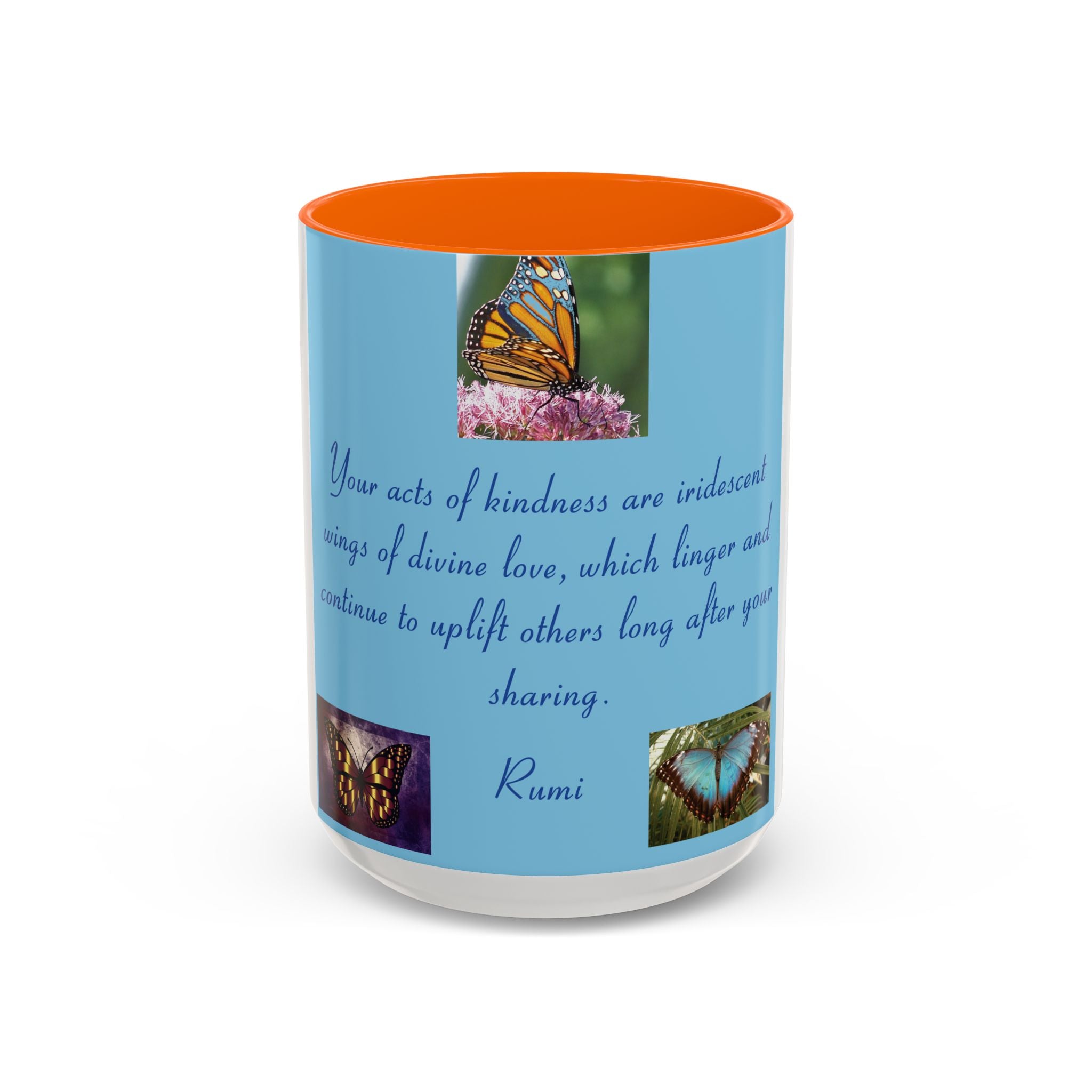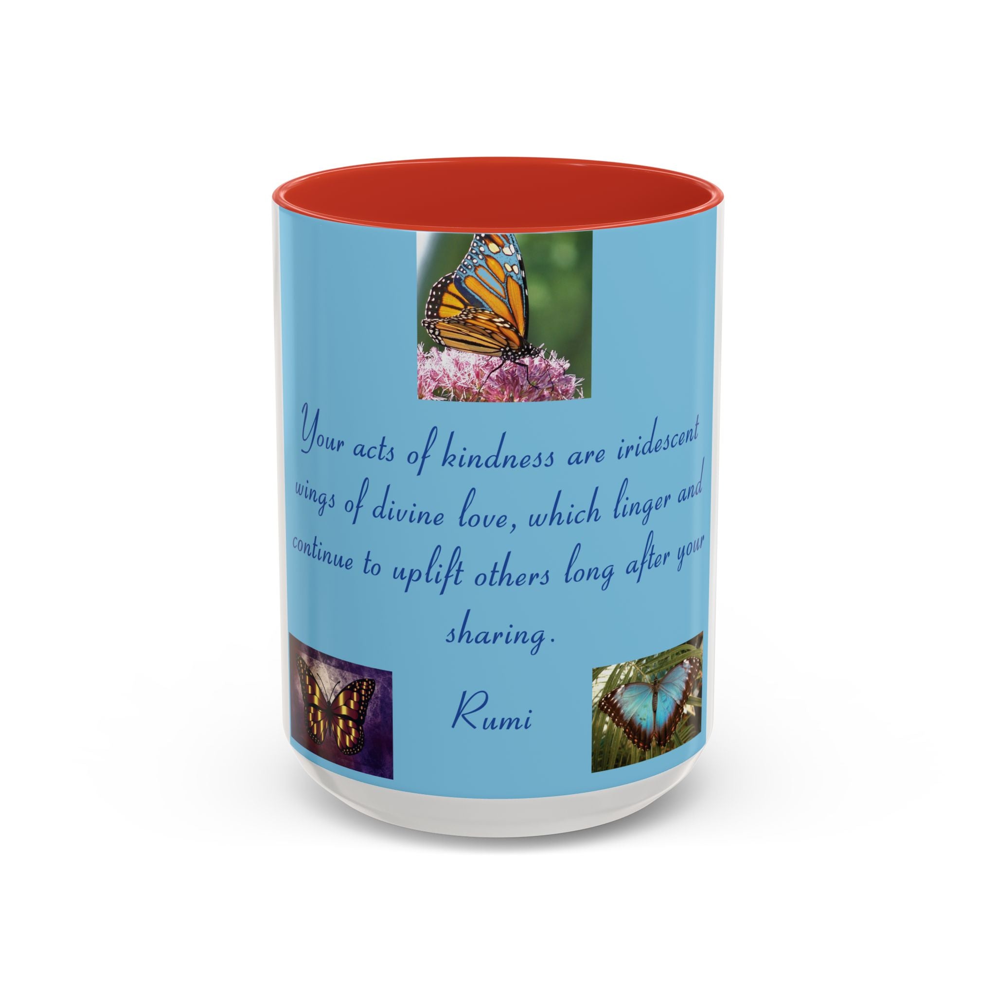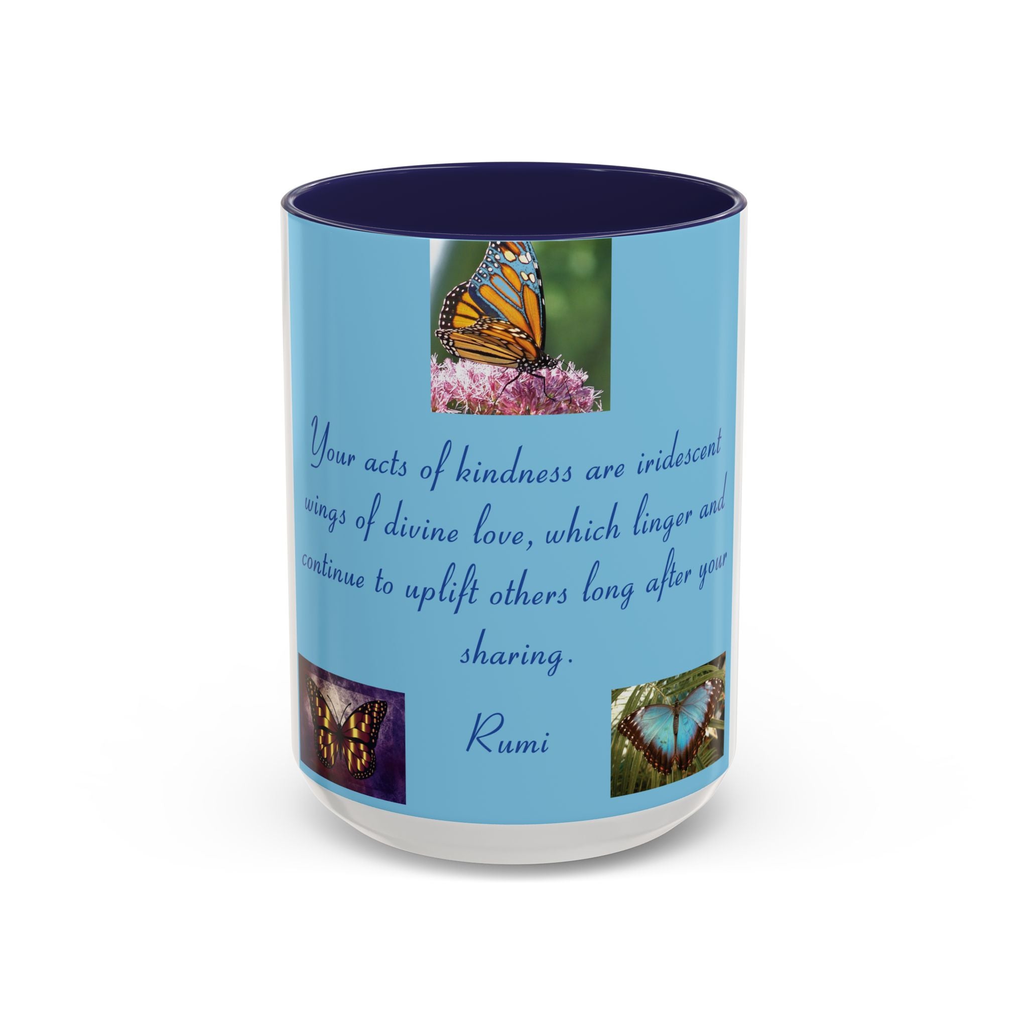 Add a touch of inspiration to your daily routine with this Accent Coffee Mug, featuring an uplifting quote by the renowned Sufi poet Rumi: 'Your acts of kindness are iridescent wings of divine love, which linger and continue to uplift others long after your sharing.' The elegant dark blue text stands out against a soothing sky-blue background, framed by three delicate butterflies that beautifully symbolize transformation, grace, and the enduring power of kindness.