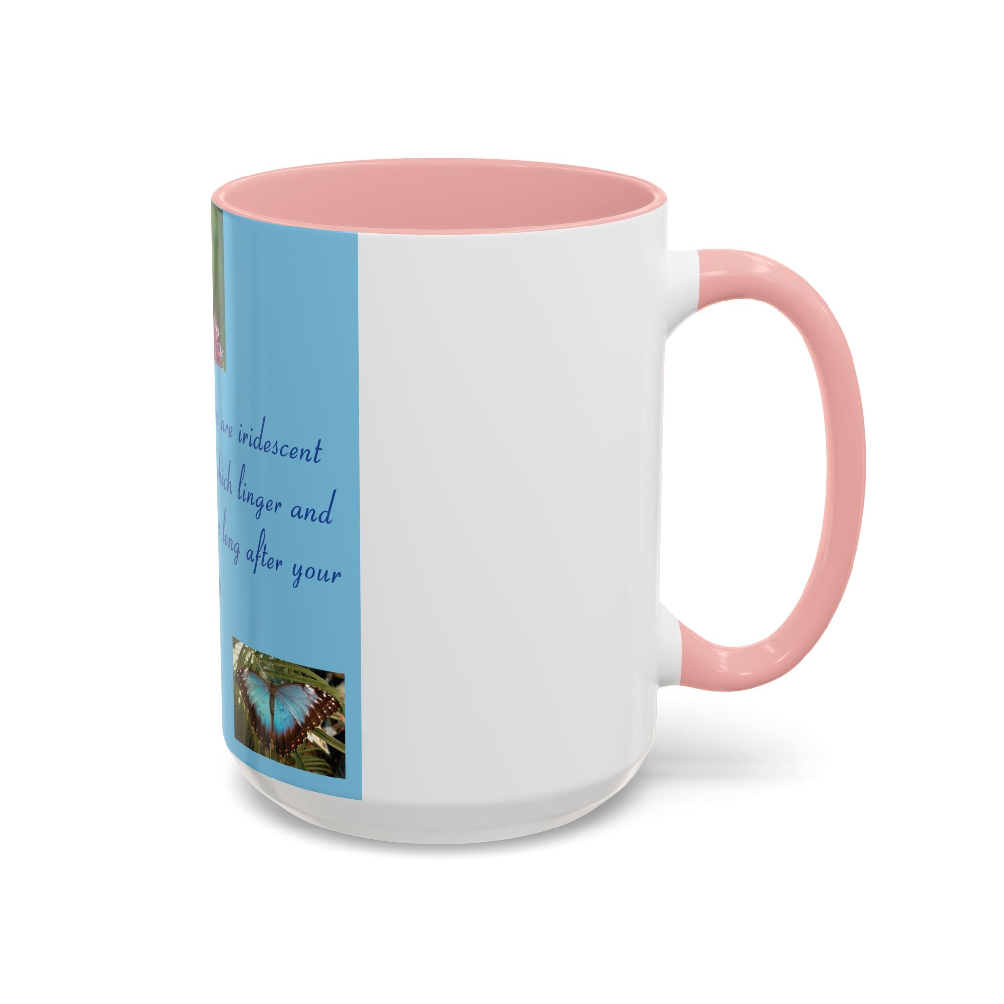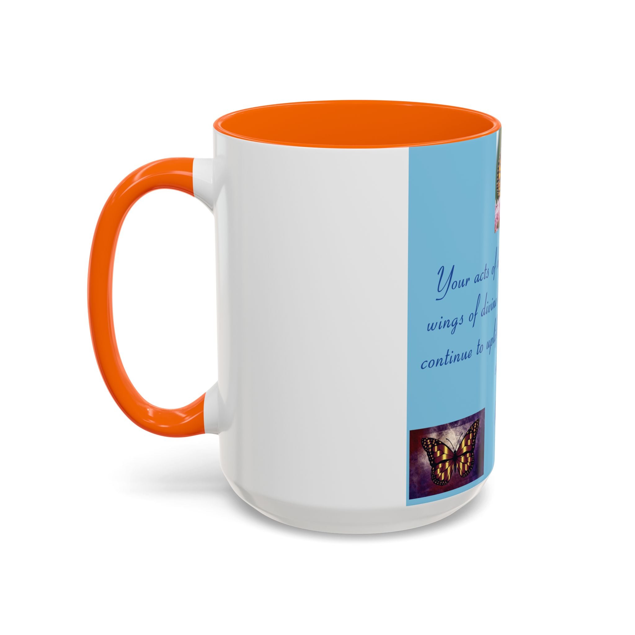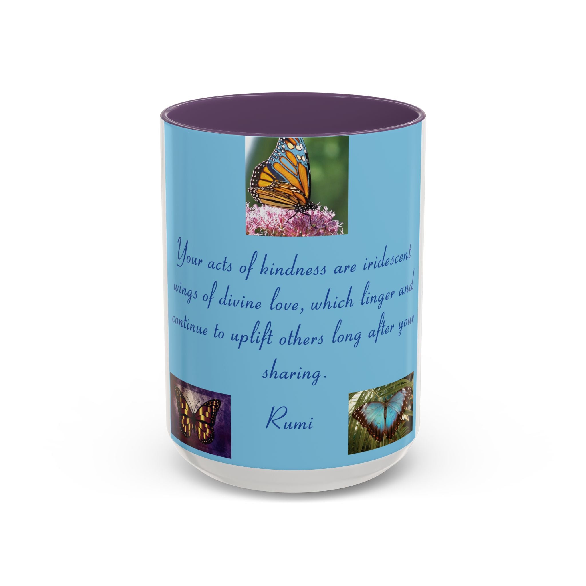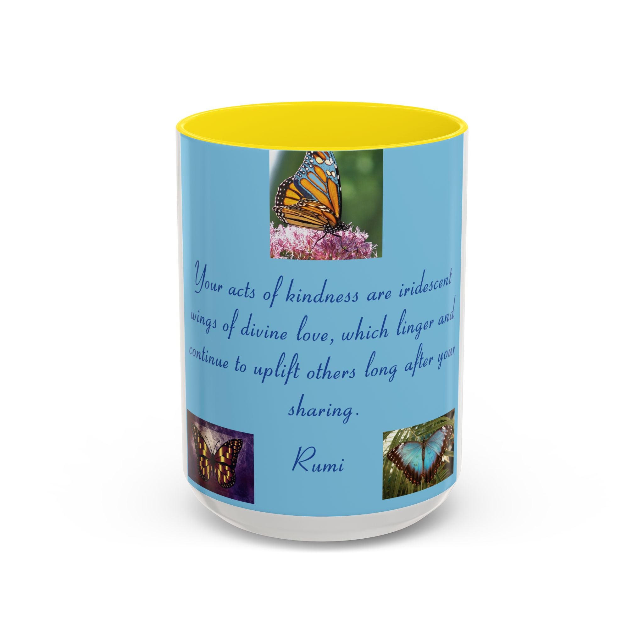 Add a touch of inspiration to your daily routine with this Accent Coffee Mug, featuring an uplifting quote by the renowned Sufi poet Rumi: 'Your acts of kindness are iridescent wings of divine love, which linger and continue to uplift others long after your sharing.' The elegant dark blue text stands out against a soothing sky-blue background, framed by three delicate butterflies that beautifully symbolize transformation, grace, and the enduring power of kindness.