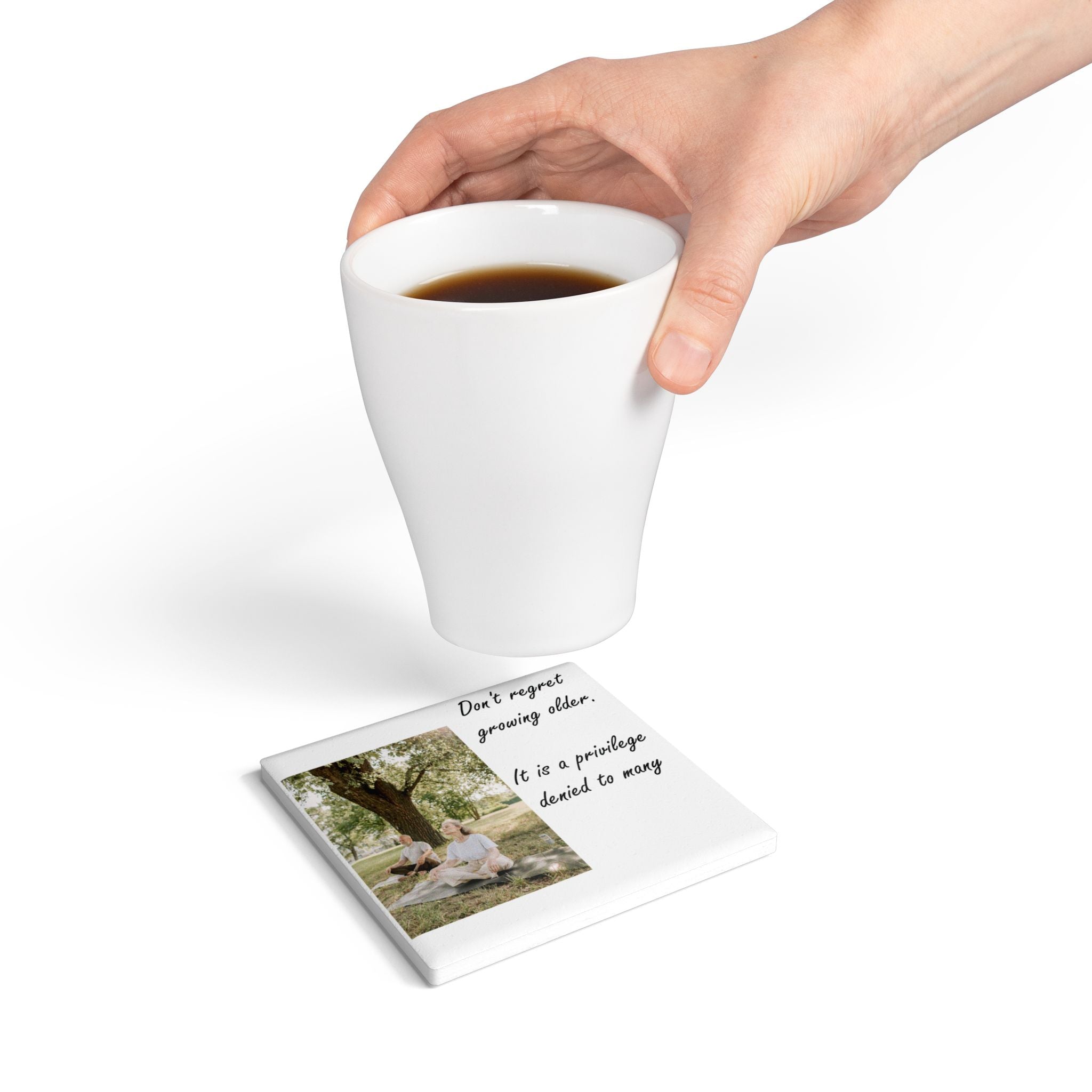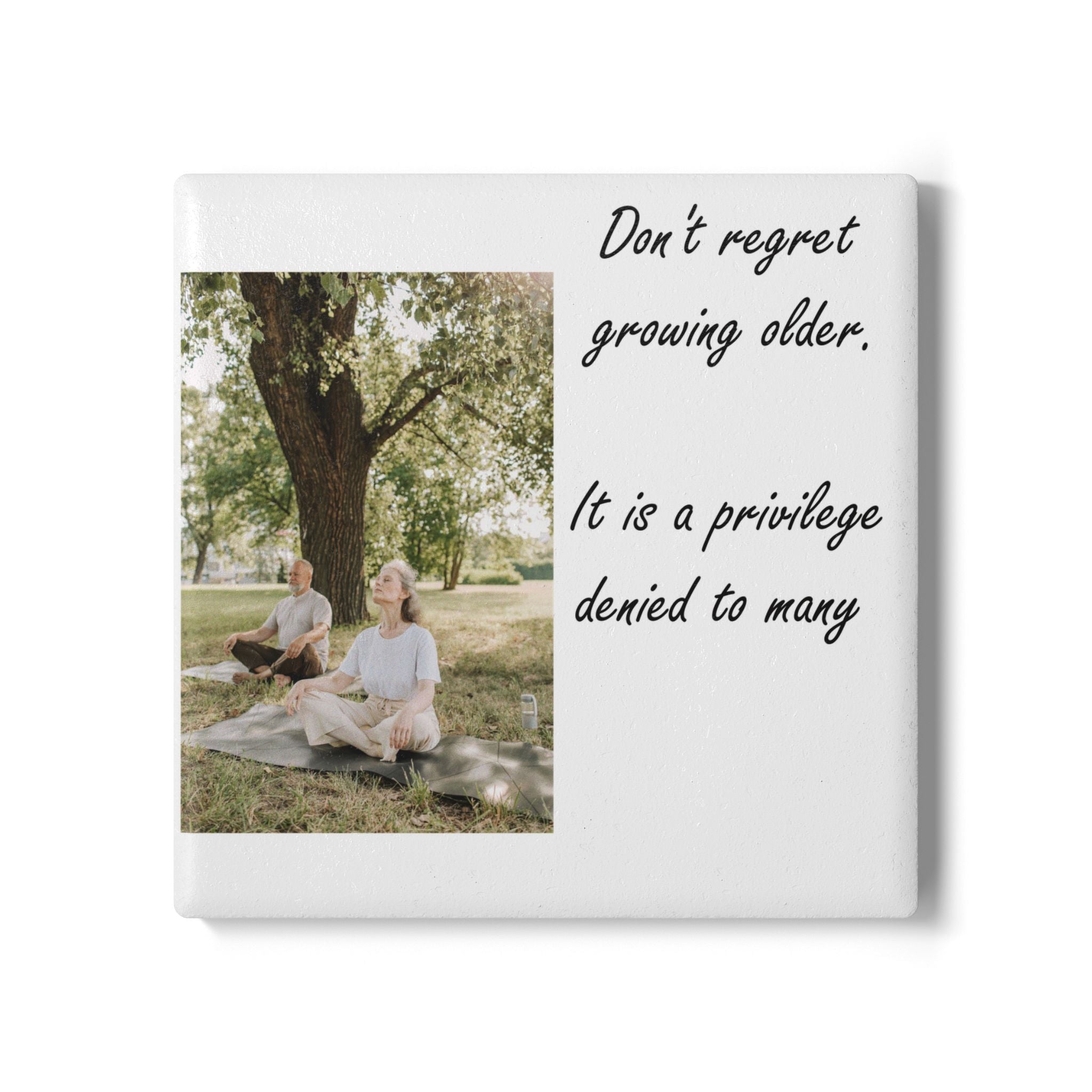 Celebrate the beauty of life's journey with this serene ceramic coaster, designed by Judith Ann Dykeman (JAD). Showcasing an inspiring scene of an older couple practicing yoga outdoors, radiating peace and vitality, this design is paired with the poignant quote: 'Don't regret growing older. It is a privilege denied to many.' This thoughtful piece serves as a gentle reminder to embrace aging with gratitude and grace.