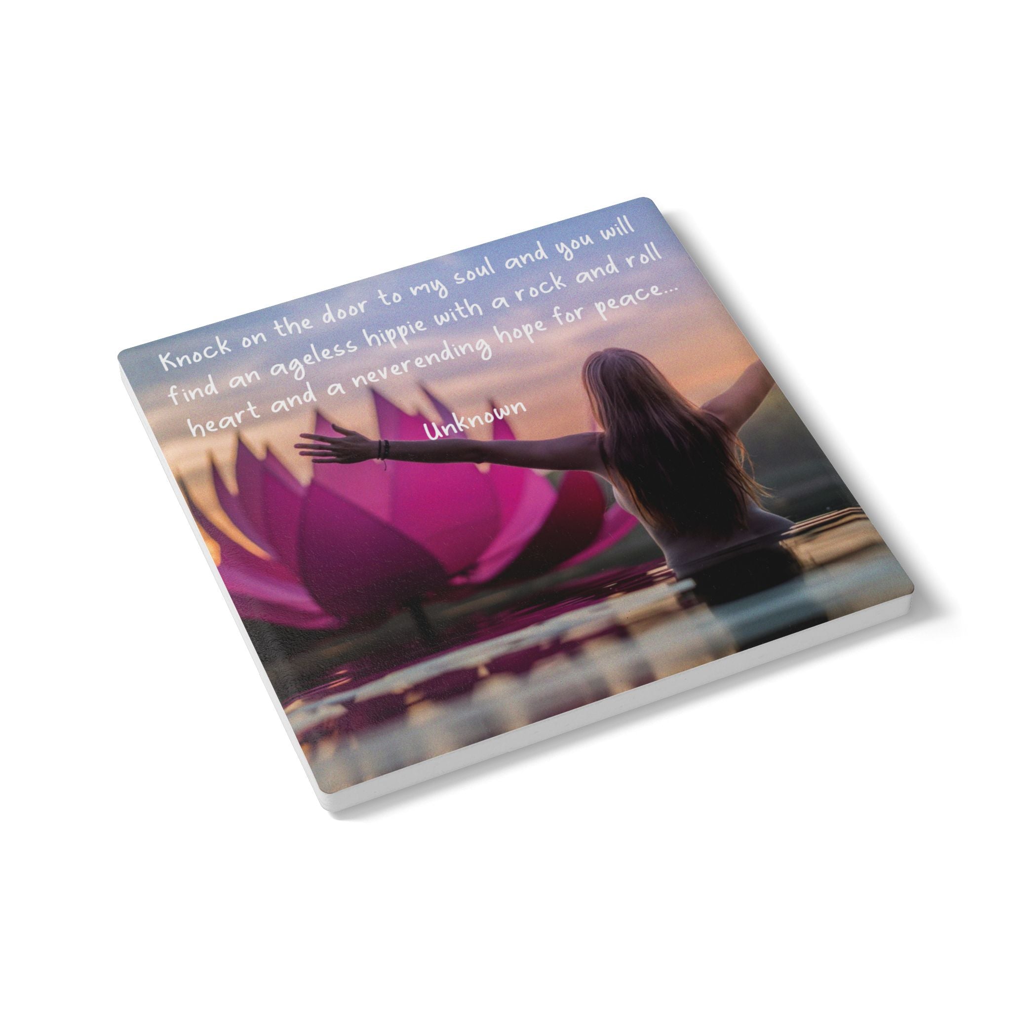 Transform your coffee table into a canvas of artistry and meaning with this elegant Ceramic Coaster, featuring a captivating design by Judith Ann Dykeman. This evocative artwork portrays a woman standing waist-deep in water, arms outstretched, facing a magnificent purple lotus in full bloom. Above her, the words read: 'Knock on the door to my soul, and you will find an ageless hippie with a rock and roll heart and a never-ending hope for peace.' The design captures the timeless spirit of freedom, resilience, and a deep desire for peace.