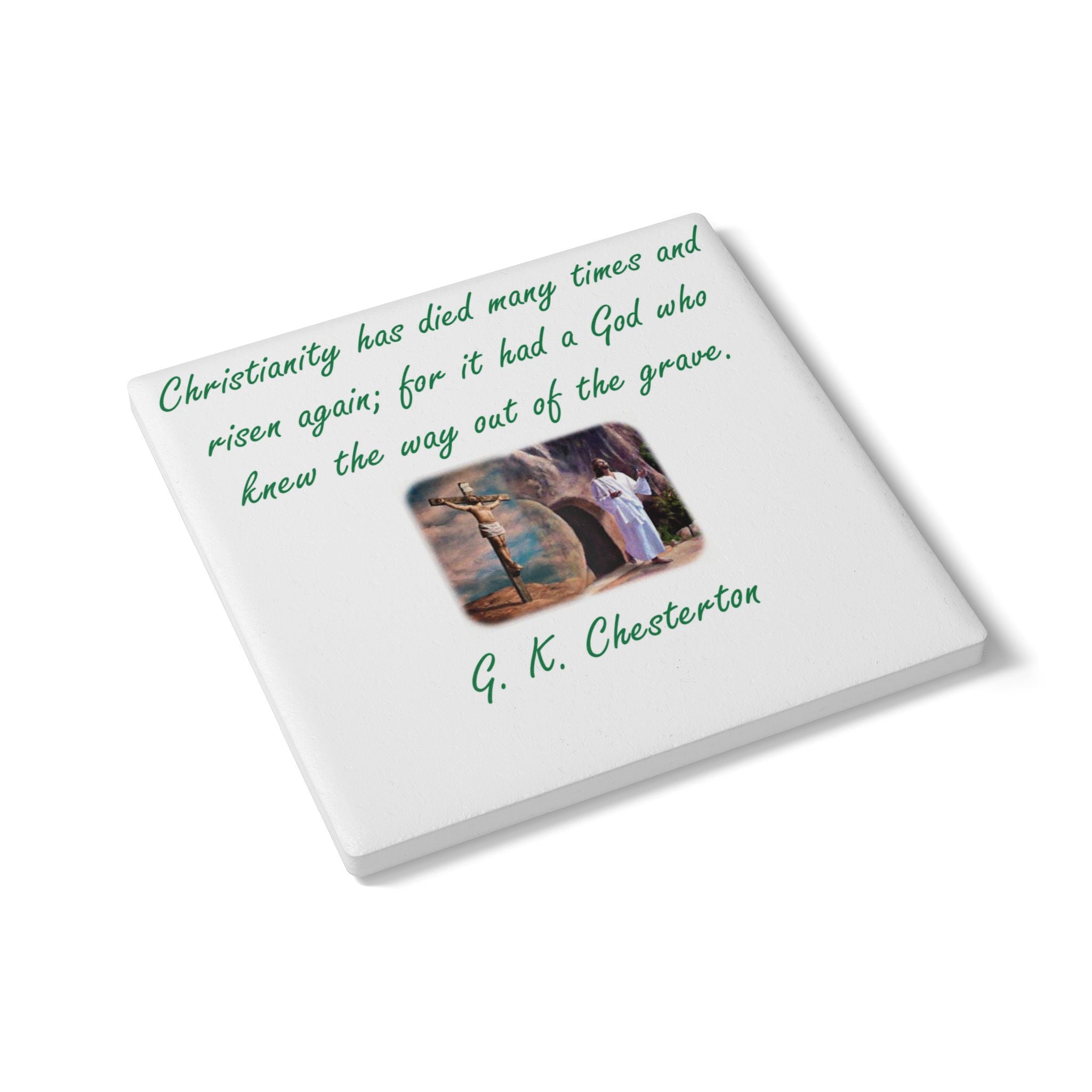 Celebrate the enduring hope and renewal at the heart of the Christian faith with this inspiring ceramic coaster set. Featuring an original design by Judith Ann Dykeman (JAD), the coasters showcase a powerful quote by G.K. Chesterton: 'Christianity has died many times and risen again; for it had a God who knew the way out of the grave.' The imagery beautifully complements the message, depicting both Jesus on the cross and His triumphant resurrection on Easter morning, making it a meaningful addition to any home.