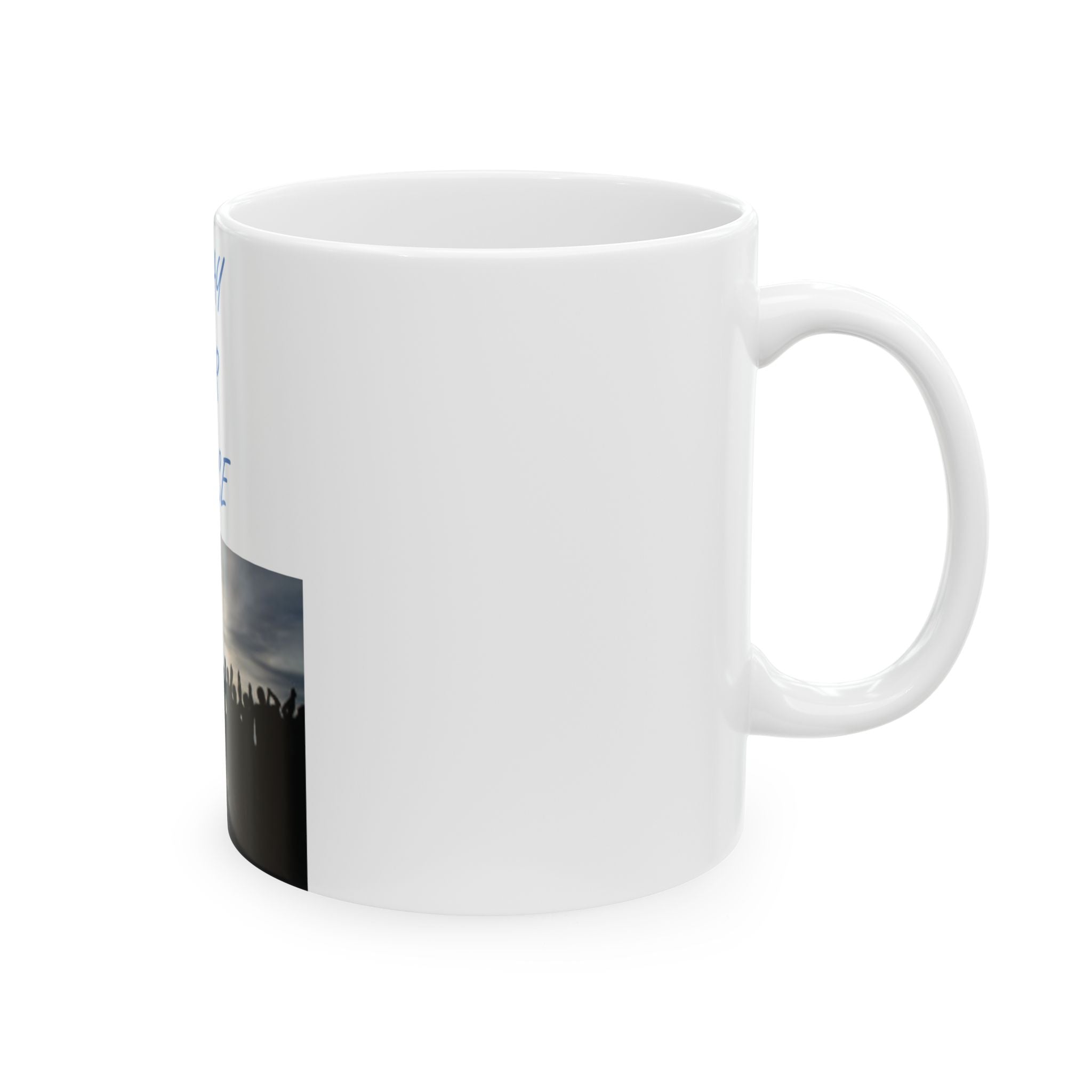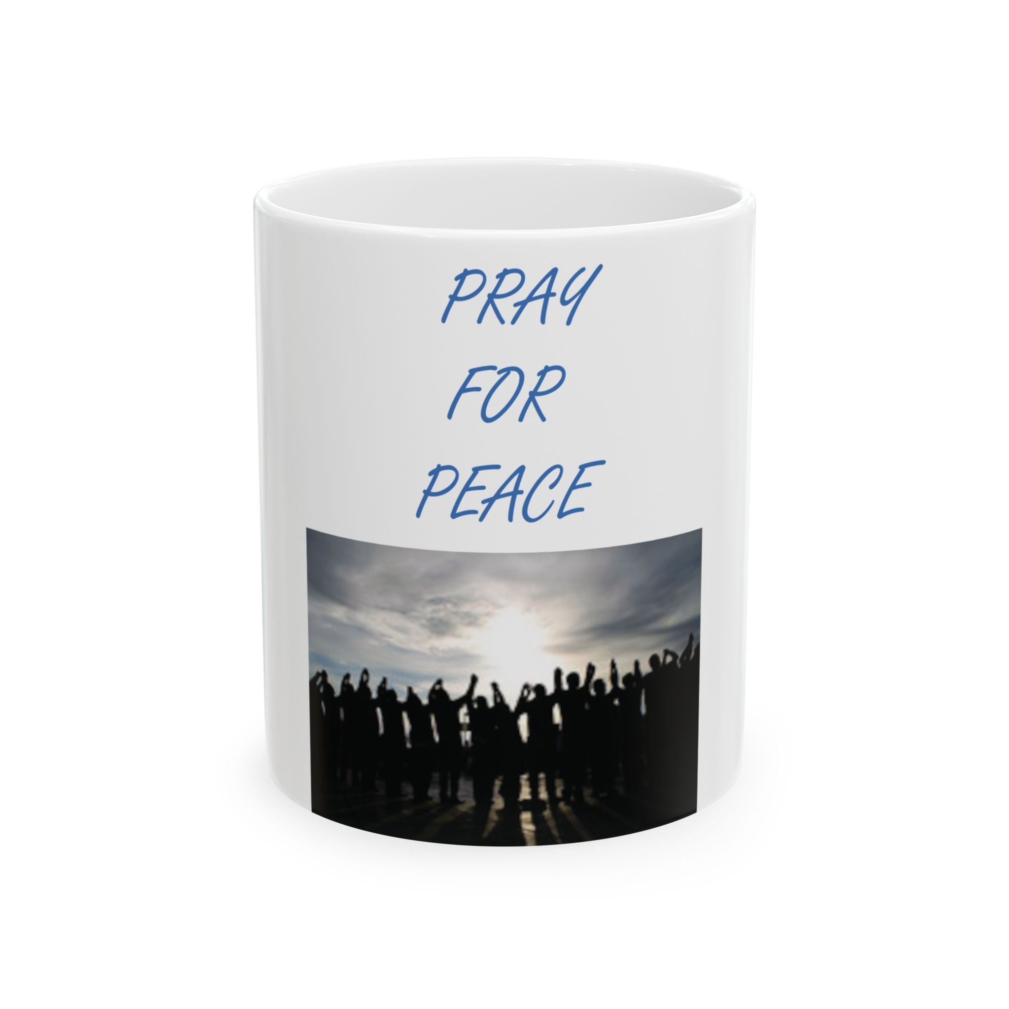 Start your day with a message of hope and unity on this stunning ceramic mug, featuring the heartfelt design: "Pray for Peace." The artwork portrays a group of individuals standing together, arms uplifted toward a radiant rising sun—a powerful representation of prayer, harmony, and solidarity.