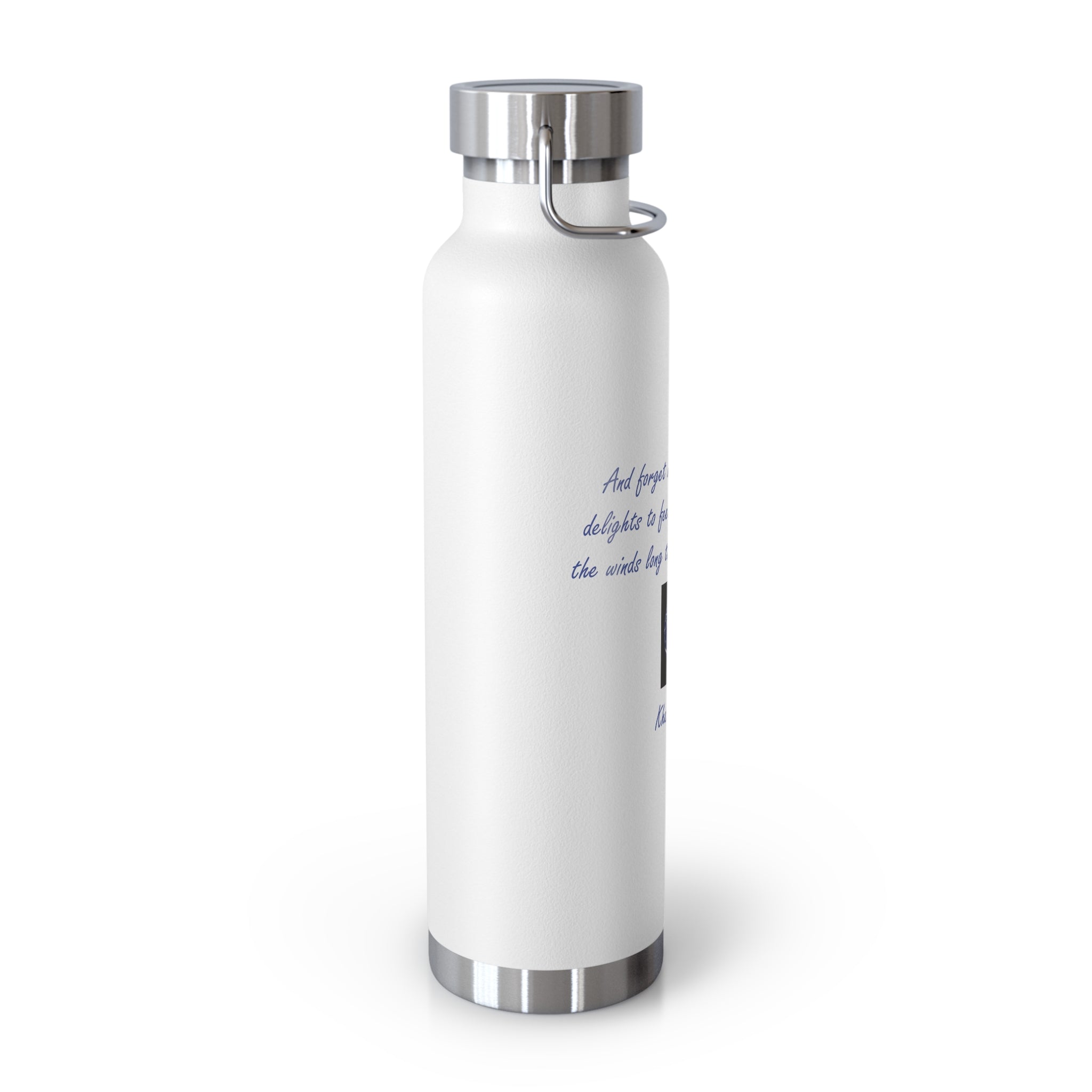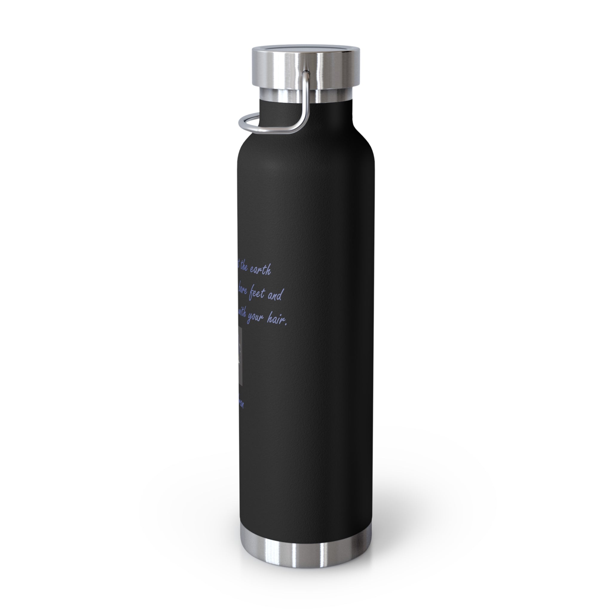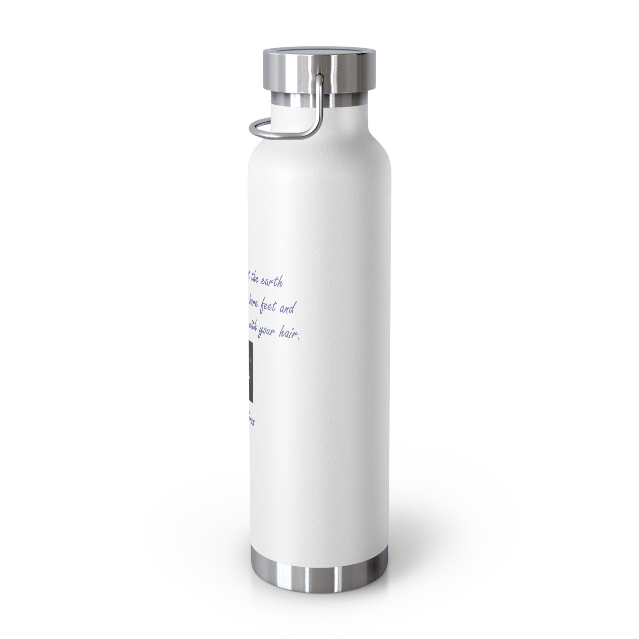 Stay connected to the beauty of nature and the vastness of the universe with this eco-friendly vacuum insulated water bottle, featuring a poetic quote by Khalil Gibran: "And forget not that the earth delights to feel your bare feet and the winds long to play with your hair."