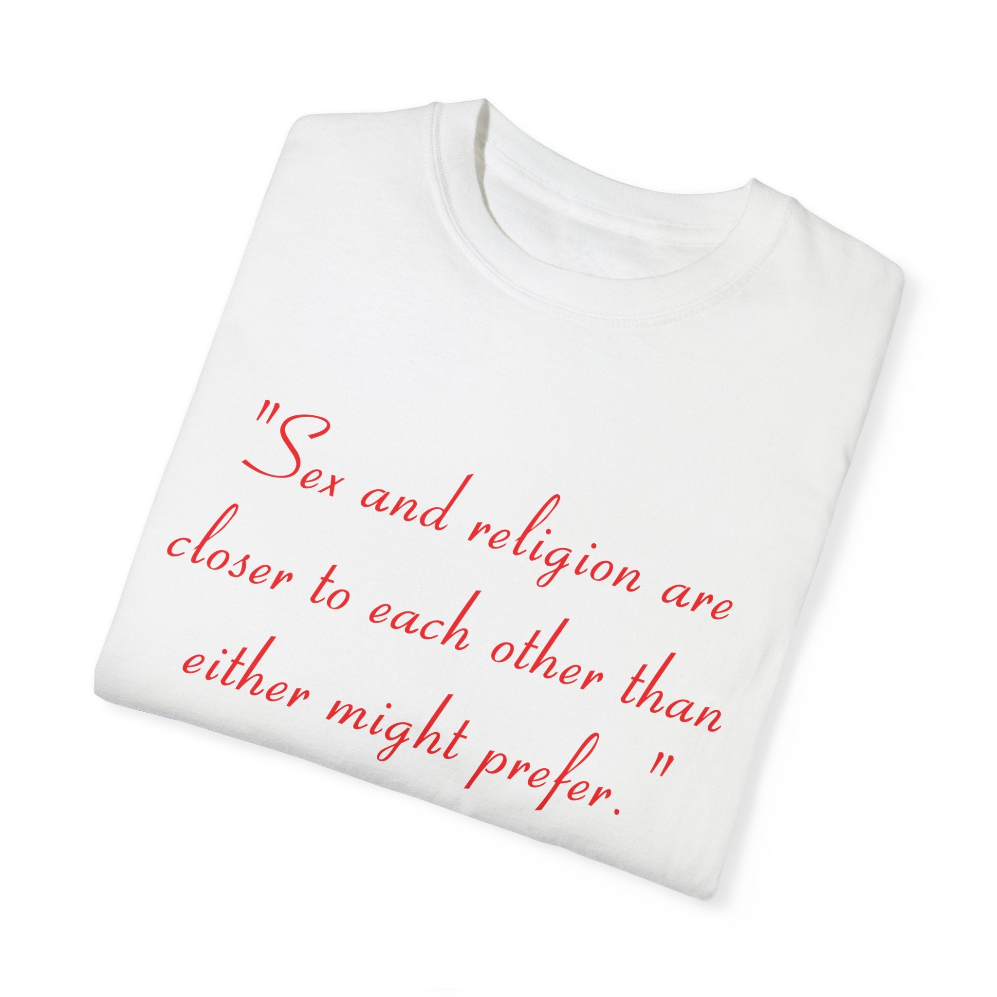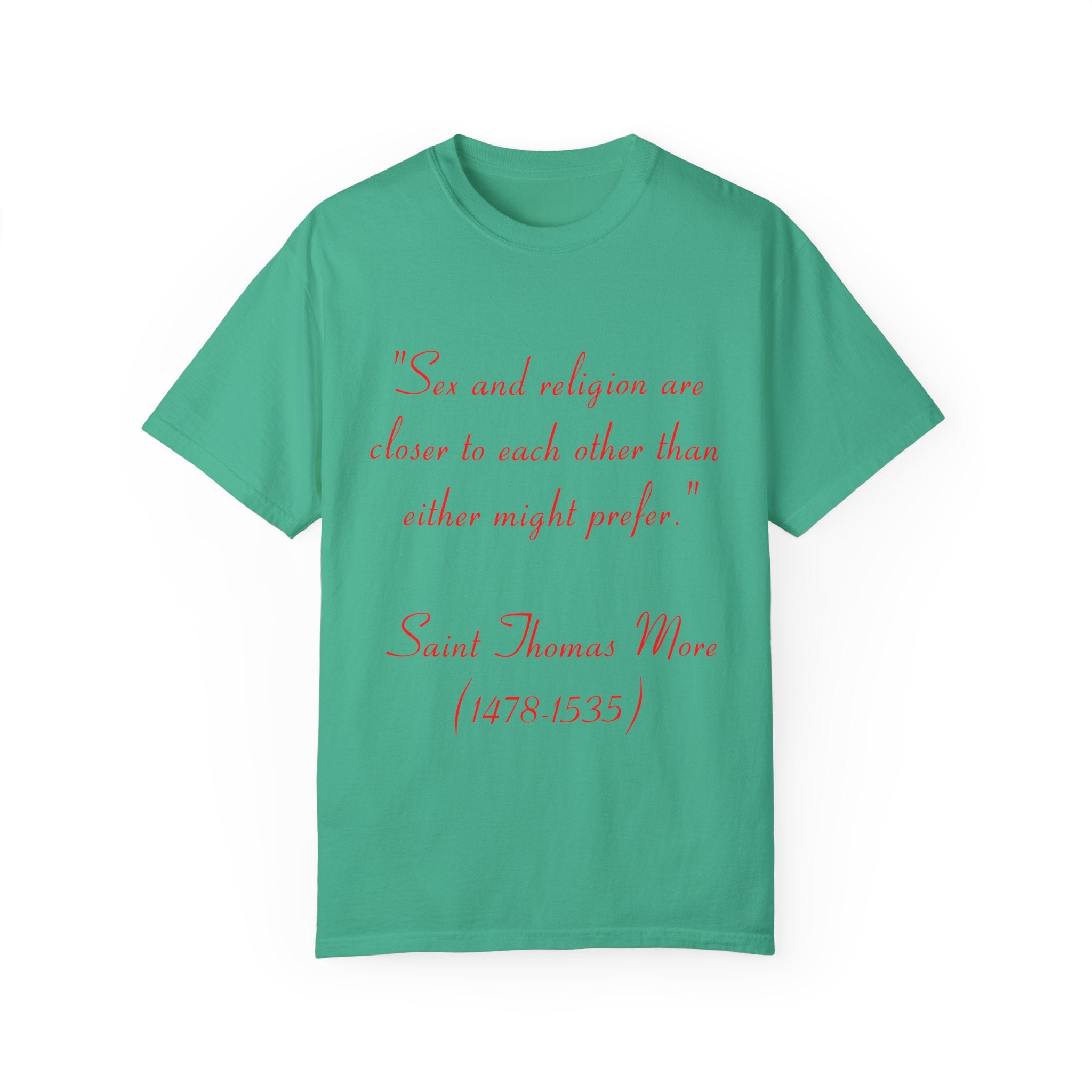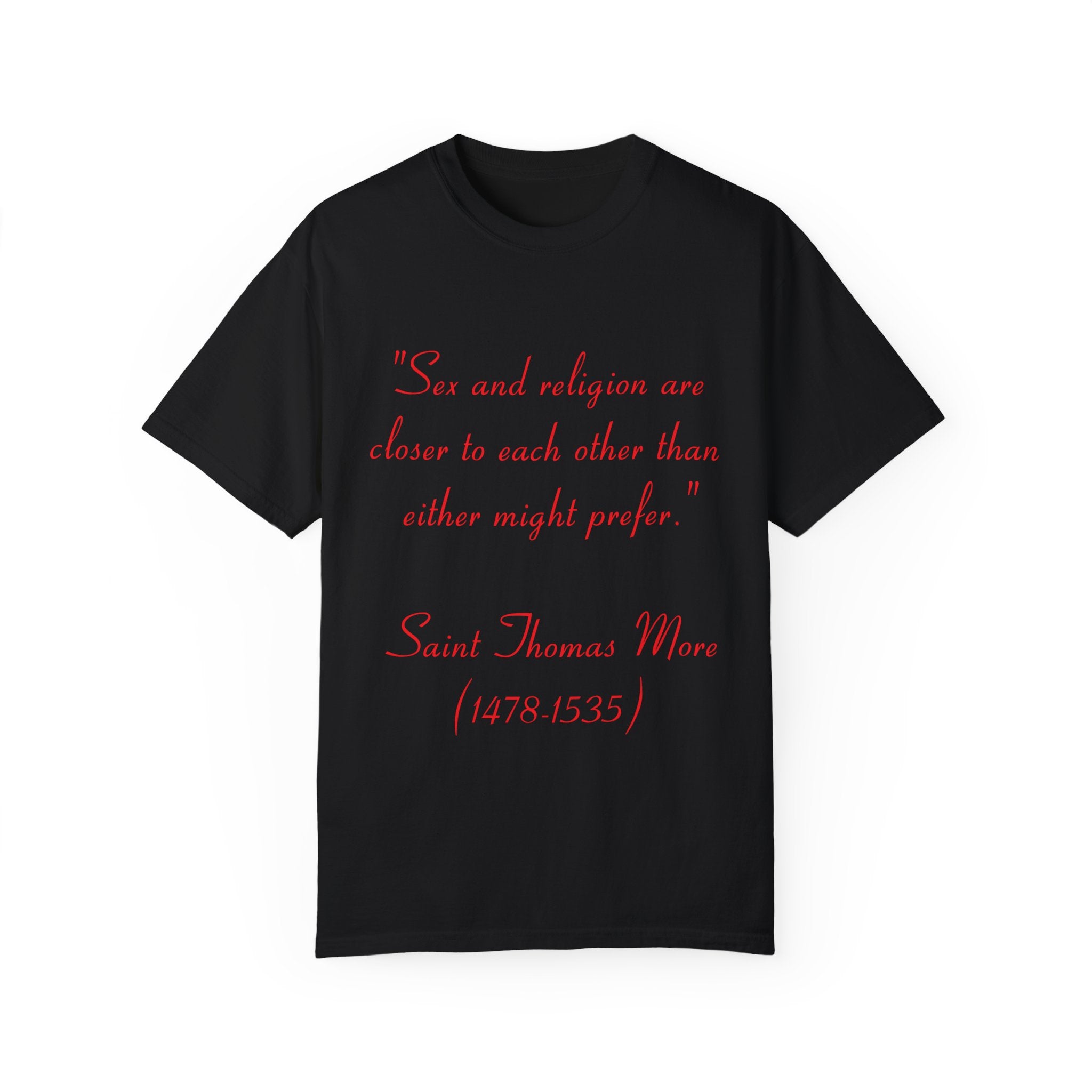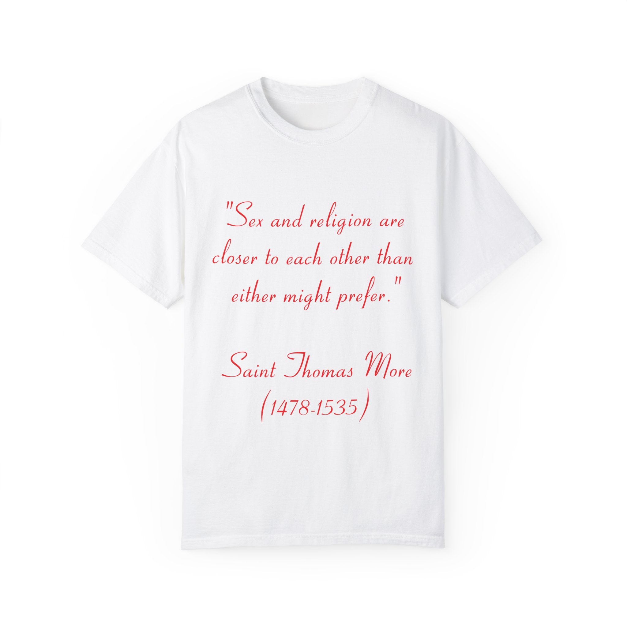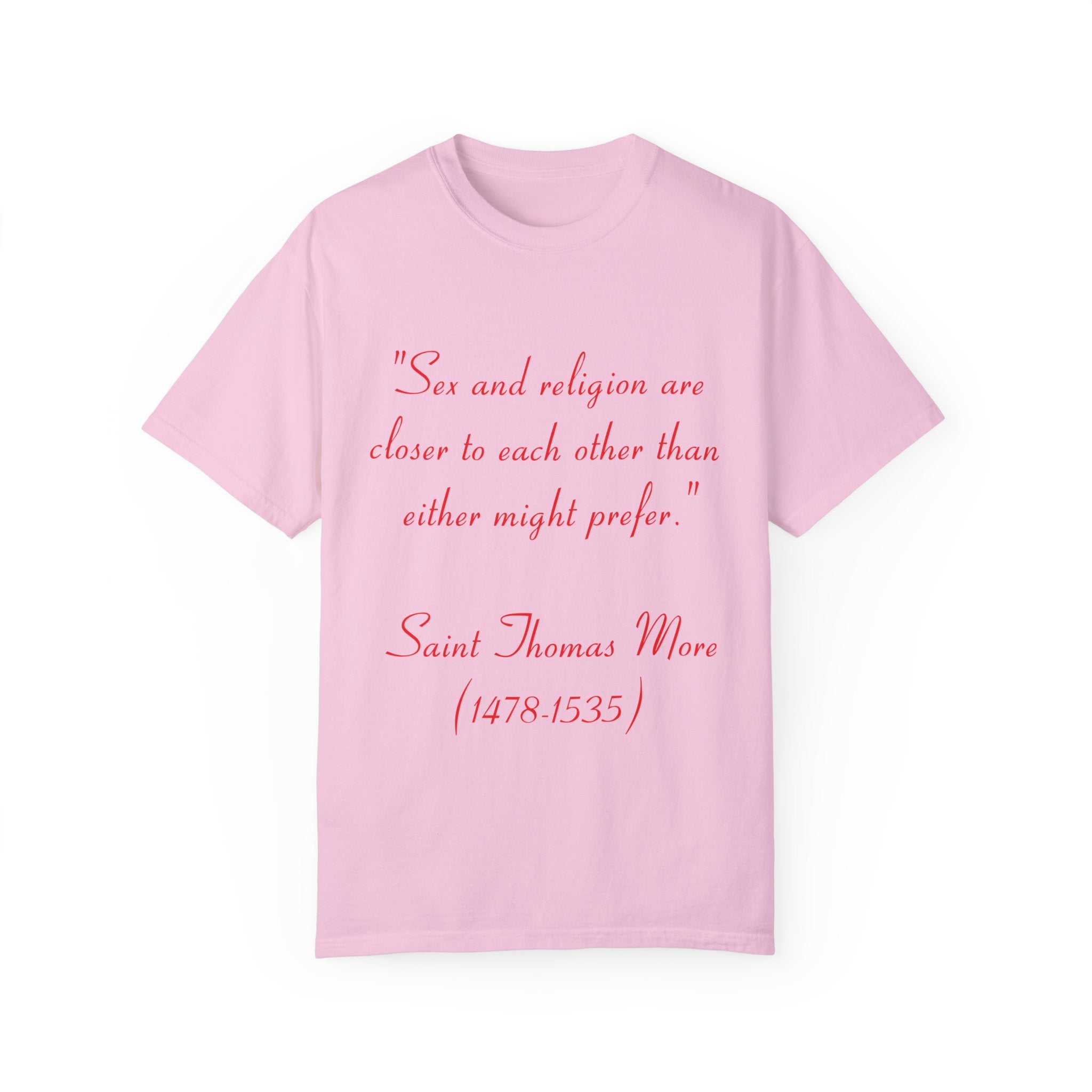 Make a statement with our Unisex Garment-Dyed T-Shirt, featuring the profound quote by St. Thomas More: “Sex and religion are closer to each other than either might prefer.” This design invites reflection on the complex connection between spirituality and human experience, transforming an everyday tee into a conversation starter.