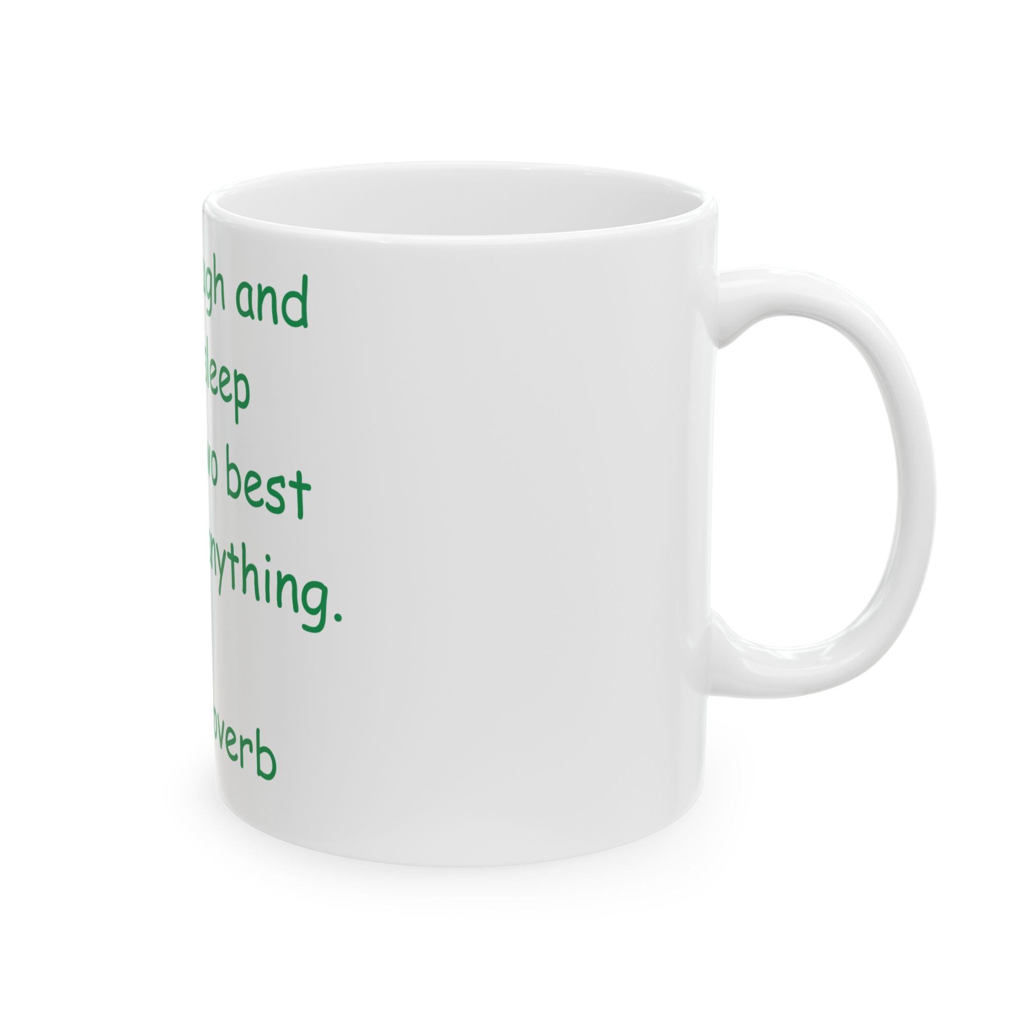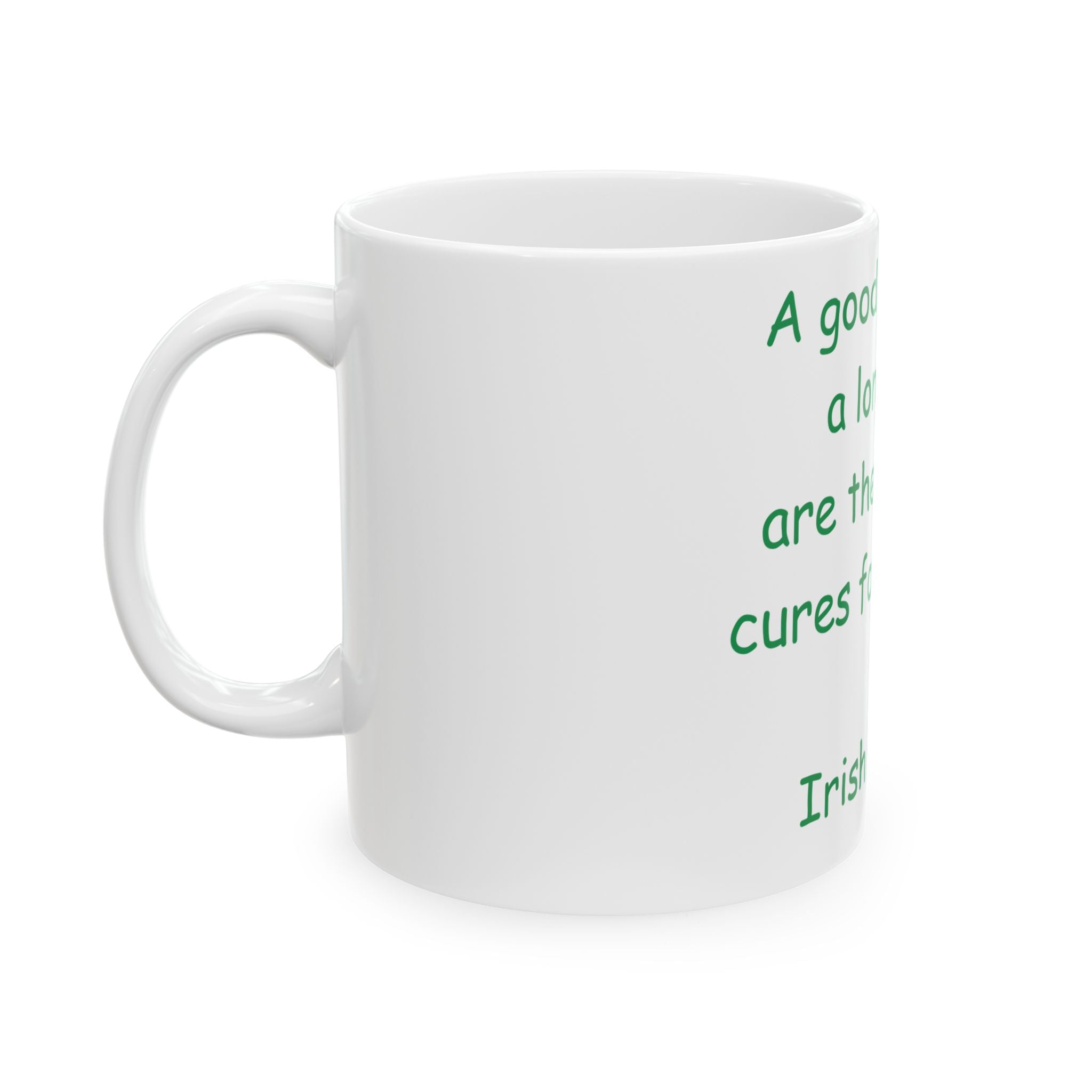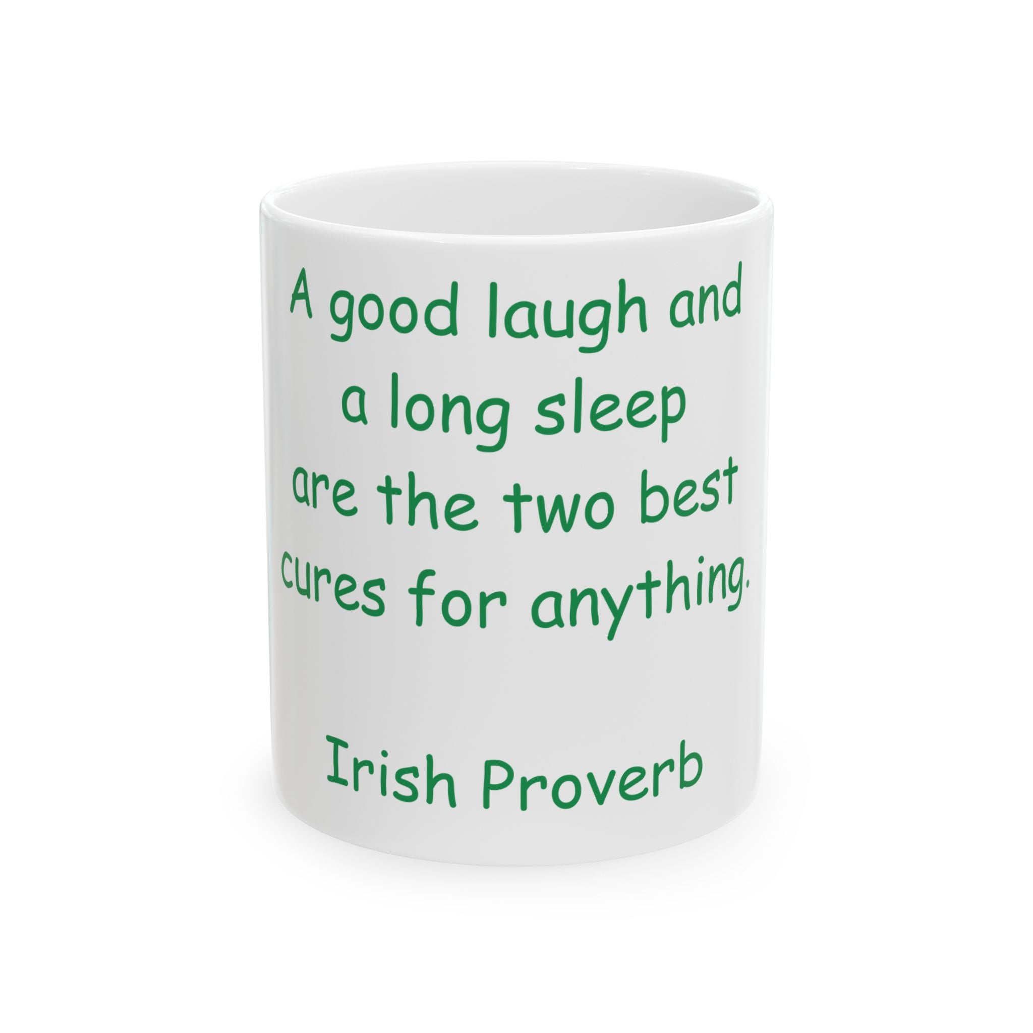 Add a touch of warmth and wisdom to your daily sip with this Ceramic Mug, featuring the timeless Irish proverb: 'A good laugh and a long sleep are the two best cures for anything.' With its glossy finish and vibrant design, this mug is perfect for cozy mornings, peaceful evenings, or sharing moments with friends. The comfortable C-handle and durable ceramic build ensure a delightful and practical experience.