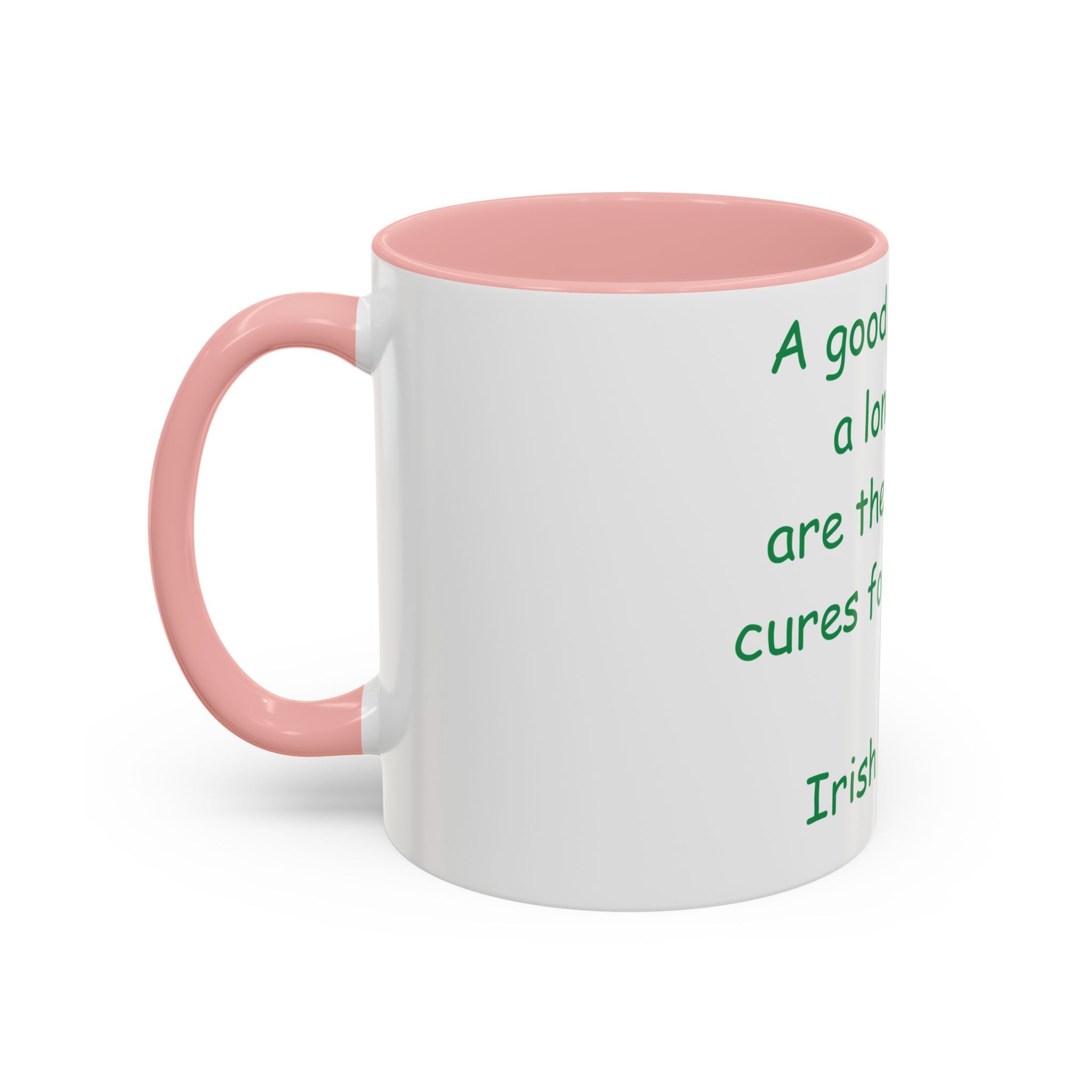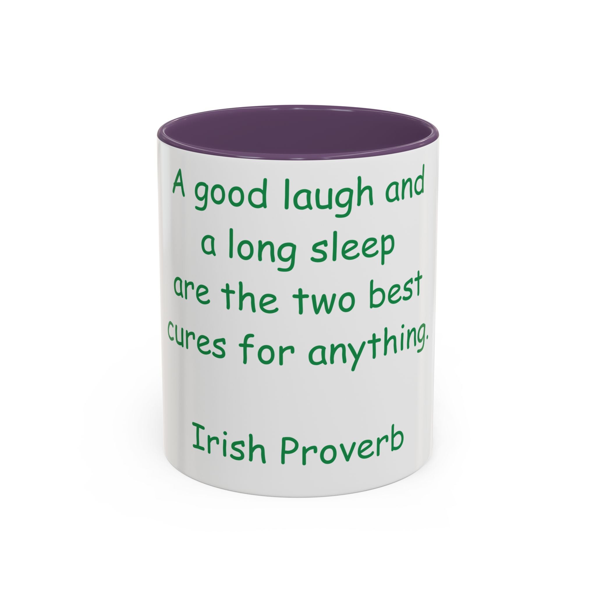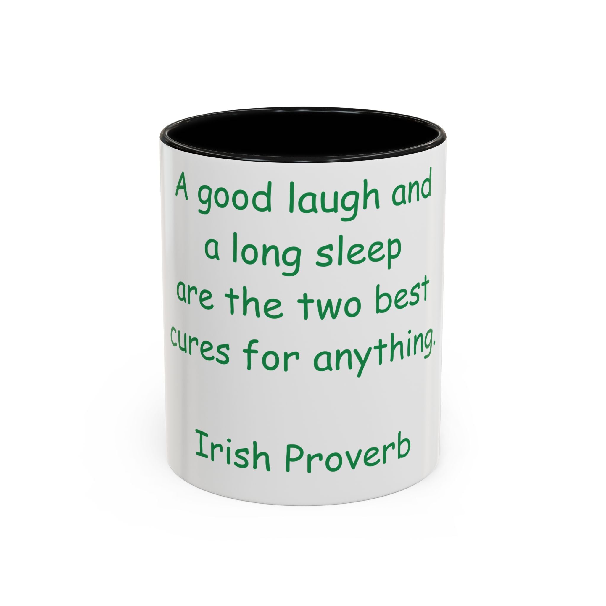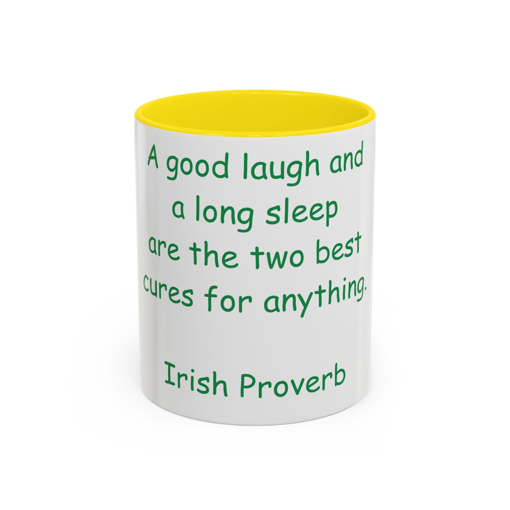 Brighten your mornings with this vibrant Accent Coffee Mug, showcasing the timeless Irish proverb: 'A good laugh and a long sleep are the two best cures for anything.' Crafted from high-quality white ceramic, this mug features a striking color contrast with a colorful interior and handle, adding warmth and character to your daily routine.