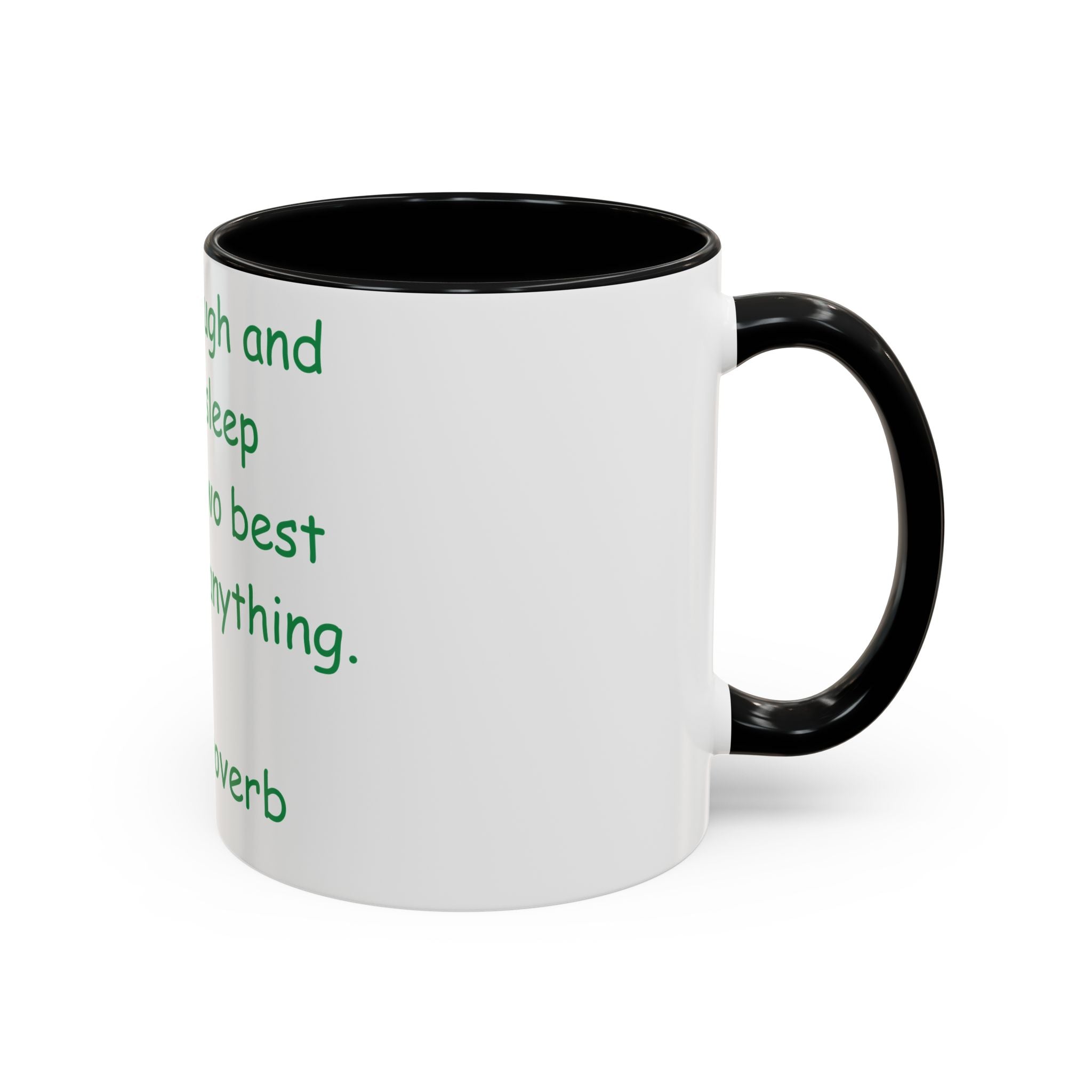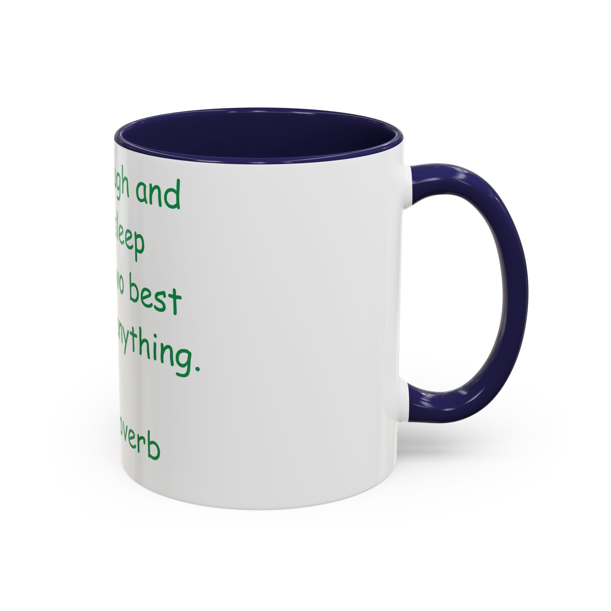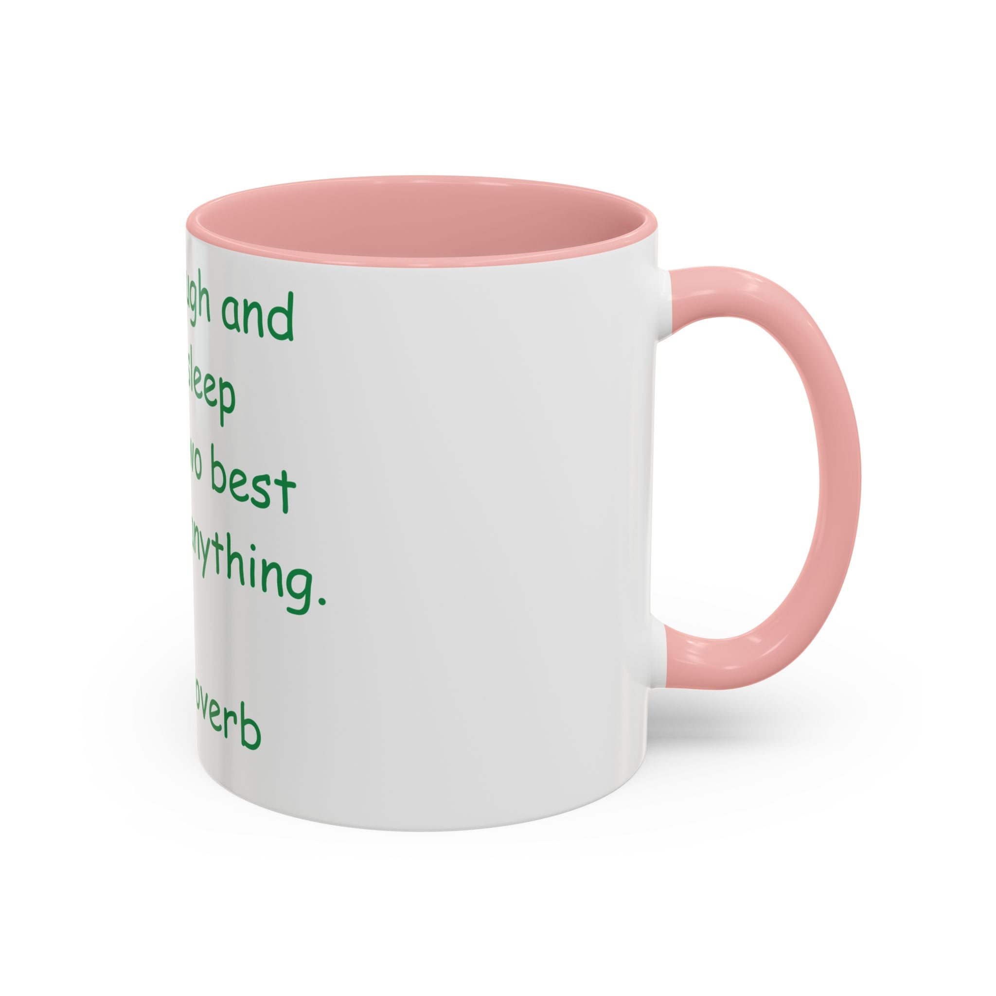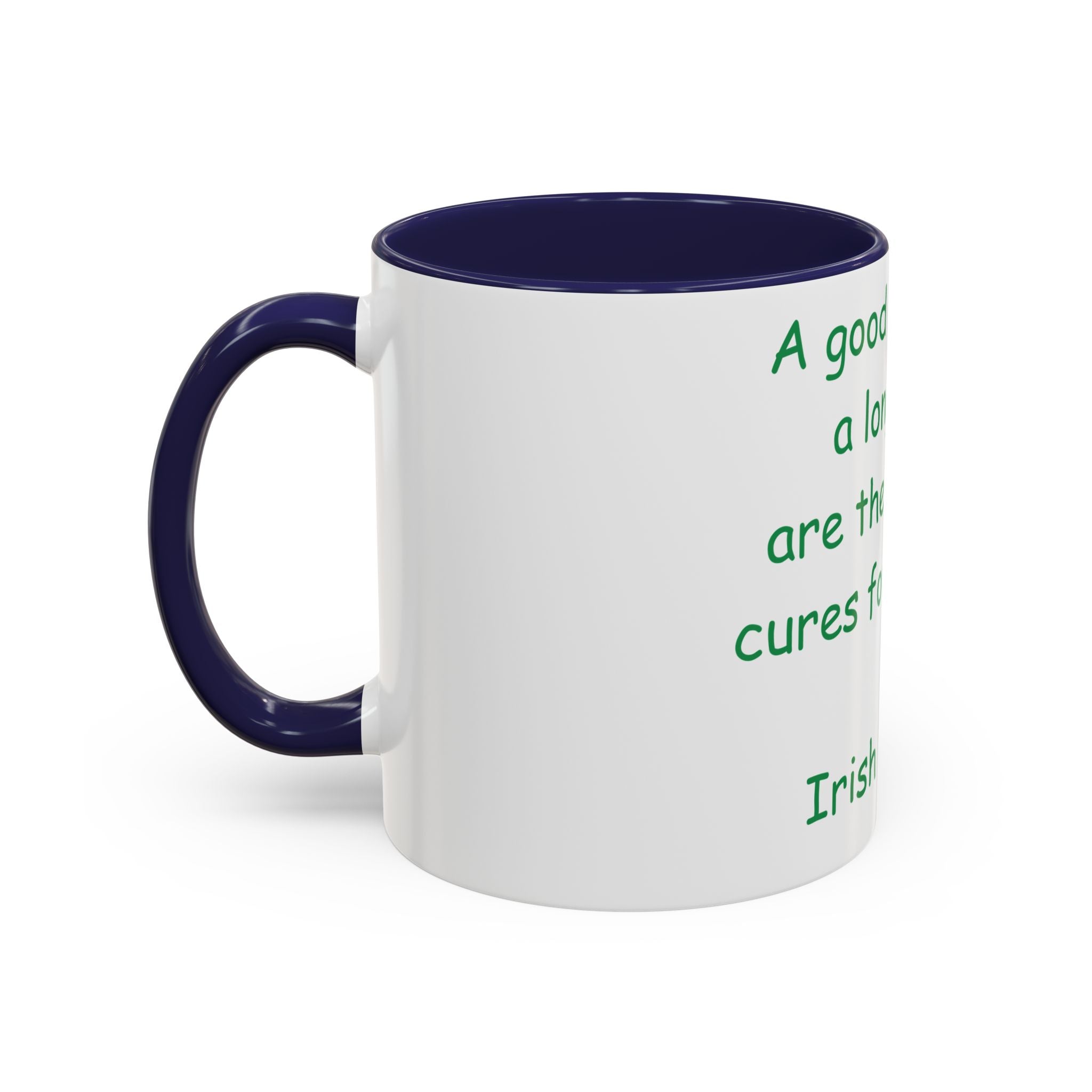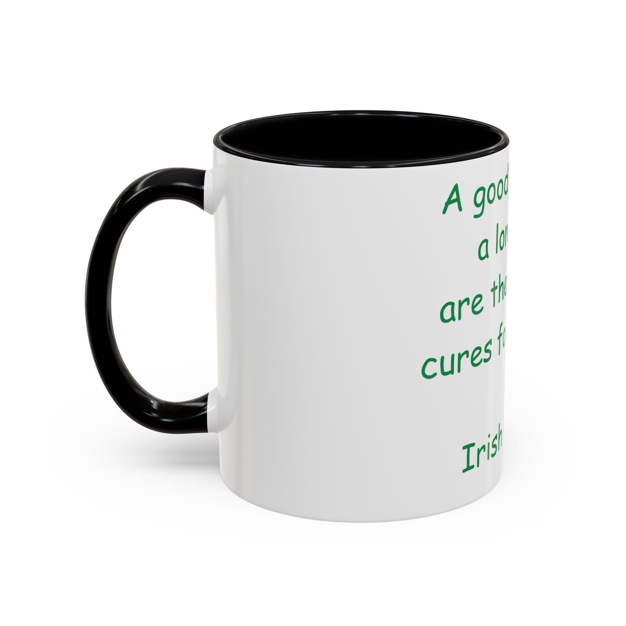 Brighten your mornings with this vibrant Accent Coffee Mug, showcasing the timeless Irish proverb: 'A good laugh and a long sleep are the two best cures for anything.' Crafted from high-quality white ceramic, this mug features a striking color contrast with a colorful interior and handle, adding warmth and character to your daily routine.