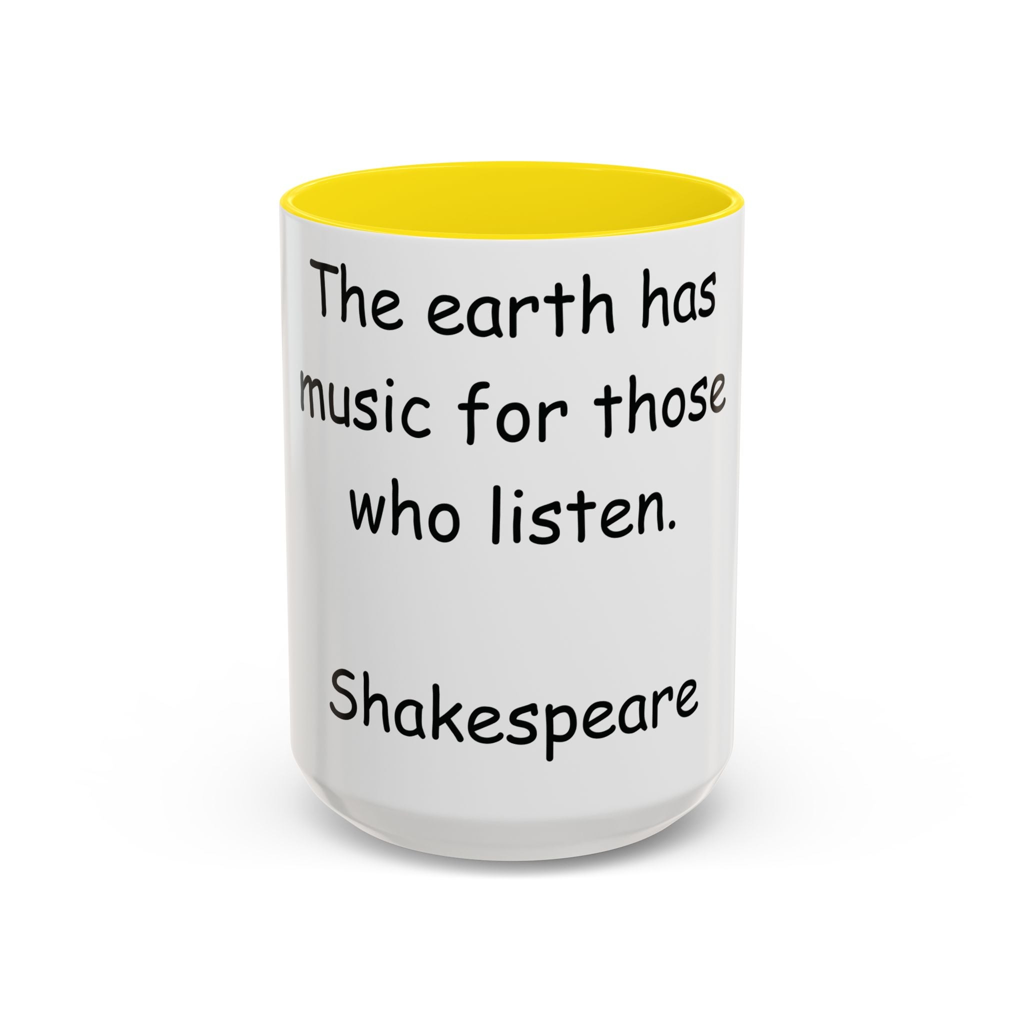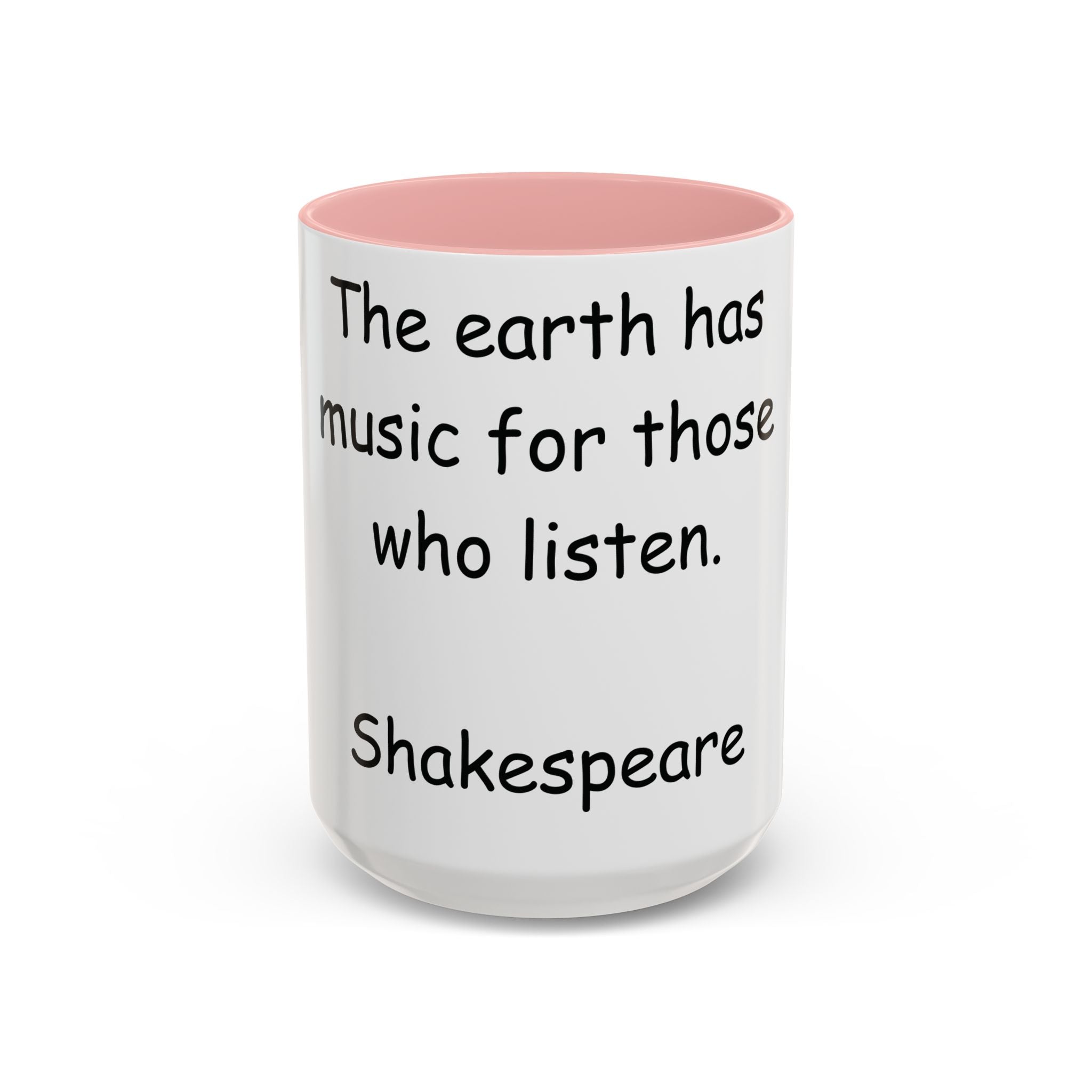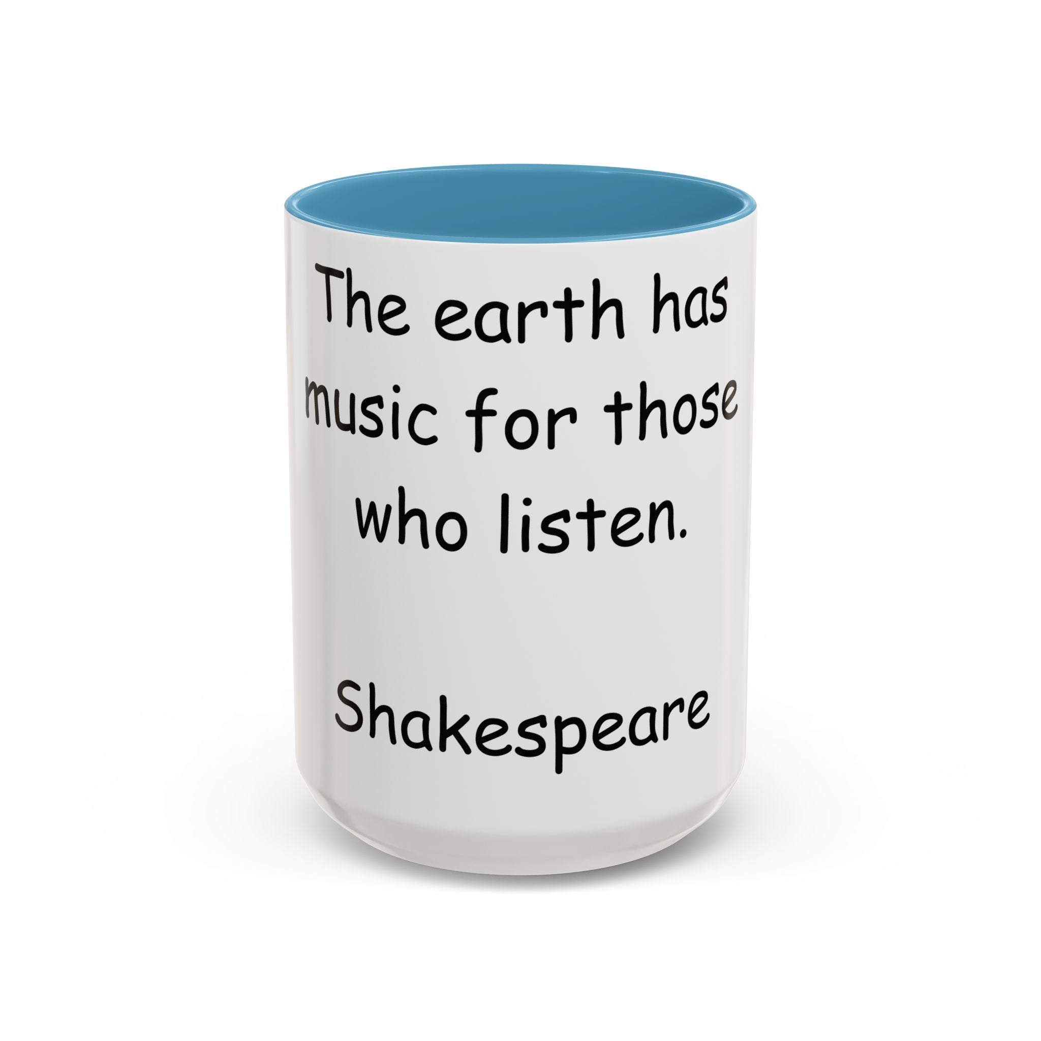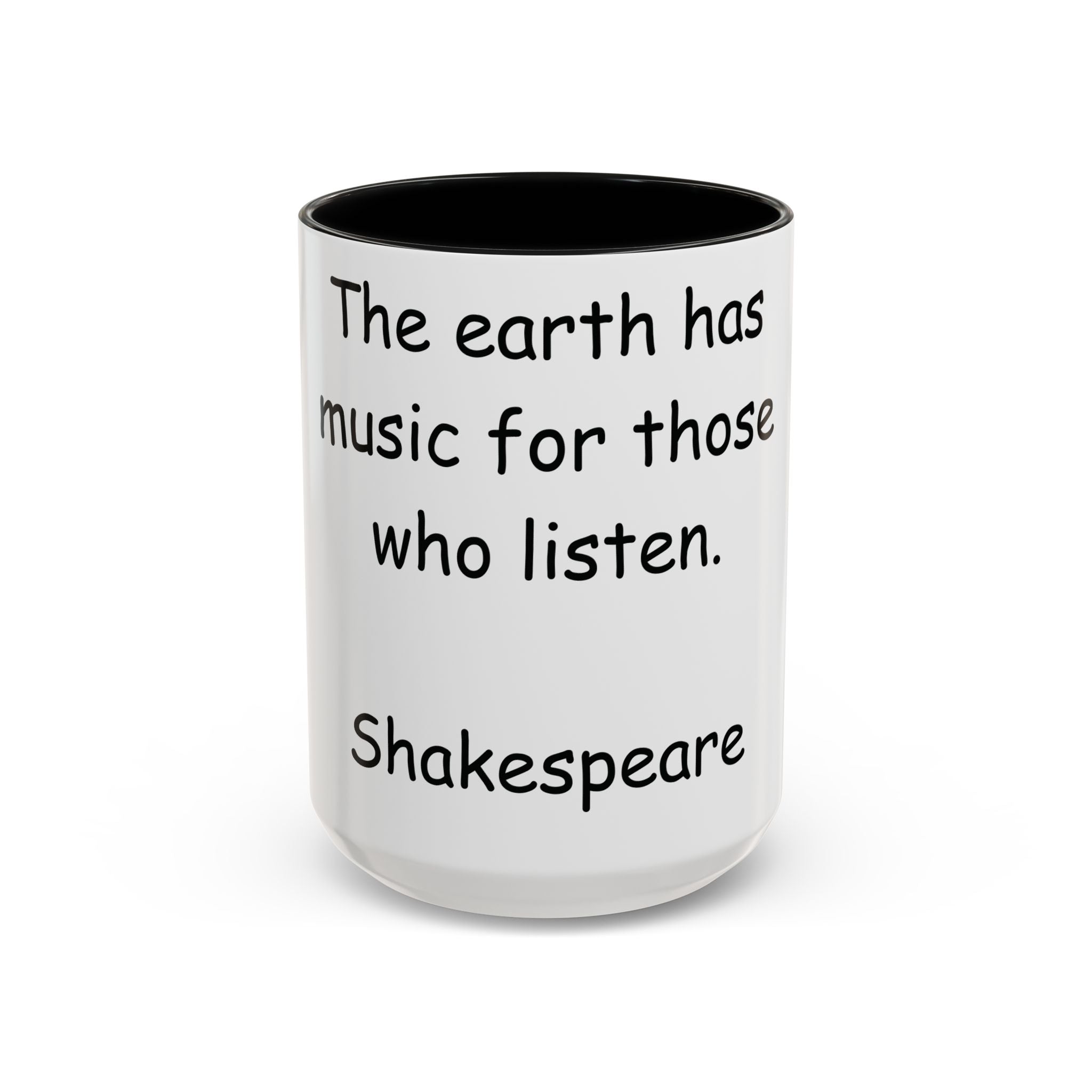 Start your day with inspiration and harmony using our Accent Coffee Mug, featuring a timeless quote attributed to Shakespeare: 'The earth has music for those who listen.' This elegant design invites you to embrace the soulful melodies of the natural world, adding a thoughtful touch to your morning routine.