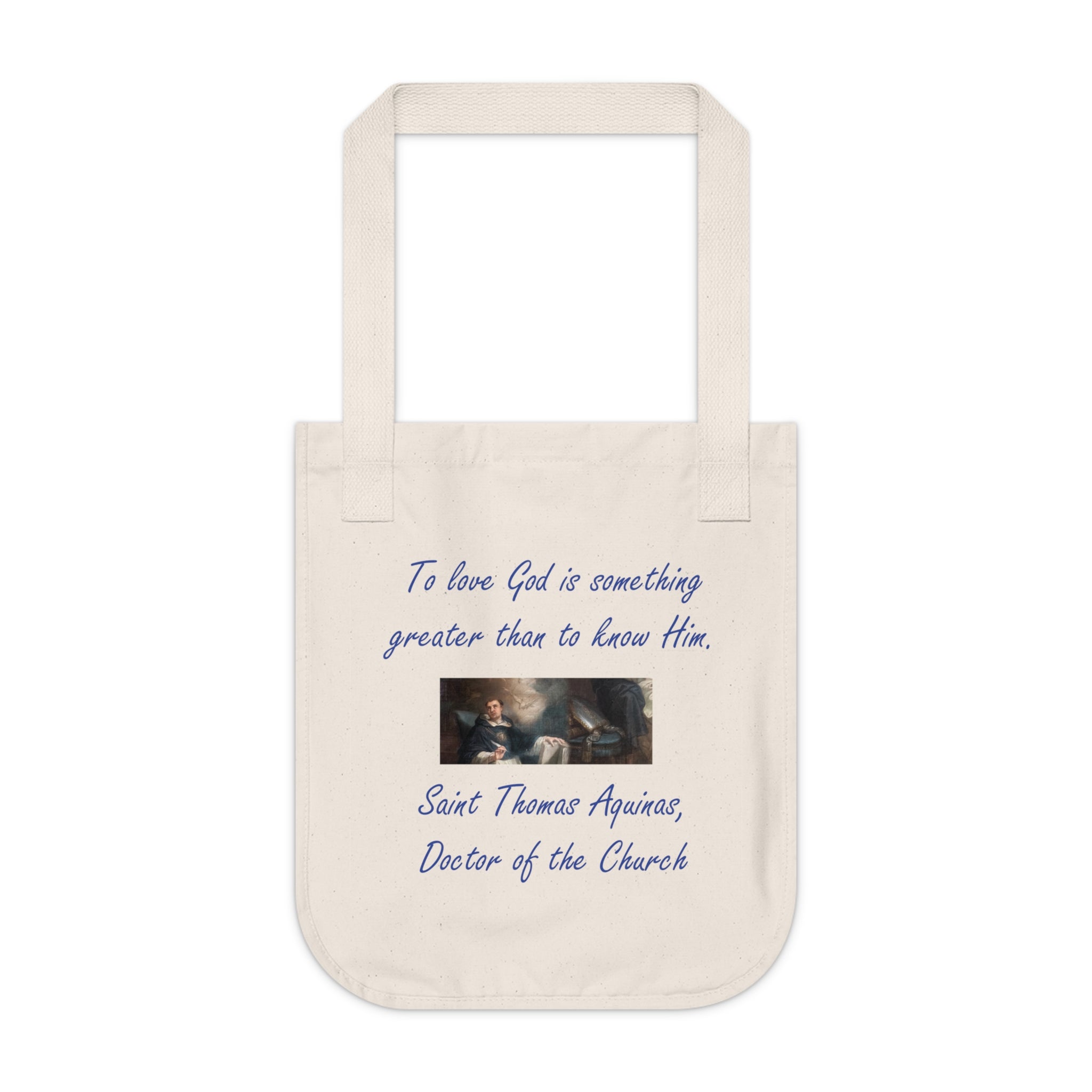 Carry a profound message and a commitment to sustainability with this Organic Canvas Tote Bag, featuring an inspiring quote from St. Thomas Aquinas: 'To love God is something greater than to know Him.' Elegantly paired with a timeless depiction of the saint, this design captures his wisdom and devotion, offering a meaningful reminder of faith and divine love.
