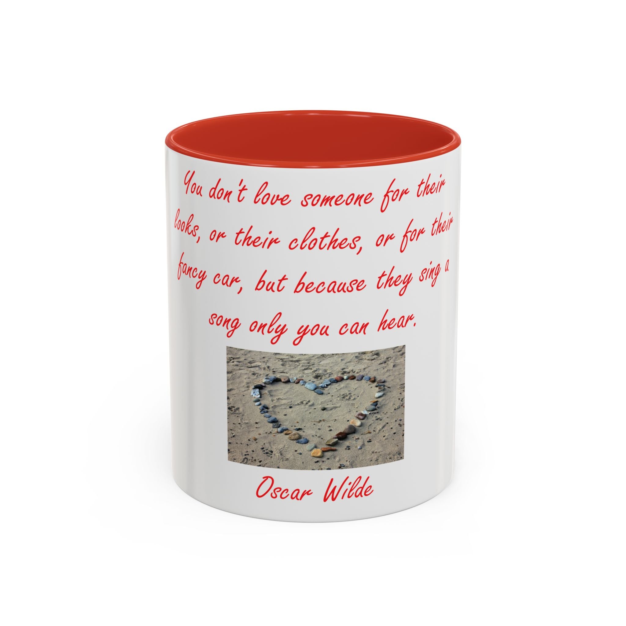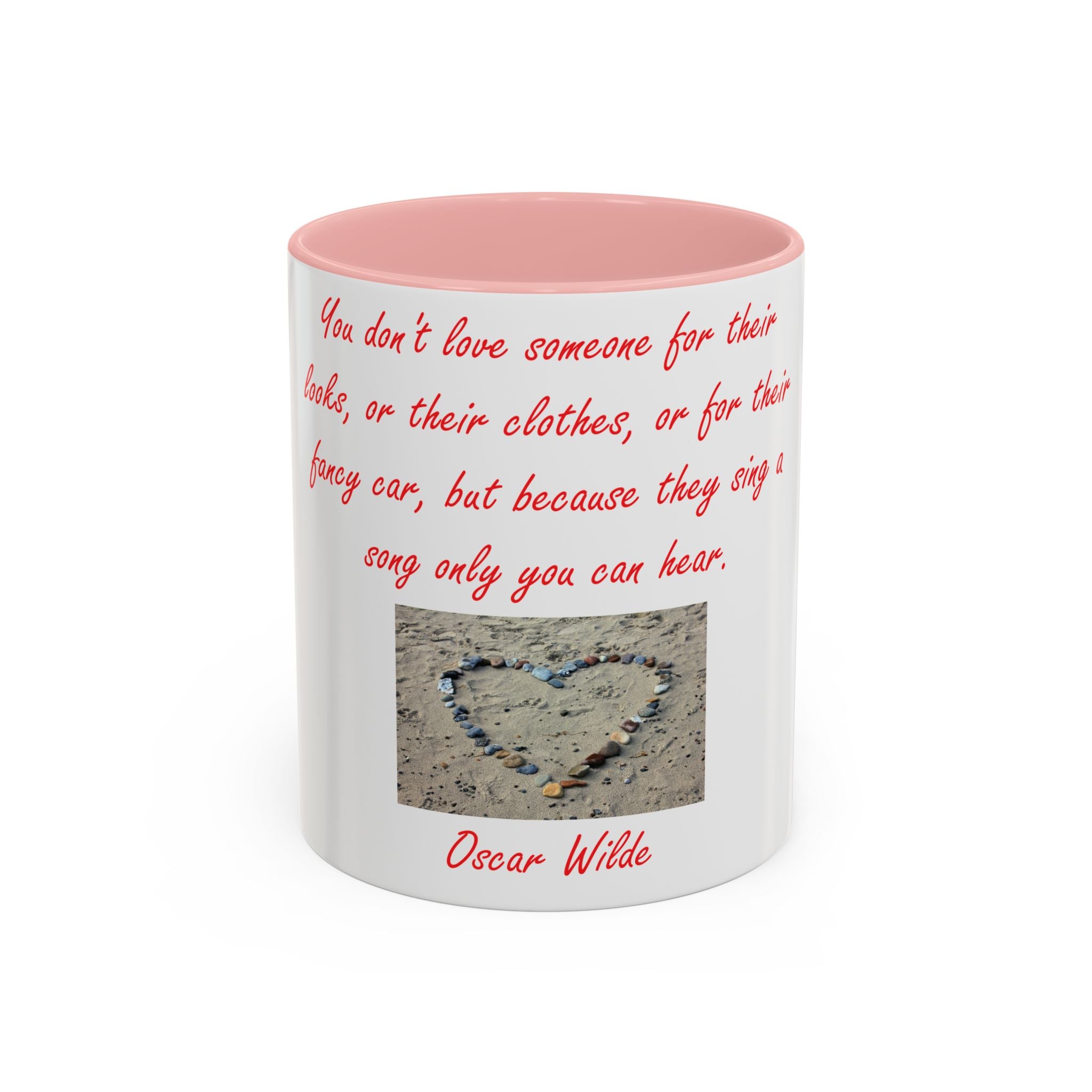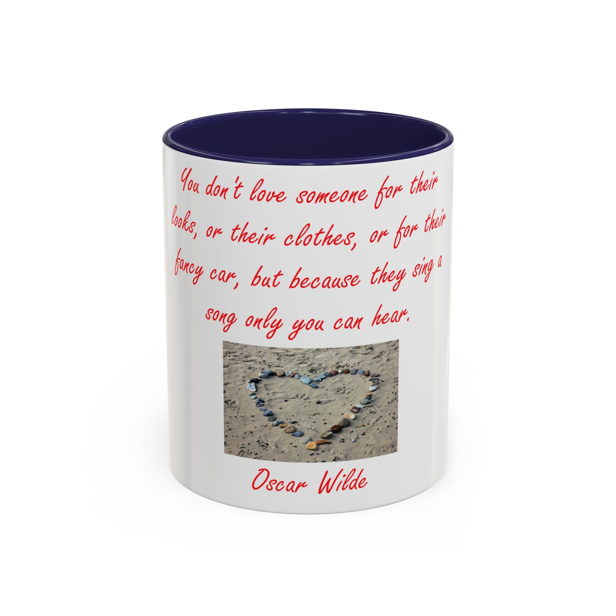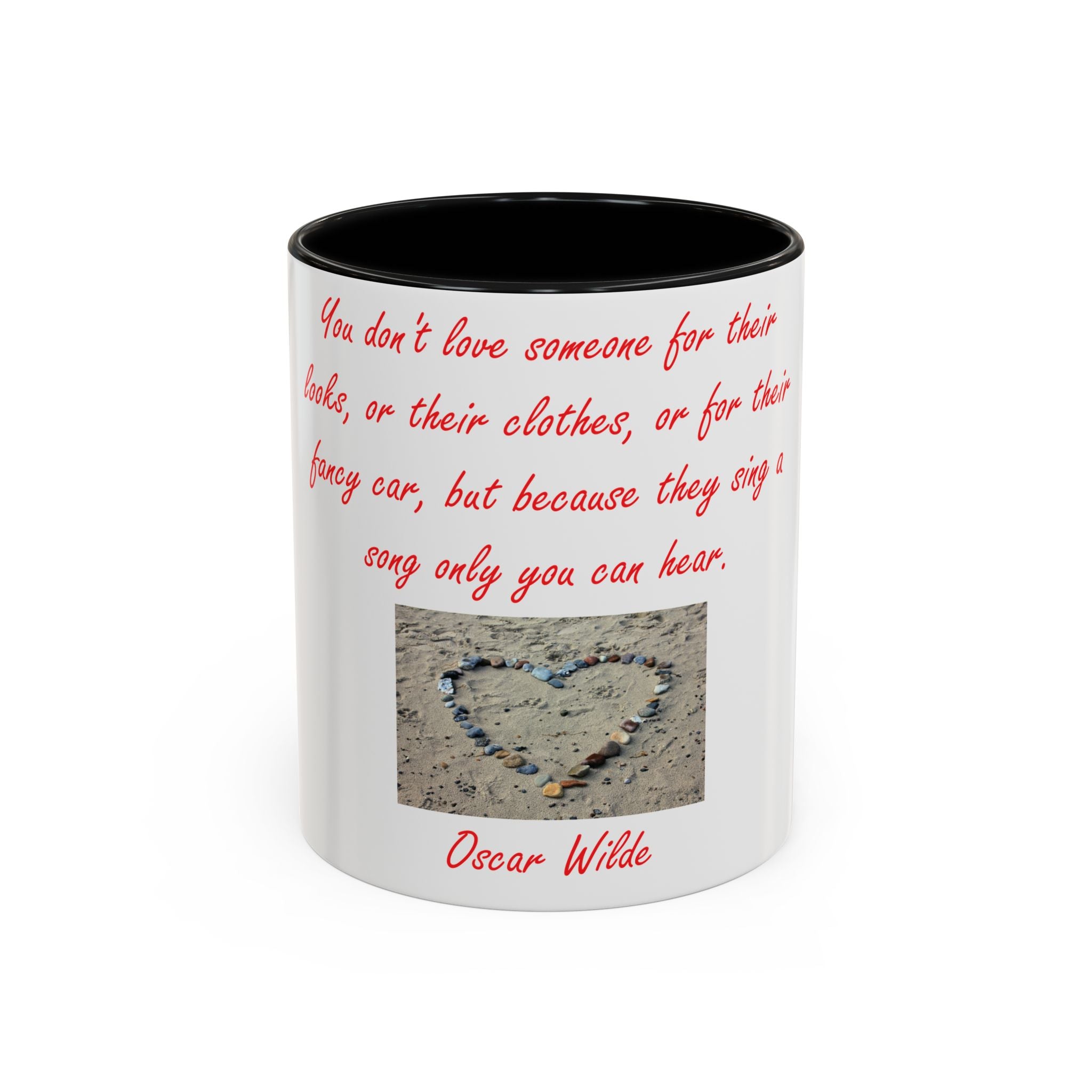The design elevates its appeal with Oscar Wilde’s heartfelt quote: 'You don't love someone for their looks, or their clothes, or for their fancy car, but because they sing a song only you can hear.' Accompanied by a serene photograph of a heart outline crafted from small stones on a sandy beach, it evokes themes of love, connection, and natural beauty. Ideal as a thoughtful gift for birthdays, holidays, or any special occasion, this mug celebrates individuality, shared moments, and the beauty of everyday life.