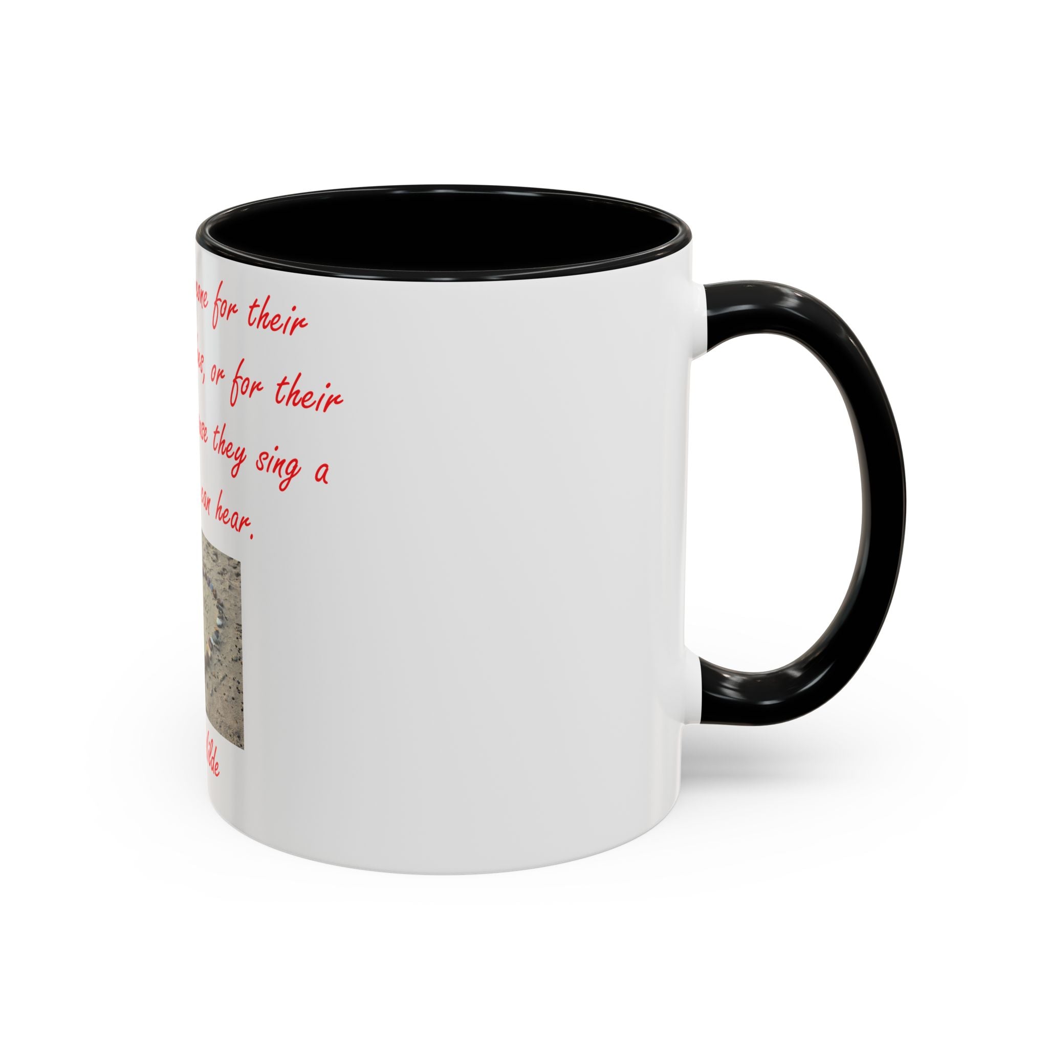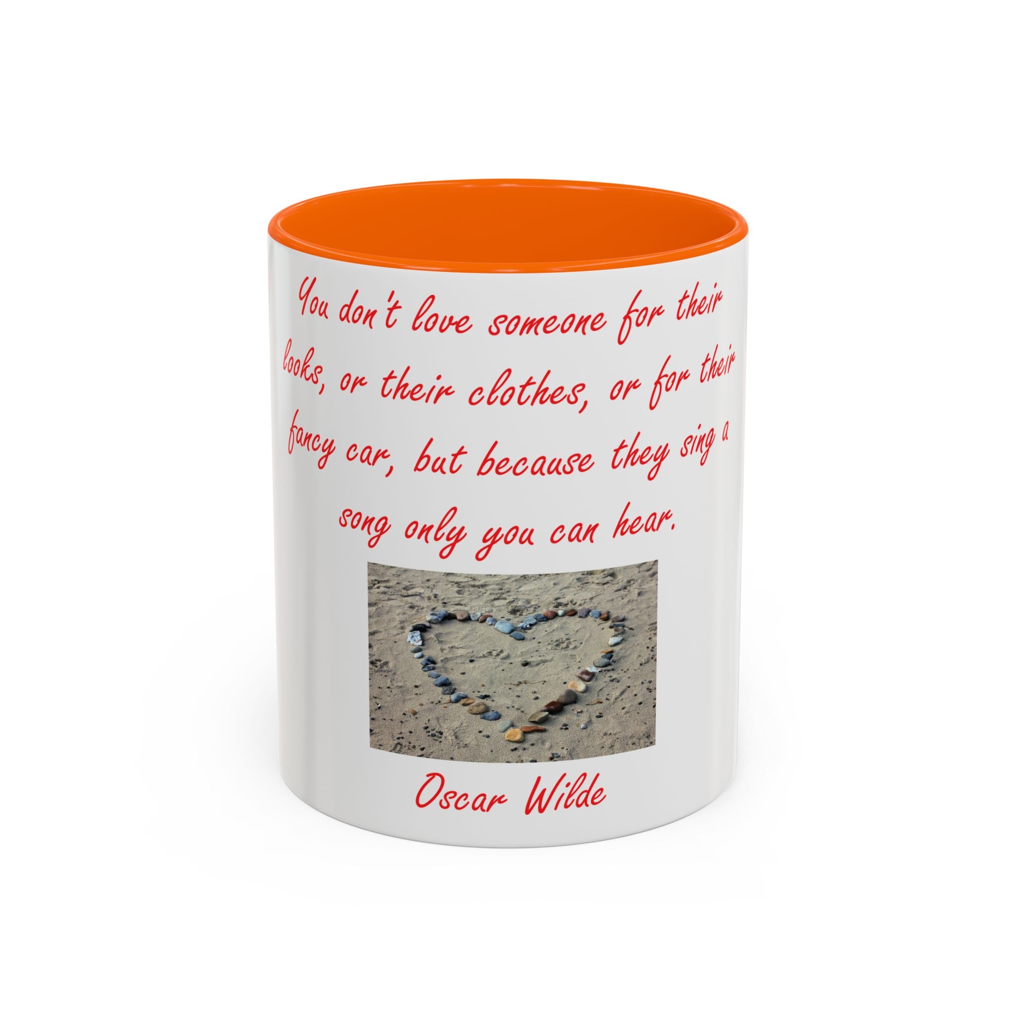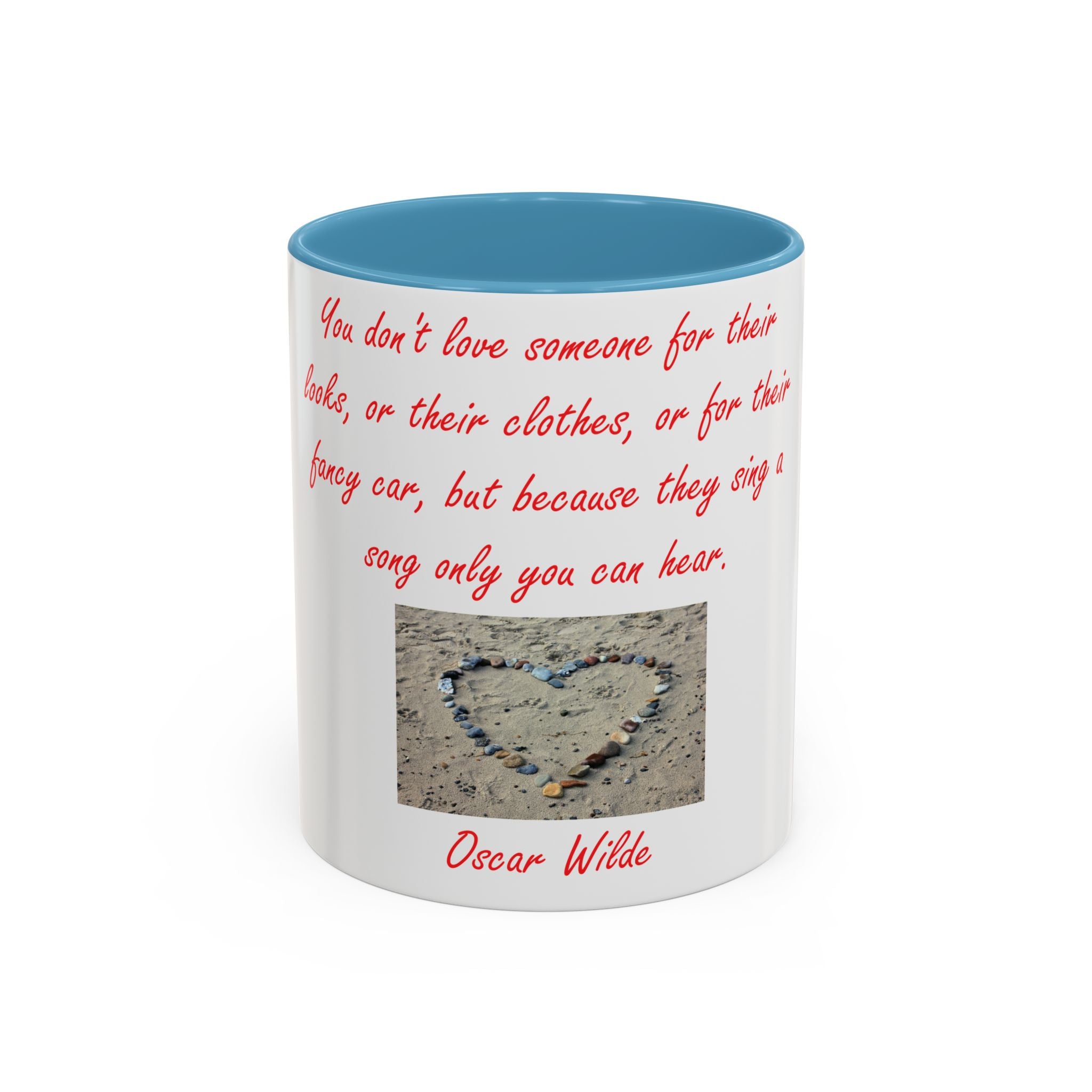 The design elevates its appeal with Oscar Wilde’s heartfelt quote: 'You don't love someone for their looks, or their clothes, or for their fancy car, but because they sing a song only you can hear.' Accompanied by a serene photograph of a heart outline crafted from small stones on a sandy beach, it evokes themes of love, connection, and natural beauty. Ideal as a thoughtful gift for birthdays, holidays, or any special occasion, this mug celebrates individuality, shared moments, and the beauty of everyday life.