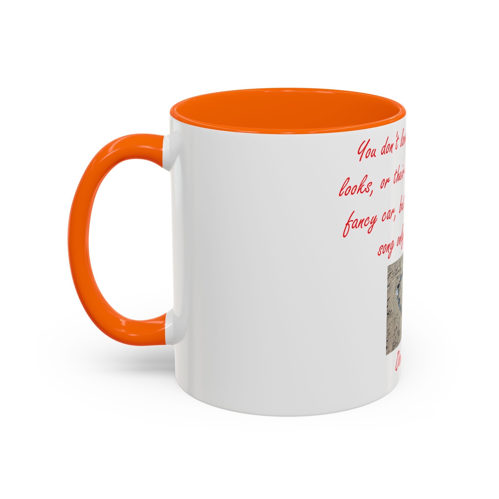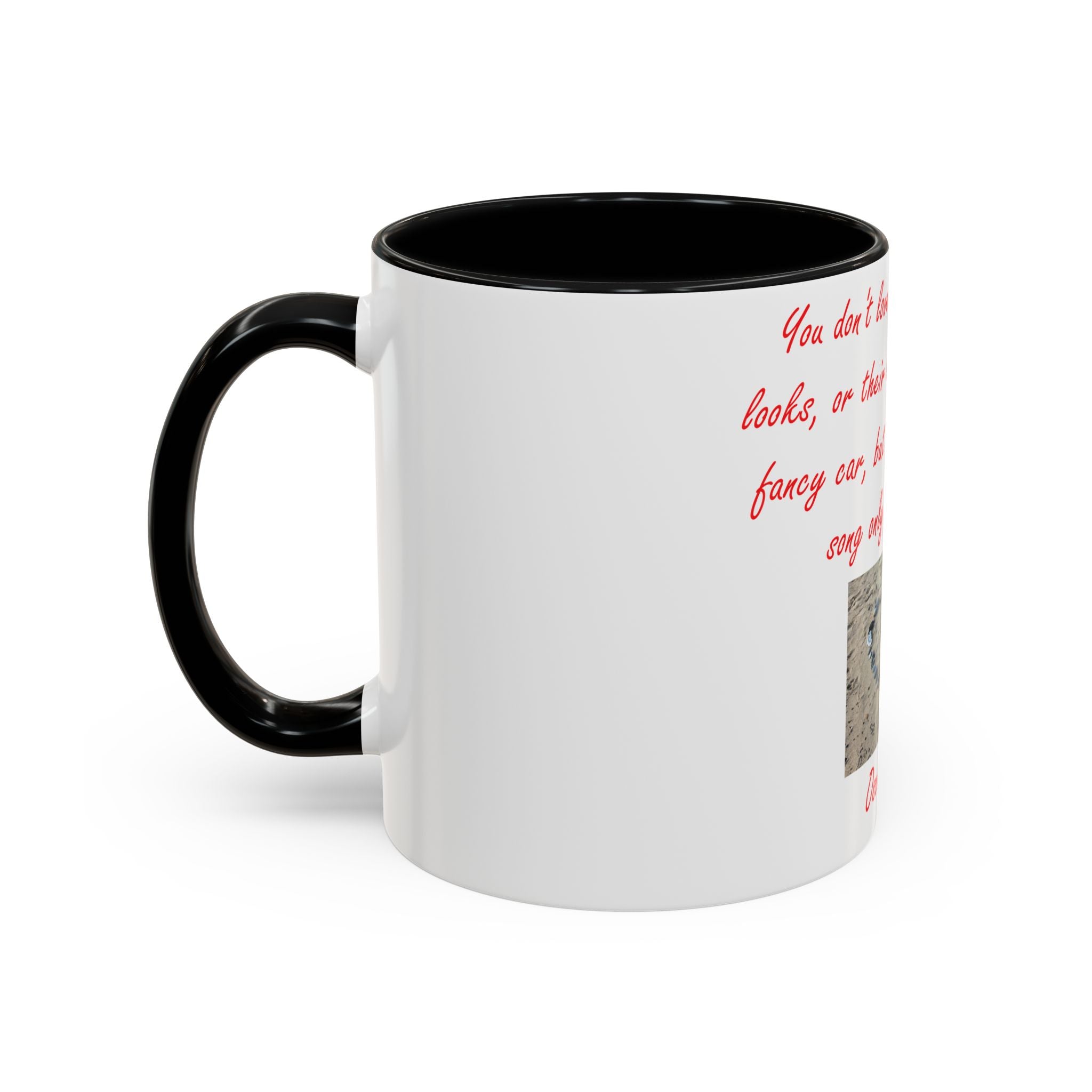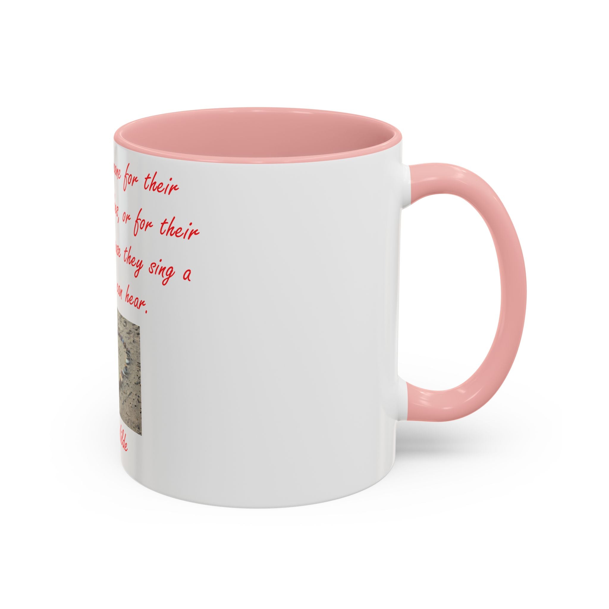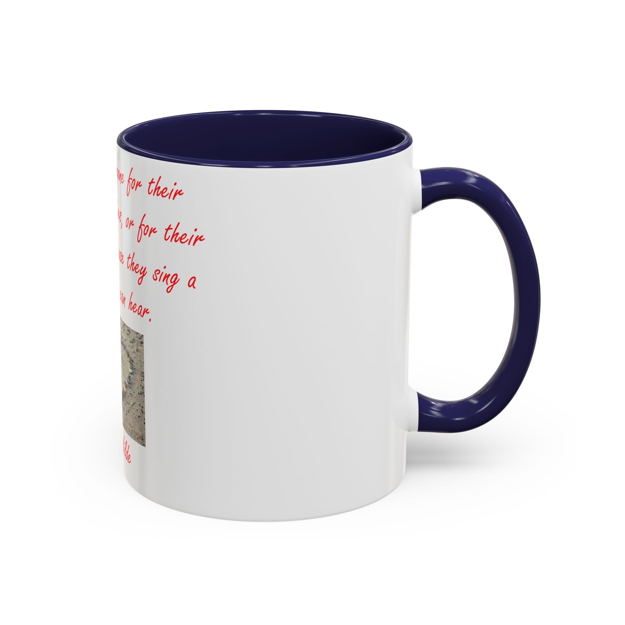The design elevates its appeal with Oscar Wilde’s heartfelt quote: 'You don't love someone for their looks, or their clothes, or for their fancy car, but because they sing a song only you can hear.' Accompanied by a serene photograph of a heart outline crafted from small stones on a sandy beach, it evokes themes of love, connection, and natural beauty. Ideal as a thoughtful gift for birthdays, holidays, or any special occasion, this mug celebrates individuality, shared moments, and the beauty of everyday life.