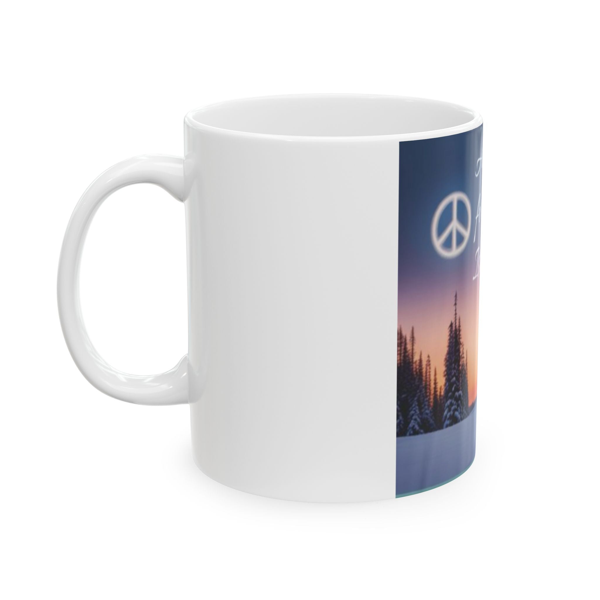 Find peace and tranquility in every sip with our stunning Ceramic Mug, featuring a serene AI-generated winter sunset as the backdrop. A subtle peace sign shines in the upper left corner, while the text "All I want for Christmas is peace" graces the foreground, bringing harmony and a gentle reminder of the season’s spirit. Designed by Judith Ann Dykeman, this peaceful design embodies the calming beauty of the holidays.