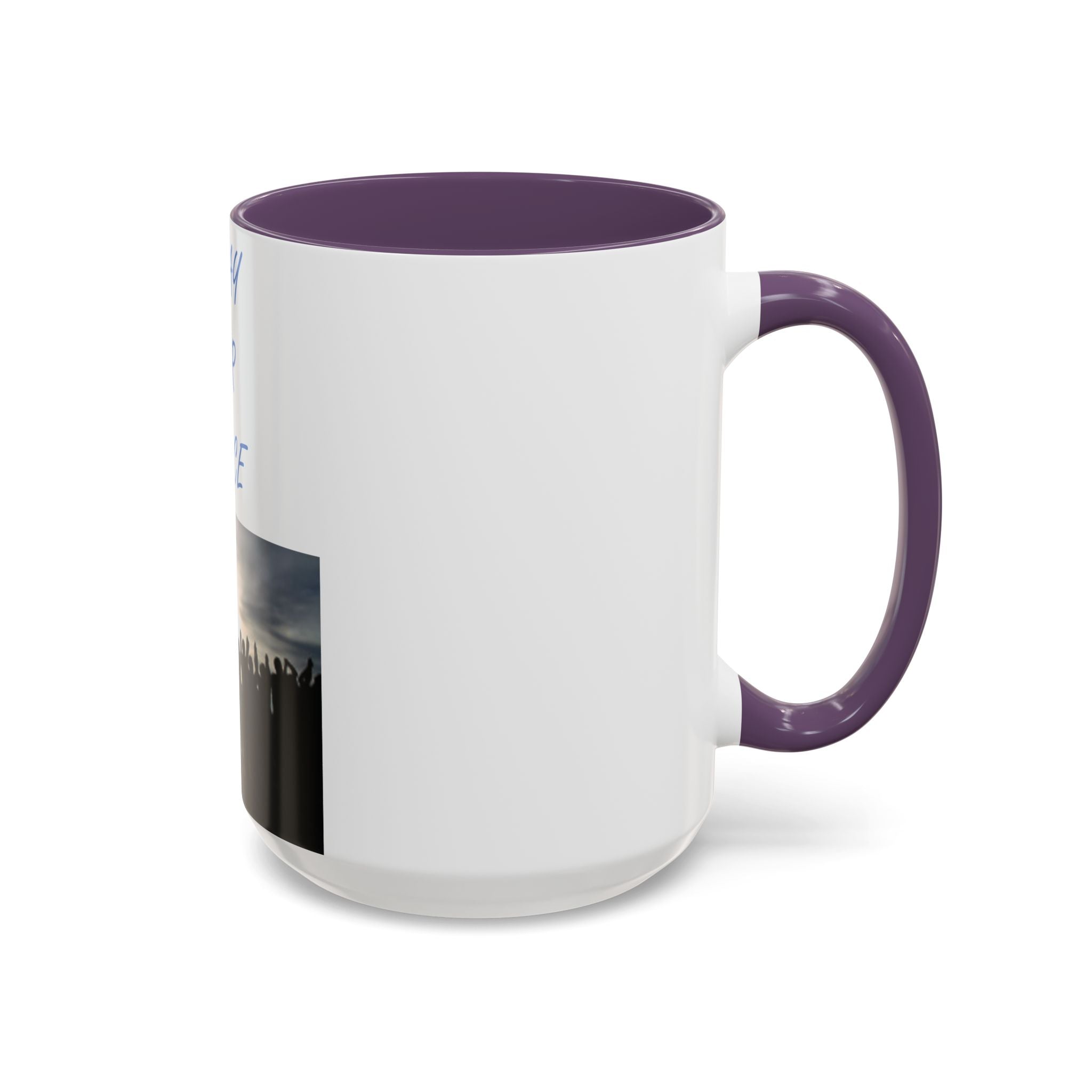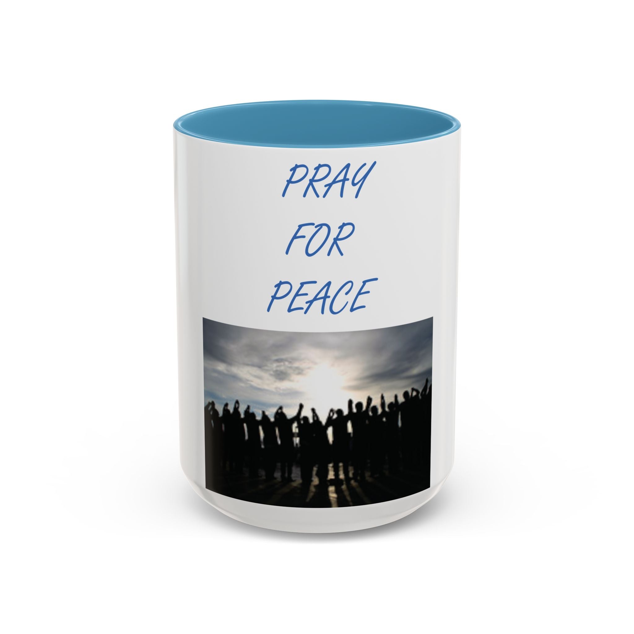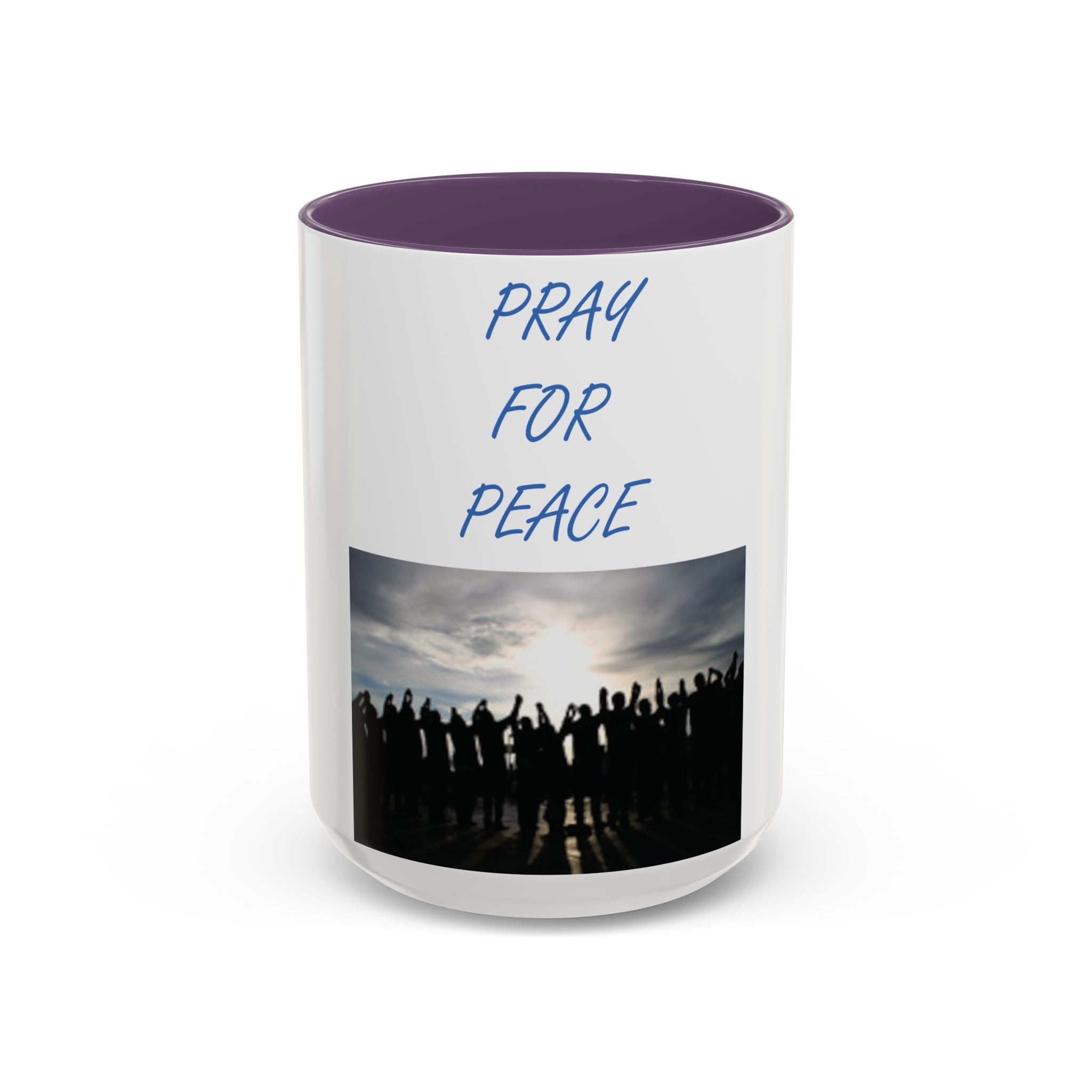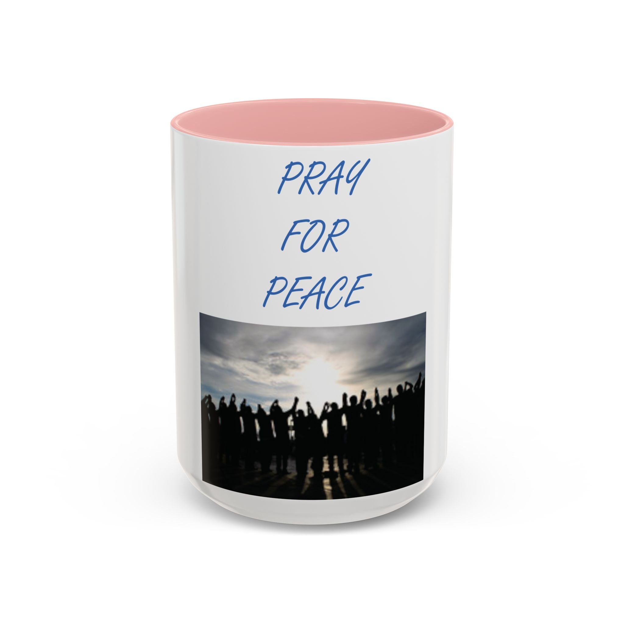 Start your morning with purpose and unity, thanks to this vibrant Accent Coffee Mug featuring the uplifting design: "Pray for Peace." The artwork portrays a group of individuals standing together, facing a radiant rising sun with arms uplifted in prayer—a beautiful representation of harmony and solidarity. This design resonates with free spirits, flower children, and advocates of social justice.