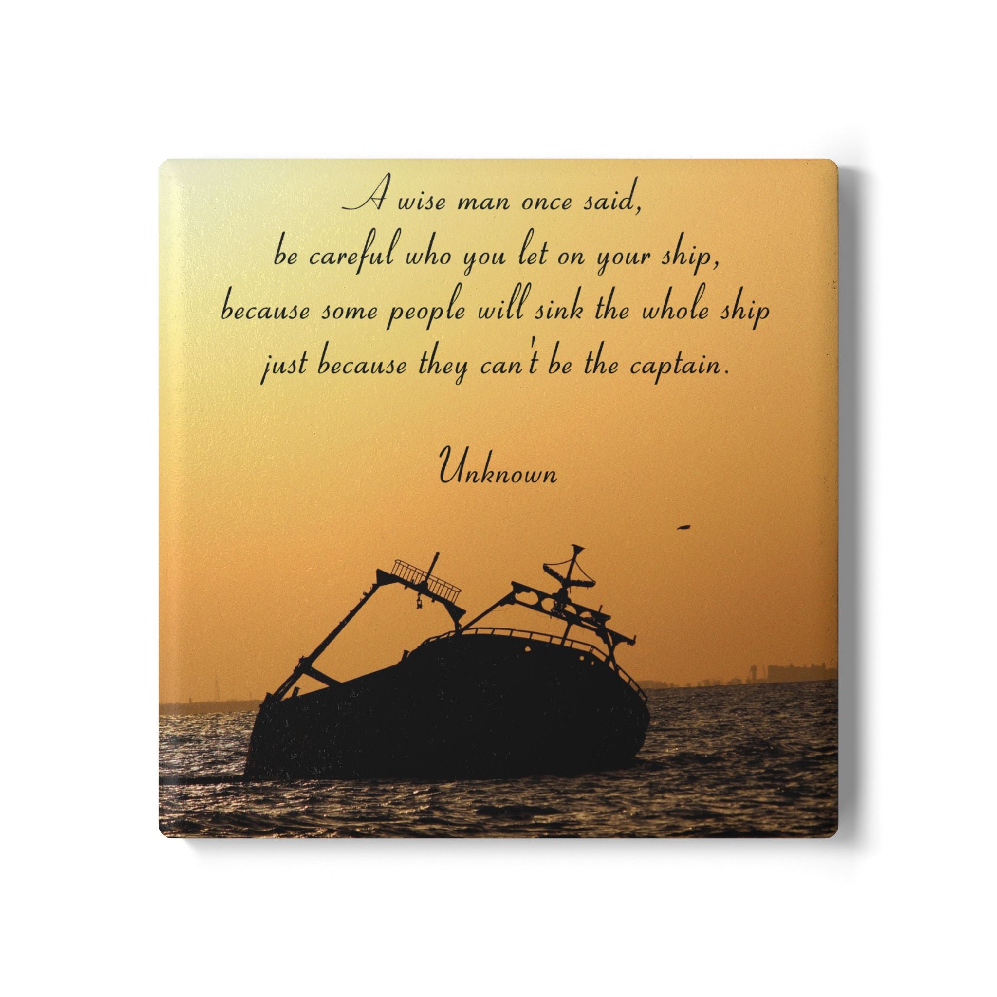 Protect your surfaces with elegance and meaning through these striking Ceramic Coasters, featuring a thought-provoking design by Judith Ann Dykeman. Against a vivid sunset sky, the dark silhouette of a ship sinking creates a moment of both beauty and caution. Above the scene, the poignant quote reads: 'A wise man once said, be careful who you let on your ship, because some people will sink the whole ship just because they can't be captain.' This design serves as a timeless reminder of the importance of choosing companions wisely, resonating with wisdom and powerful imagery.