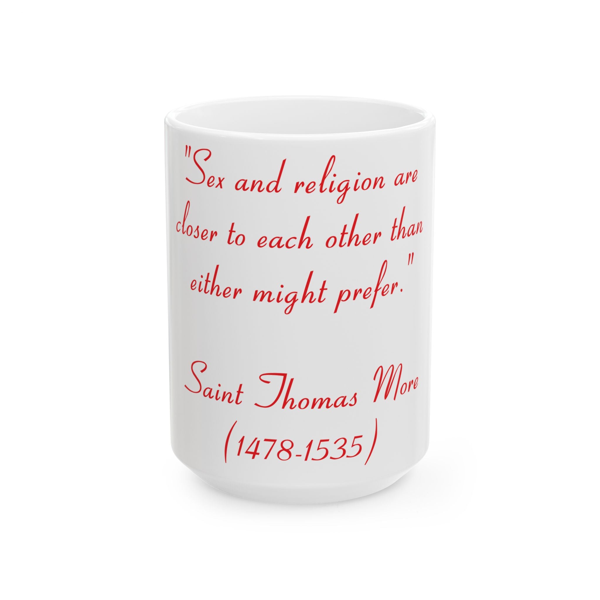 Start your day with a mug that sparks conversation and introspection. Featuring the profound quote by St. Thomas More, “Sex and religion are closer to each other than either might prefer,” this ceramic mug invites you to explore the intricate relationship between spirituality and human experience.