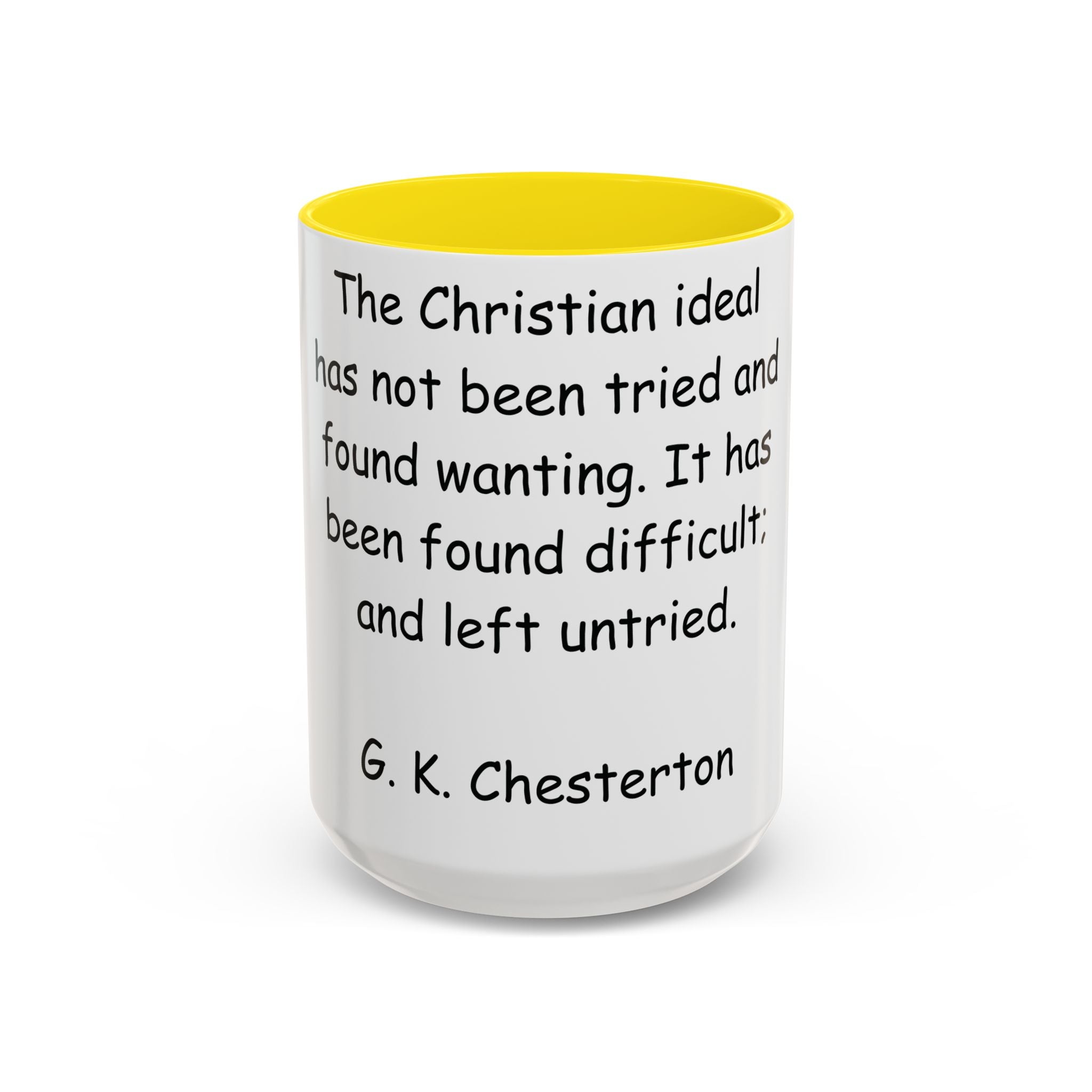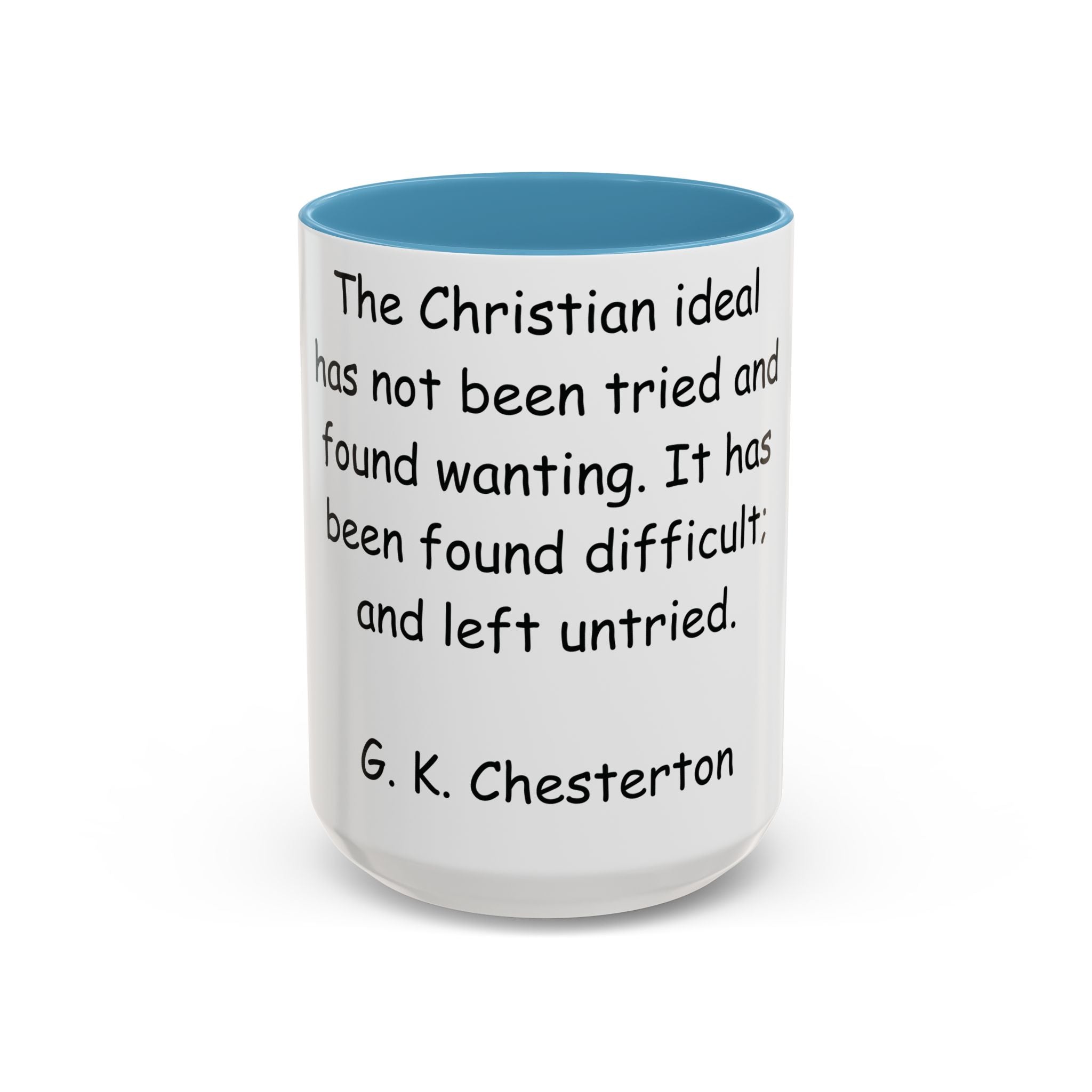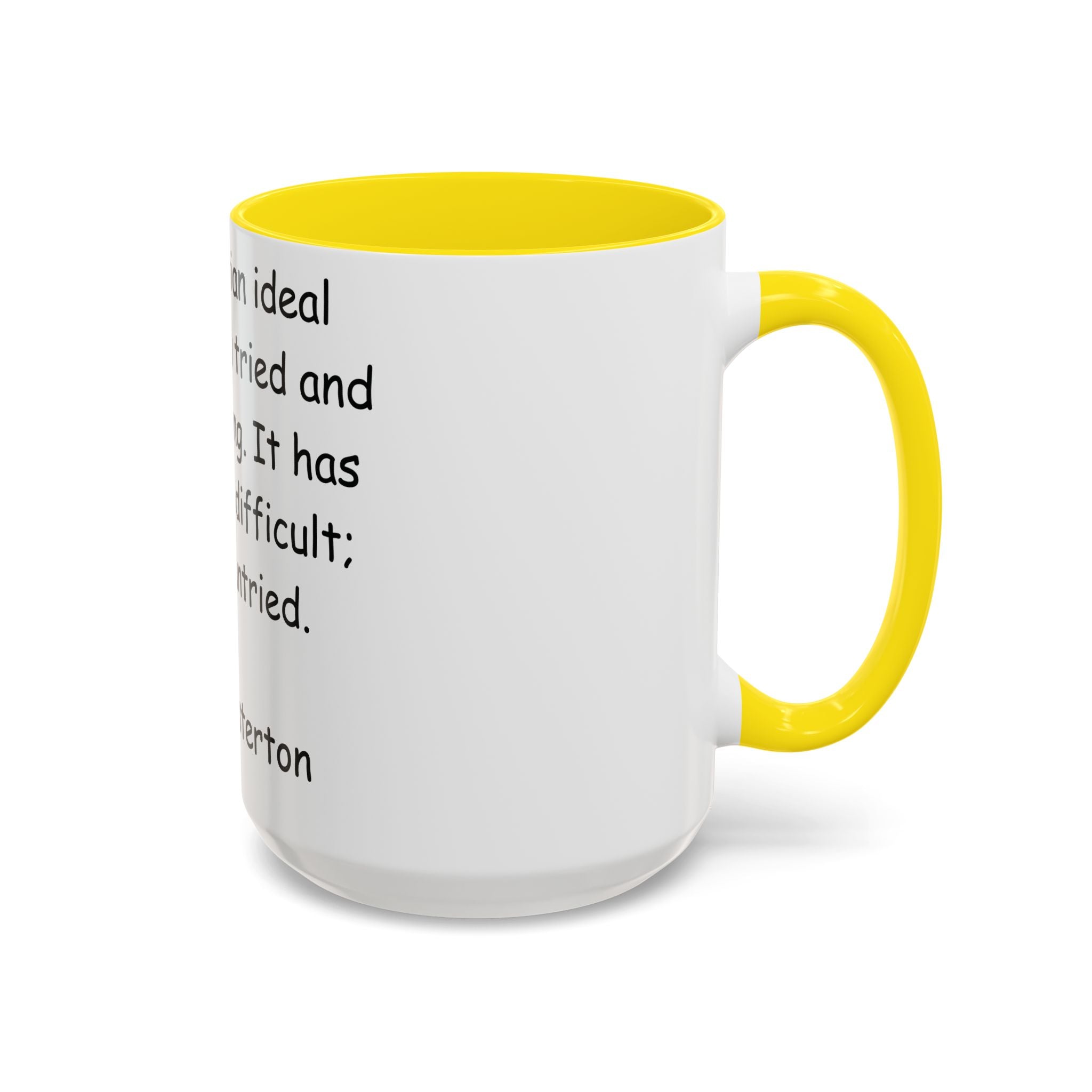 Start each day with inspiration and purpose. This Accent Coffee Mug features a thought-provoking quote by G.K. Chesterton. The vibrant design and glossy finish bring this powerful message to life, making every sip a moment of reflection and warmth. Whether enjoying cozy mornings at home, coffee breaks at work, or casual gatherings, this mug invites meaningful conversations. Perfect for personal use or as a gift, it suits occasions like birthdays, holidays, or simply showing you care. Bring depth and personality to your daily routine with this unique, inspiring piece.