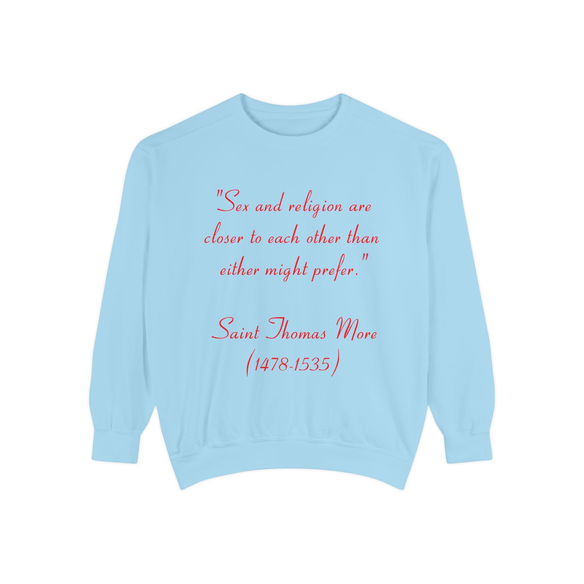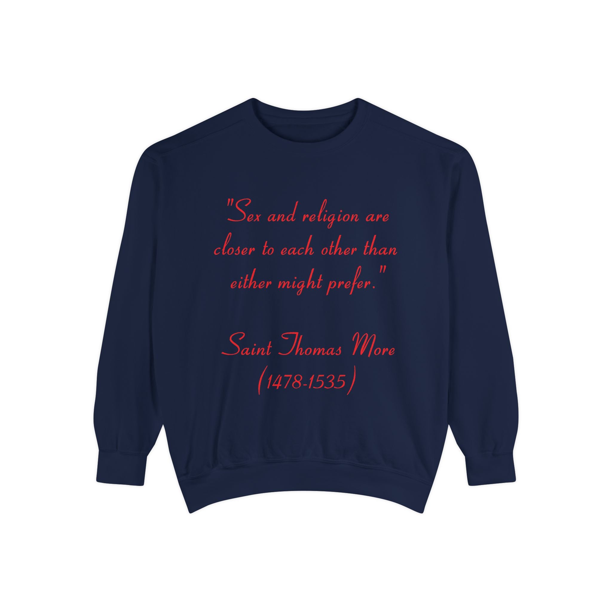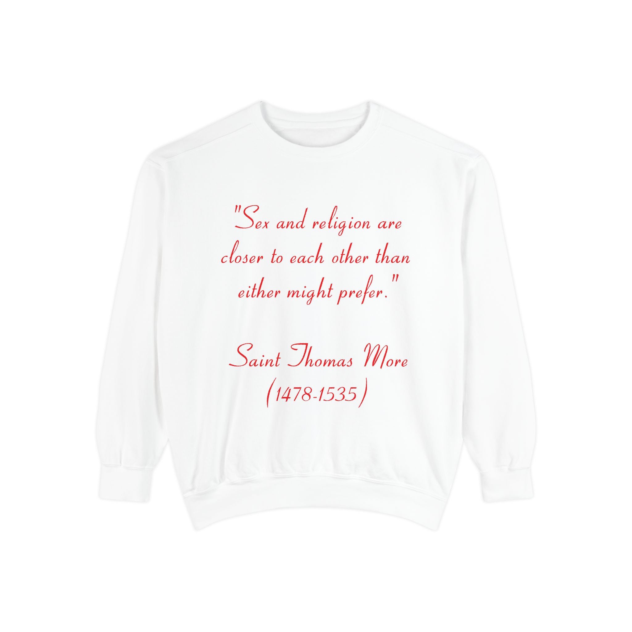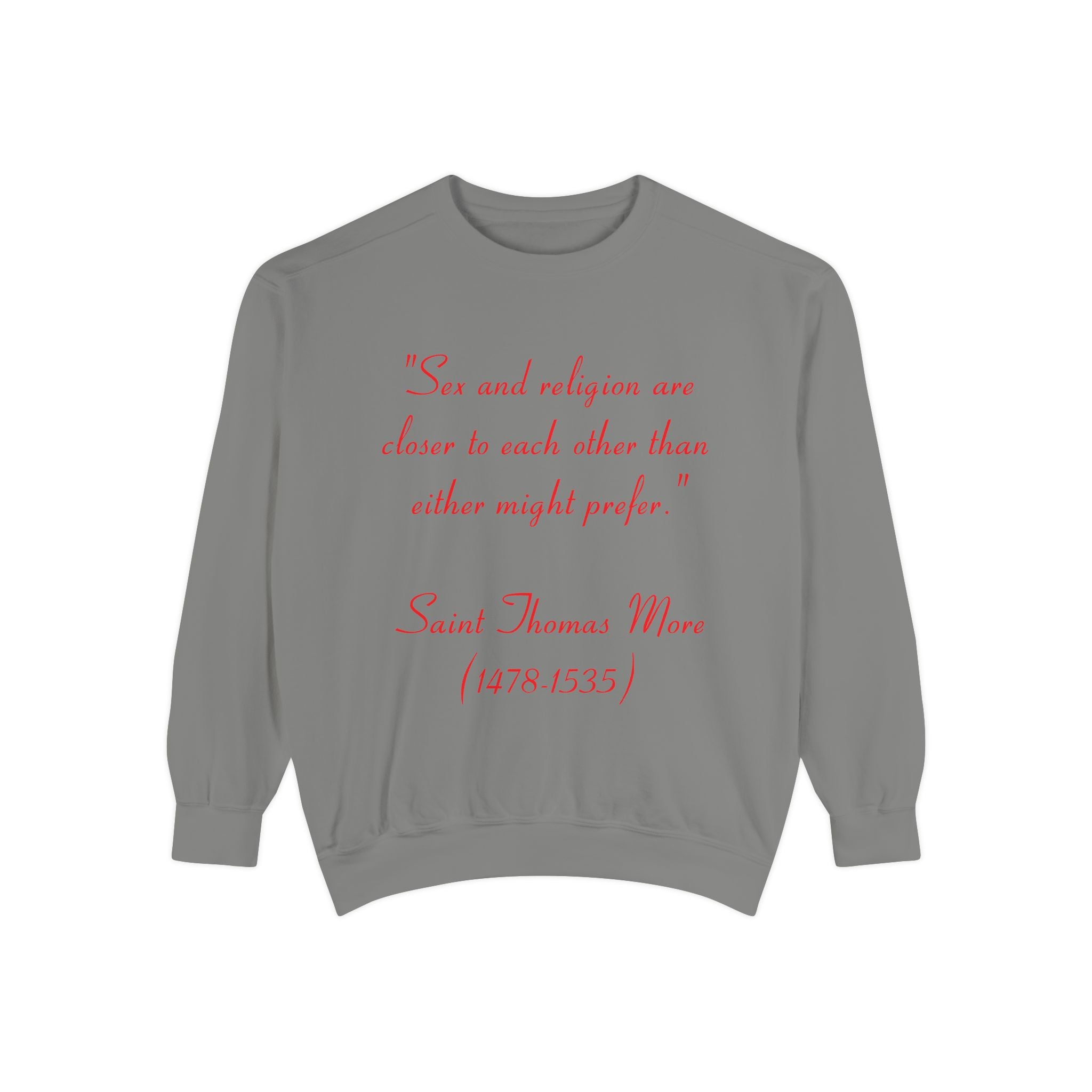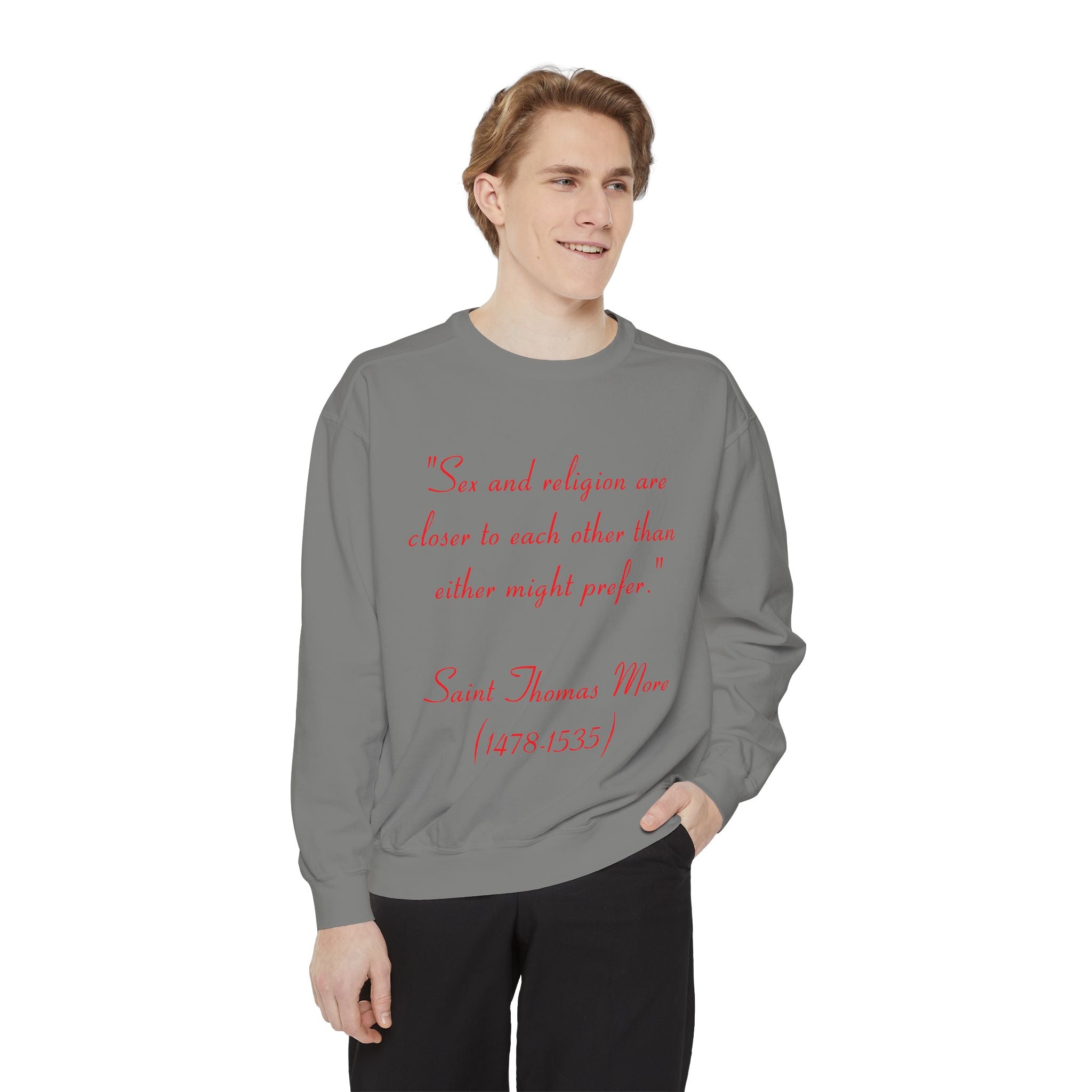 This garment-dyed unisex sweatshirt offers the perfect union of relaxed style and thought-provoking design. Featuring St. Thomas More’s profound quote, “Sex and religion are closer to each other than either might prefer,” it invites reflection on the intersection of spirituality and the human experience. Both cozy and bold, this sweatshirt is more than just apparel—it’s a statement piece that sparks meaningful conversations.