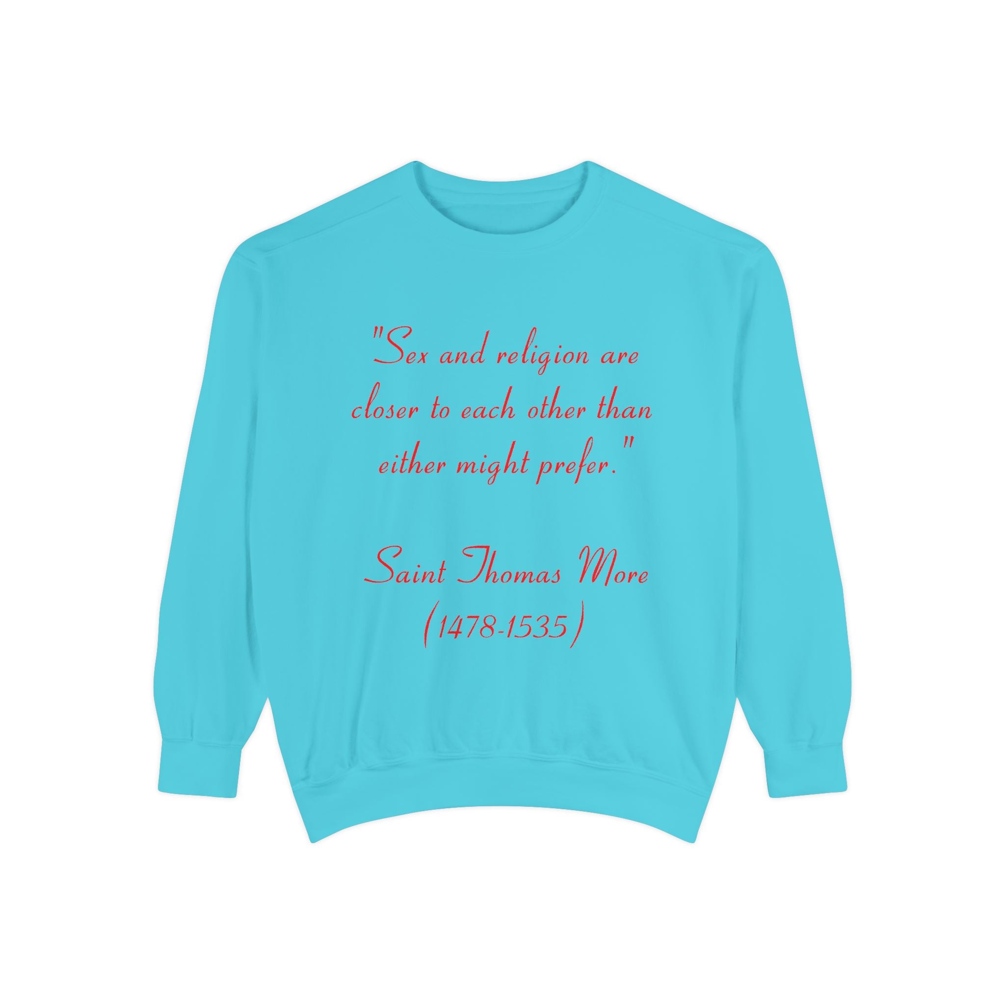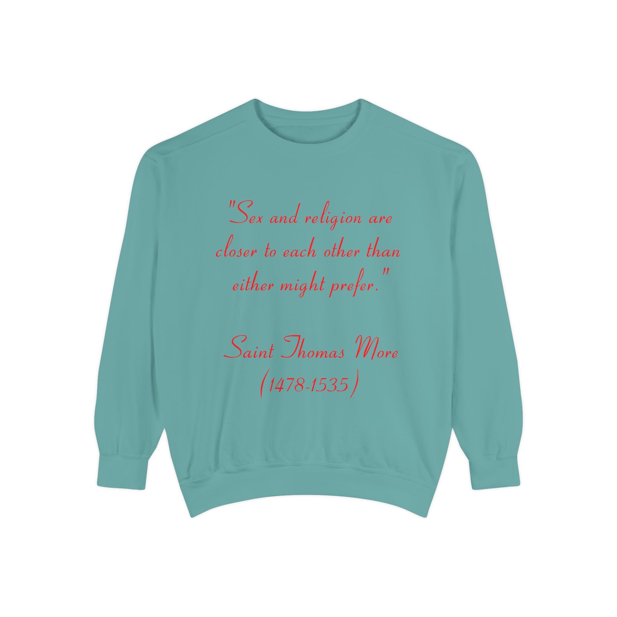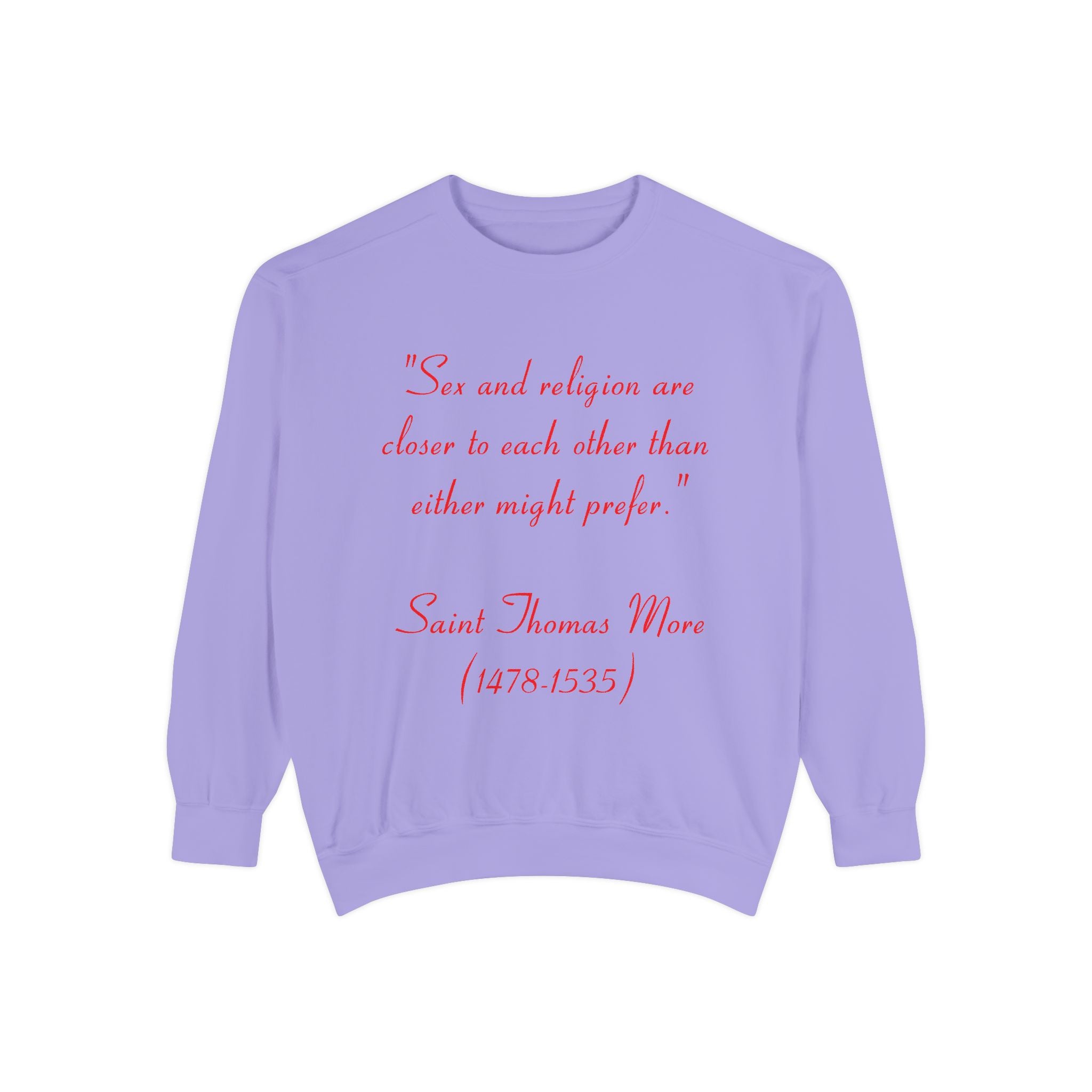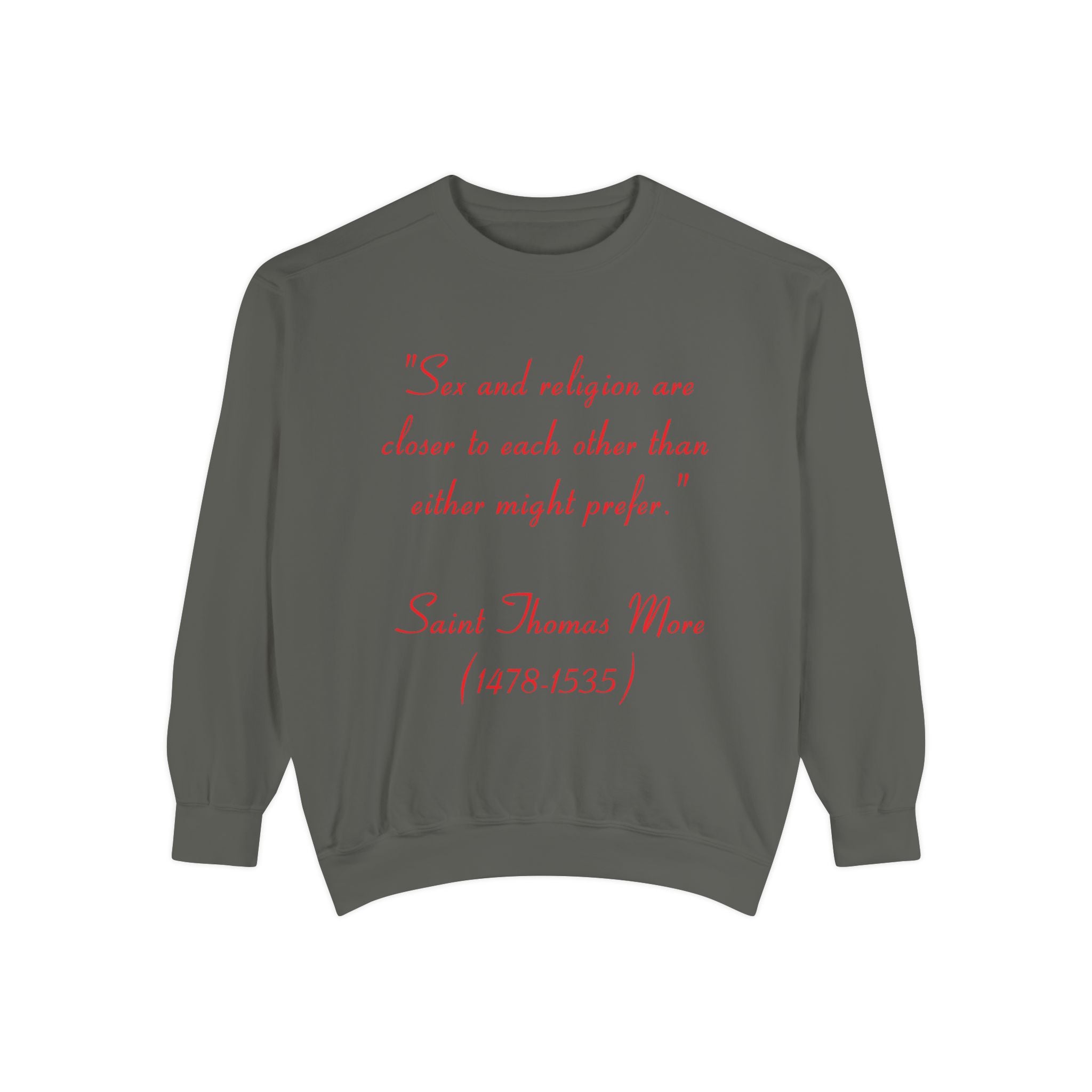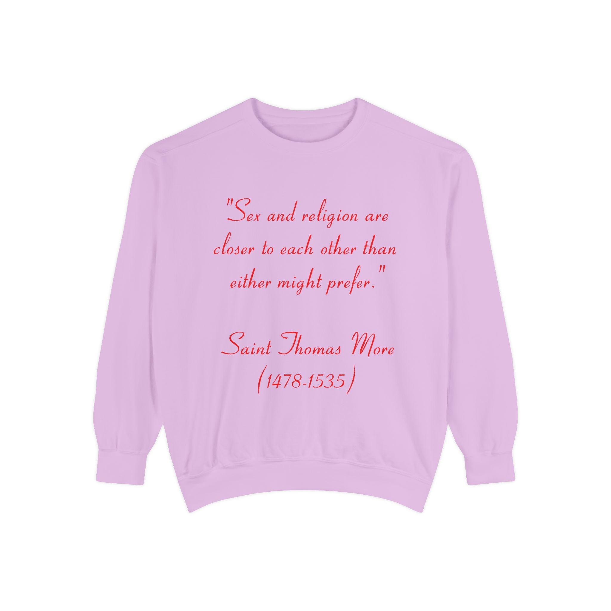 This garment-dyed unisex sweatshirt offers the perfect union of relaxed style and thought-provoking design. Featuring St. Thomas More’s profound quote, “Sex and religion are closer to each other than either might prefer,” it invites reflection on the intersection of spirituality and the human experience. Both cozy and bold, this sweatshirt is more than just apparel—it’s a statement piece that sparks meaningful conversations.
