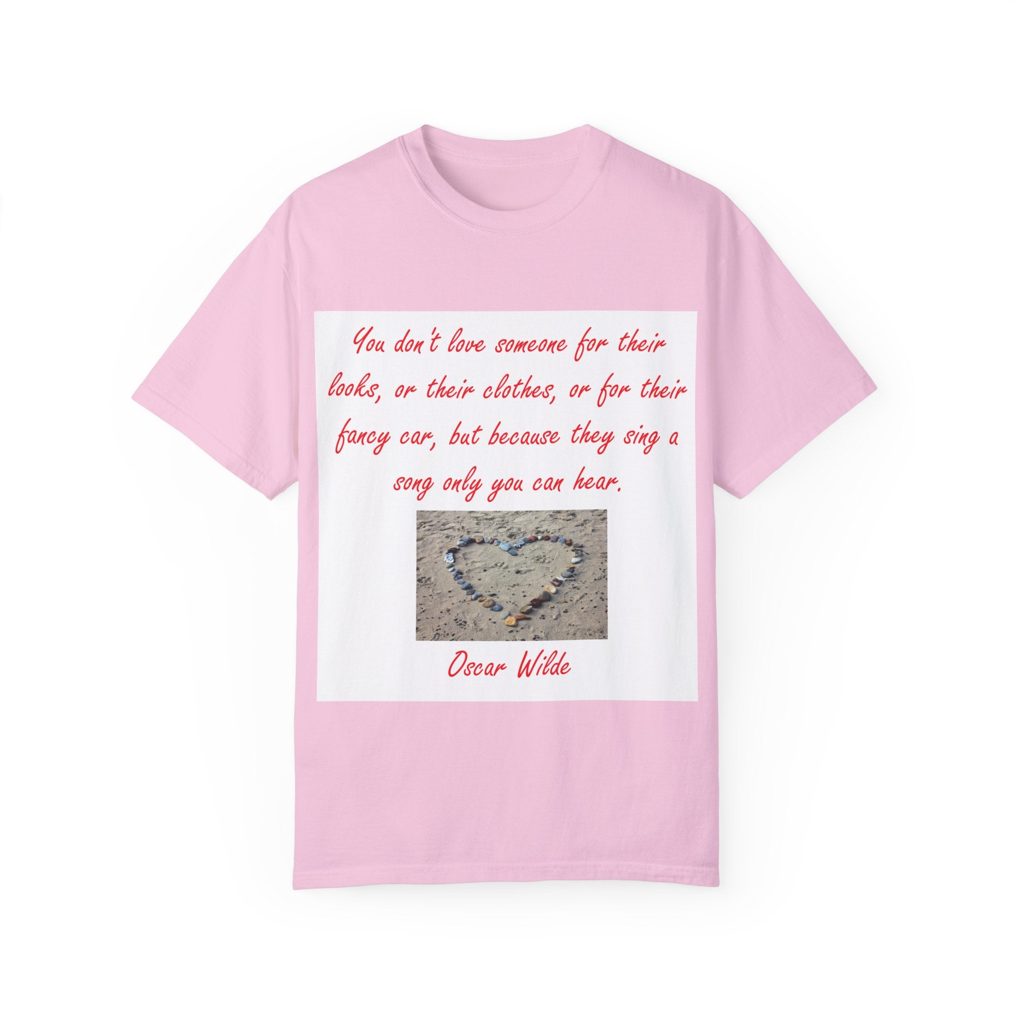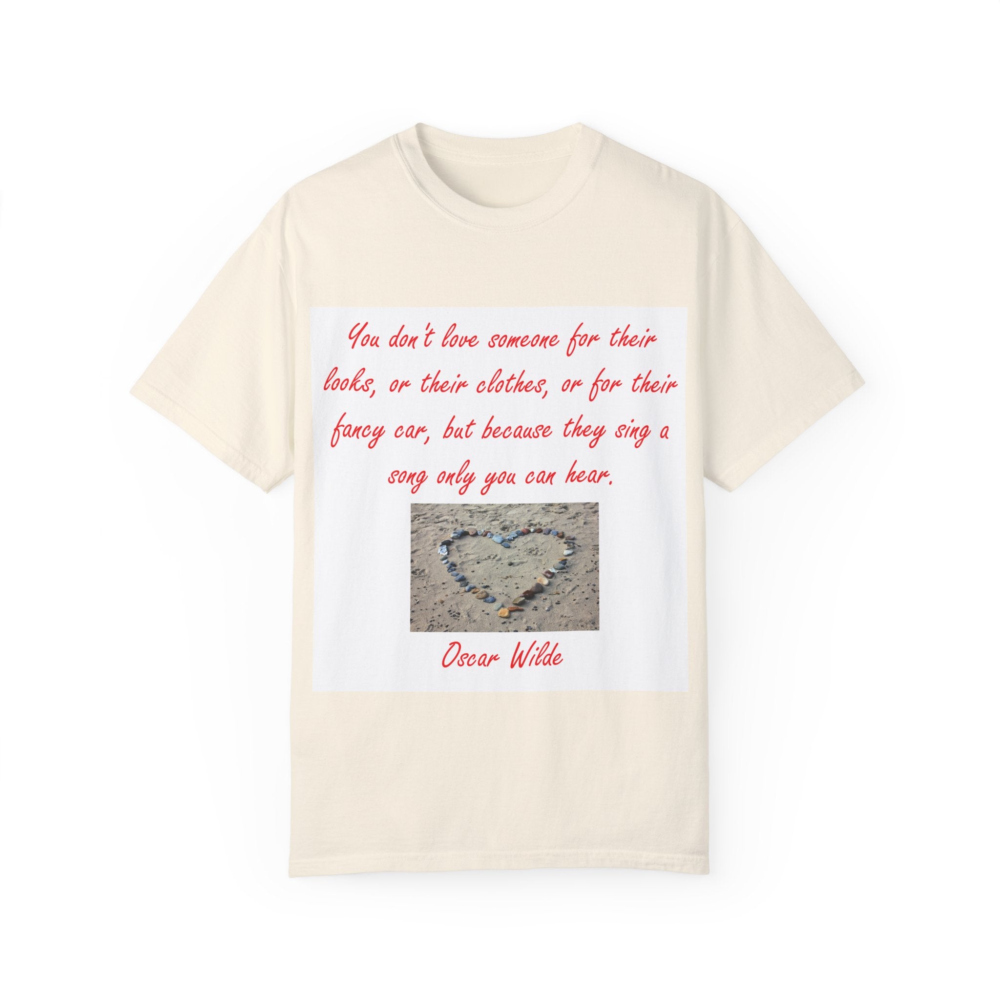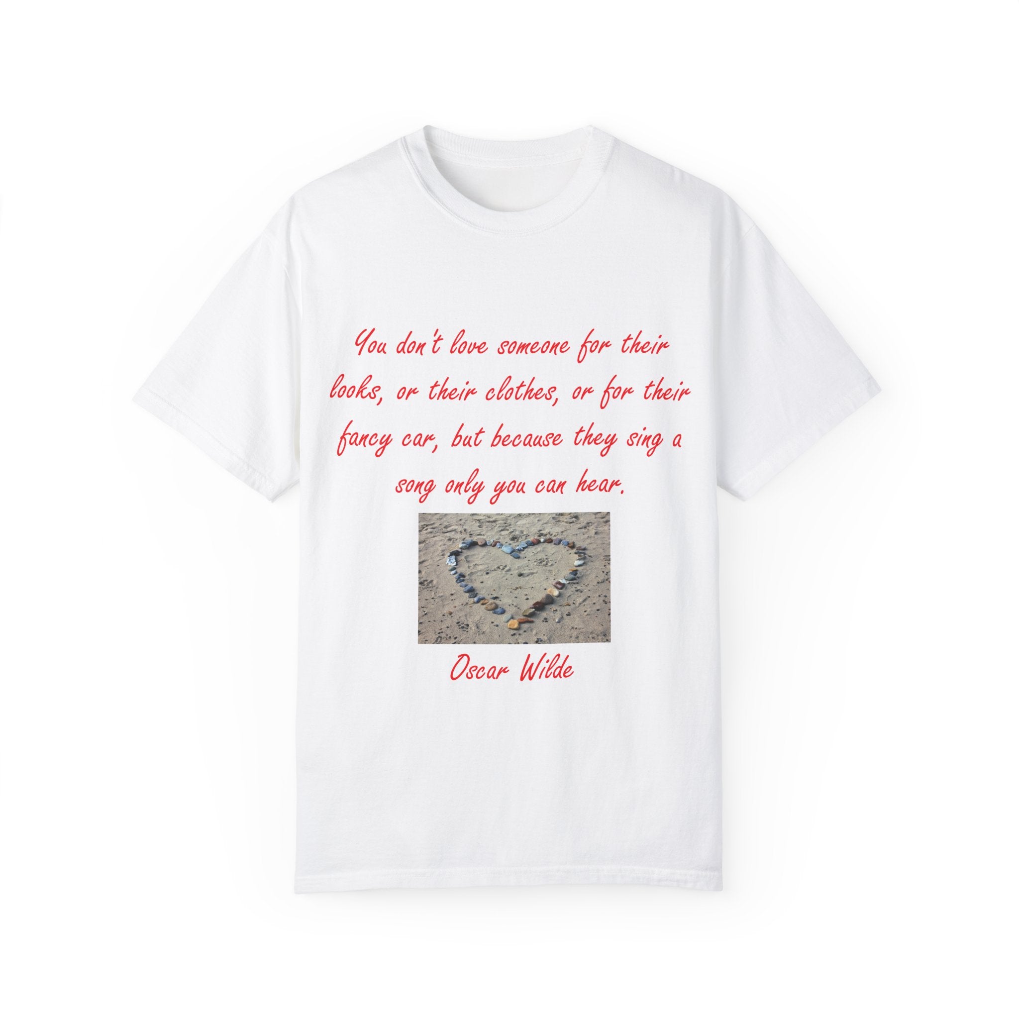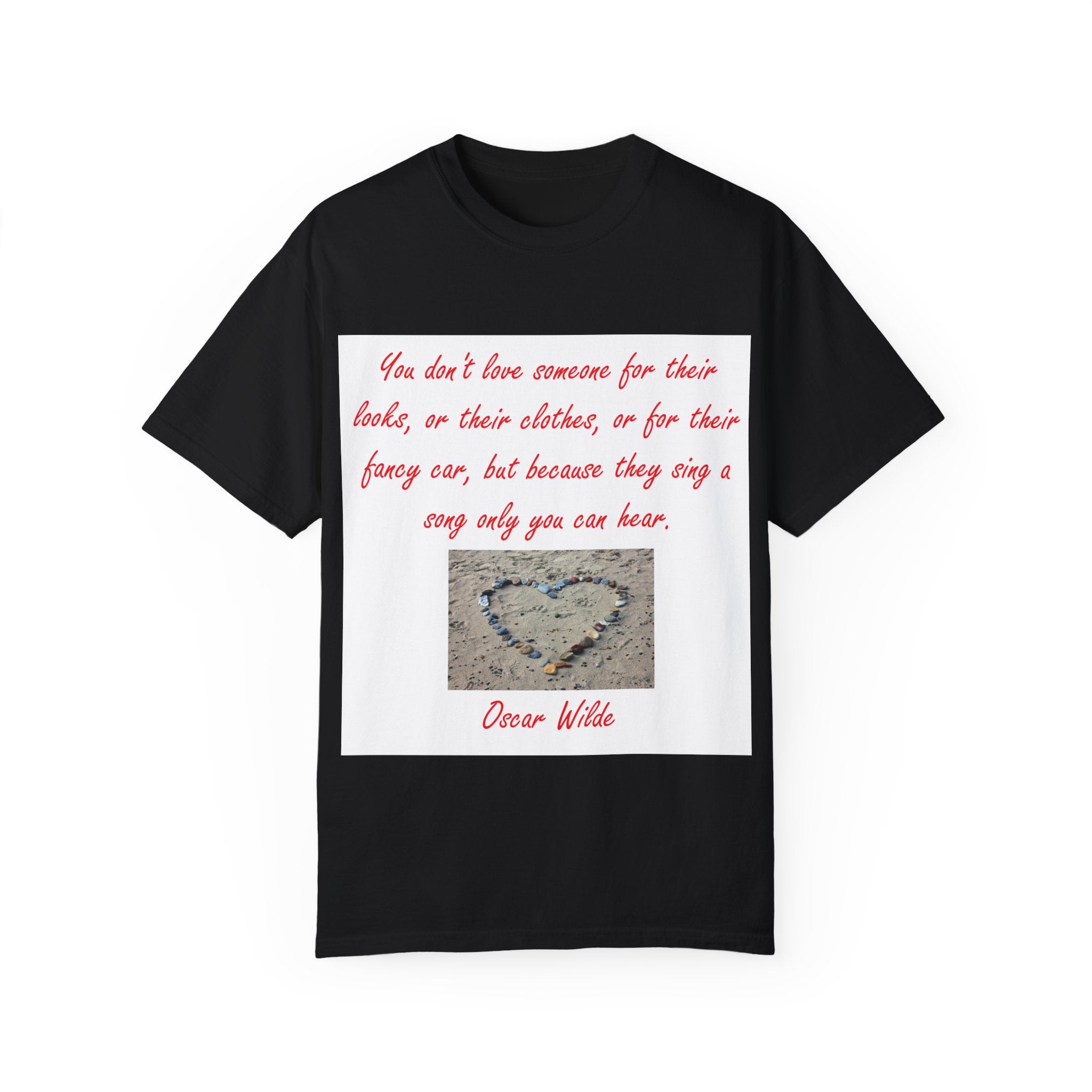 What truly sets this shirt apart is its meaningful design, featuring Oscar Wilde’s heartfelt quote: 'You don't love someone for their looks, or their clothes, or for their fancy car, but because they sing a song only you can hear.' Paired with a serene photograph of a heart outline crafted from small stones on a sandy beach, it evokes themes of love, connection, and natural beauty. Perfect for fashion-forward individuals who value both comfort and depth, this T-shirt is more than just apparel—it’s a statement of individuality and timeless connection.