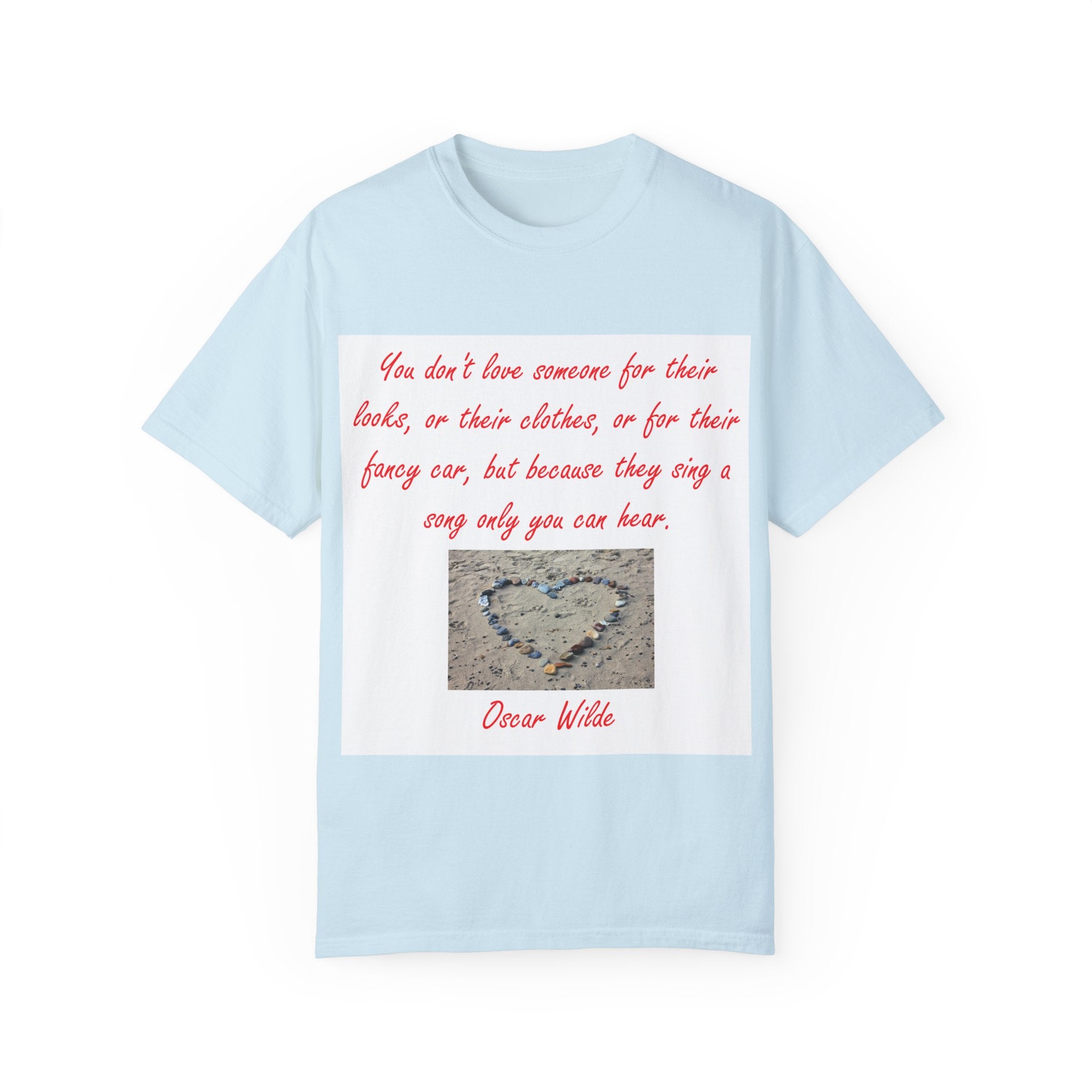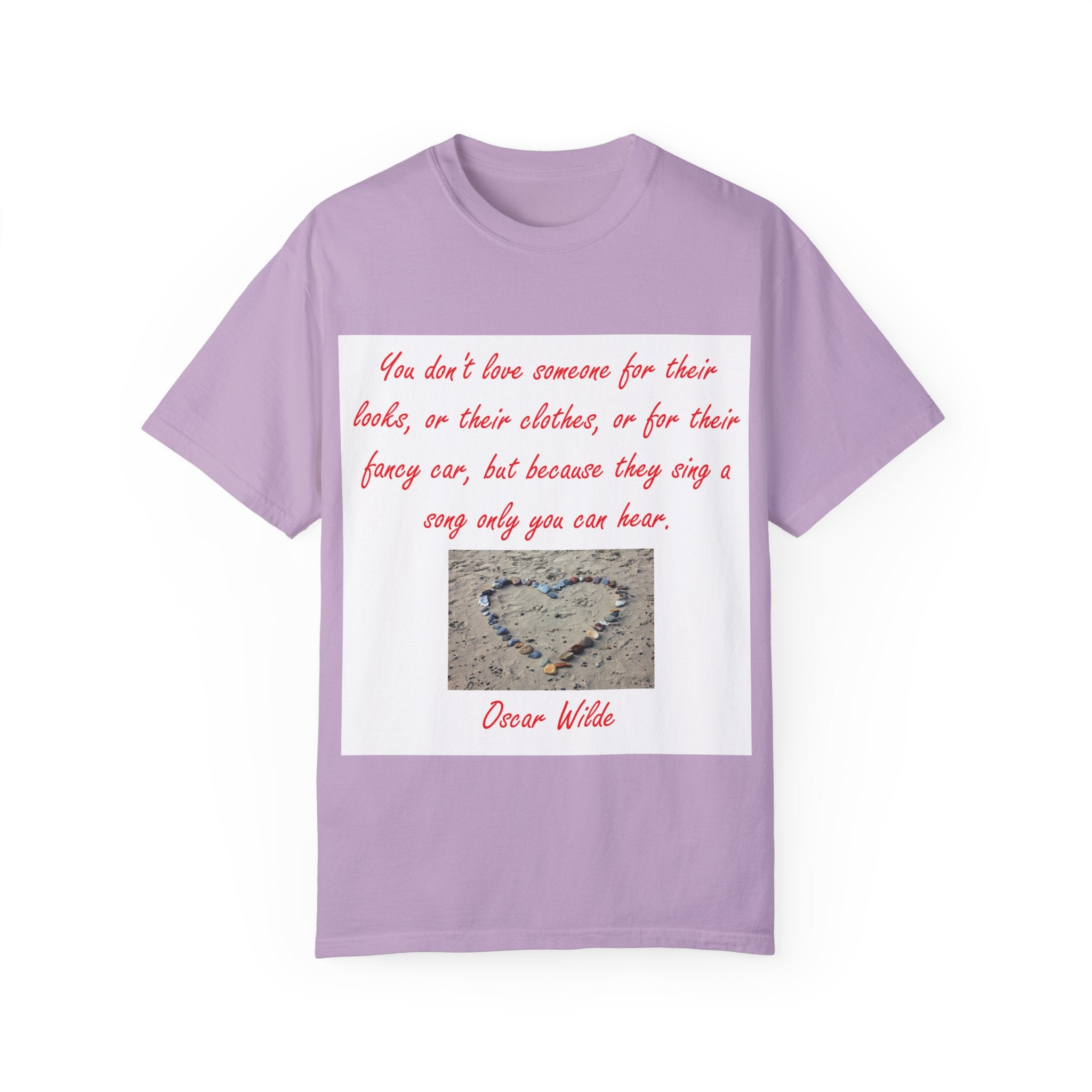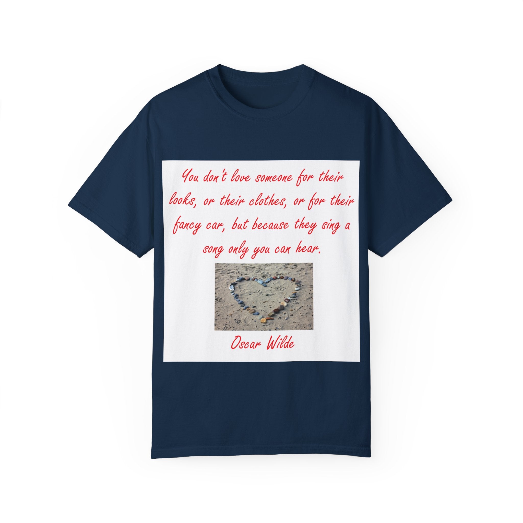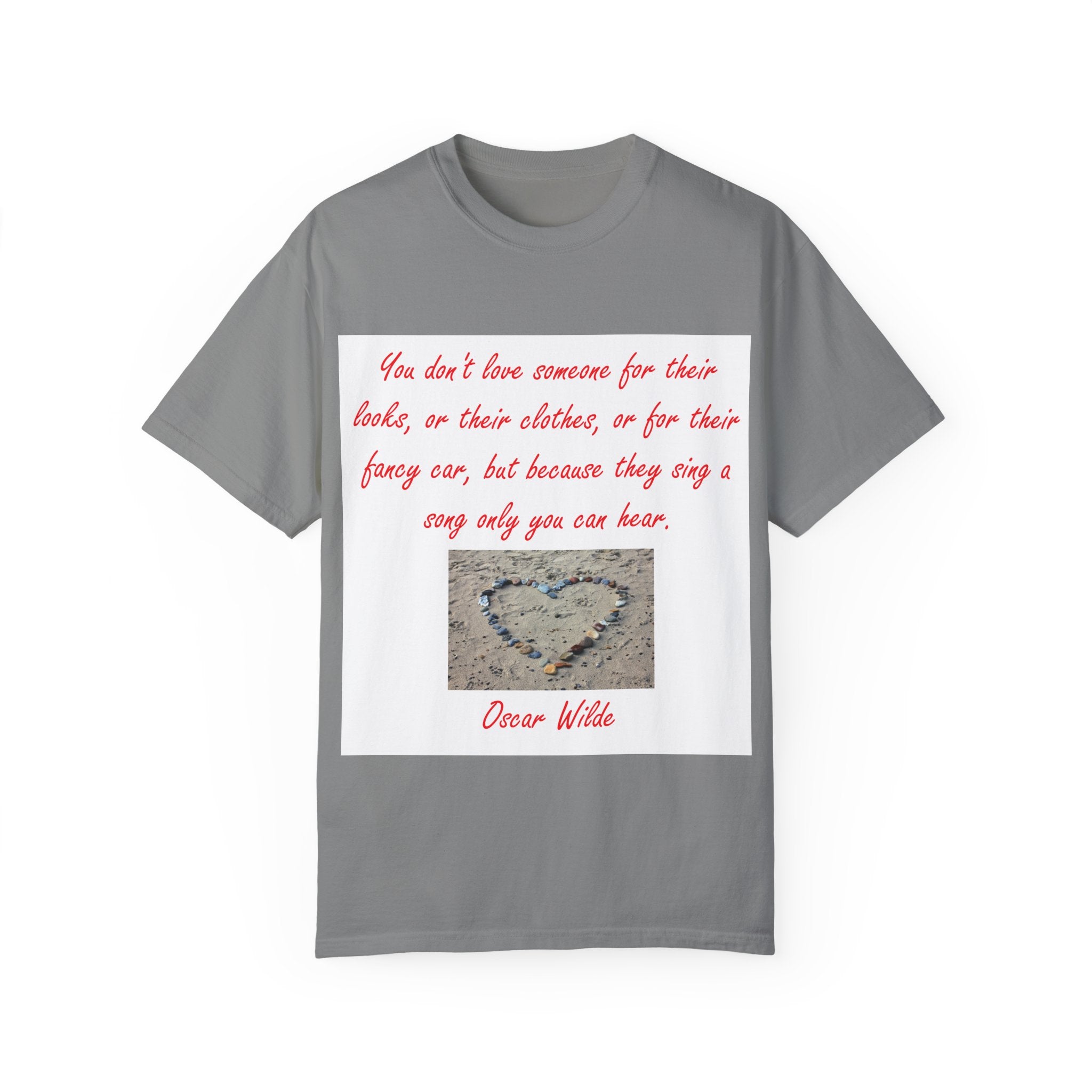 What truly sets this shirt apart is its meaningful design, featuring Oscar Wilde’s heartfelt quote: 'You don't love someone for their looks, or their clothes, or for their fancy car, but because they sing a song only you can hear.' Paired with a serene photograph of a heart outline crafted from small stones on a sandy beach, it evokes themes of love, connection, and natural beauty. Perfect for fashion-forward individuals who value both comfort and depth, this T-shirt is more than just apparel—it’s a statement of individuality and timeless connection.