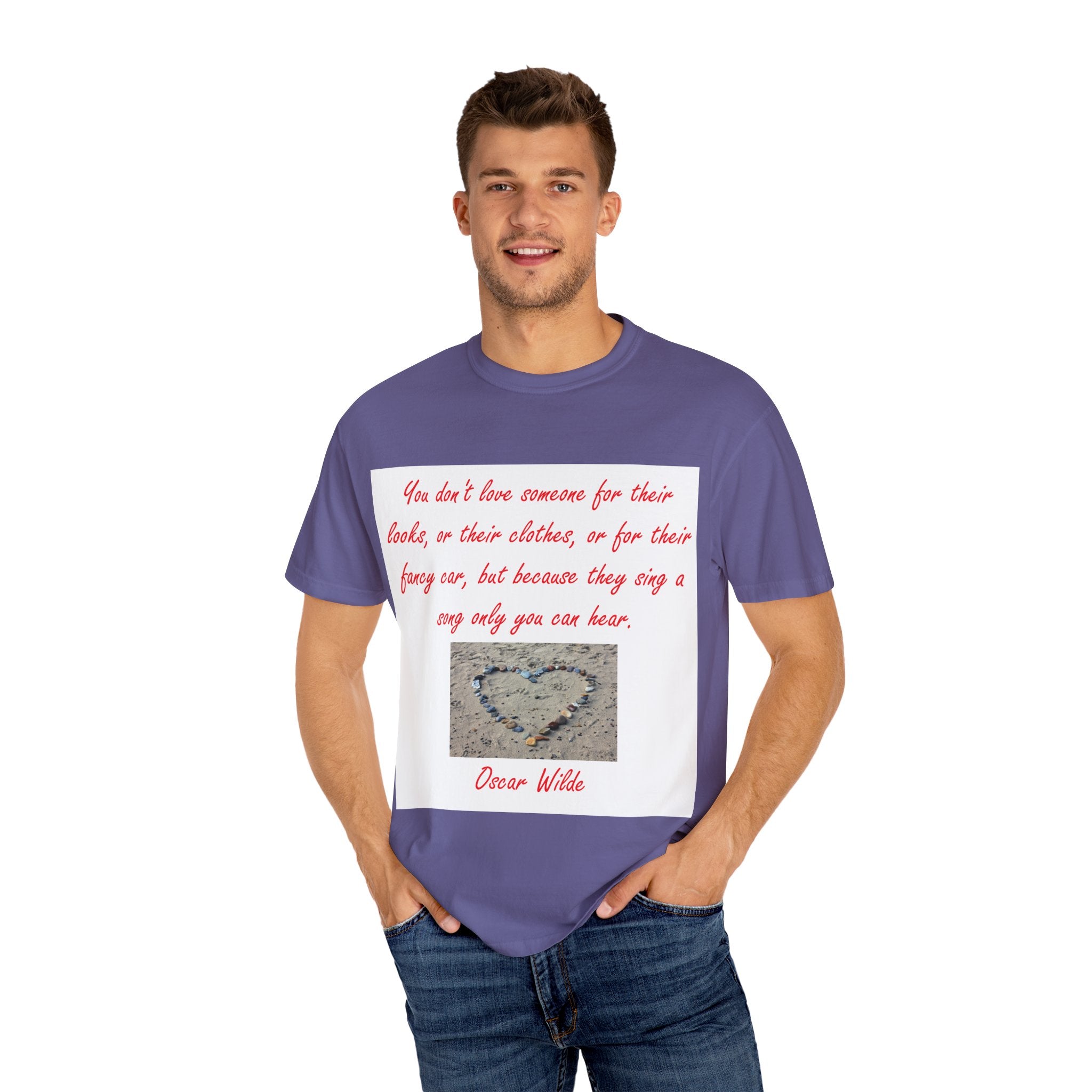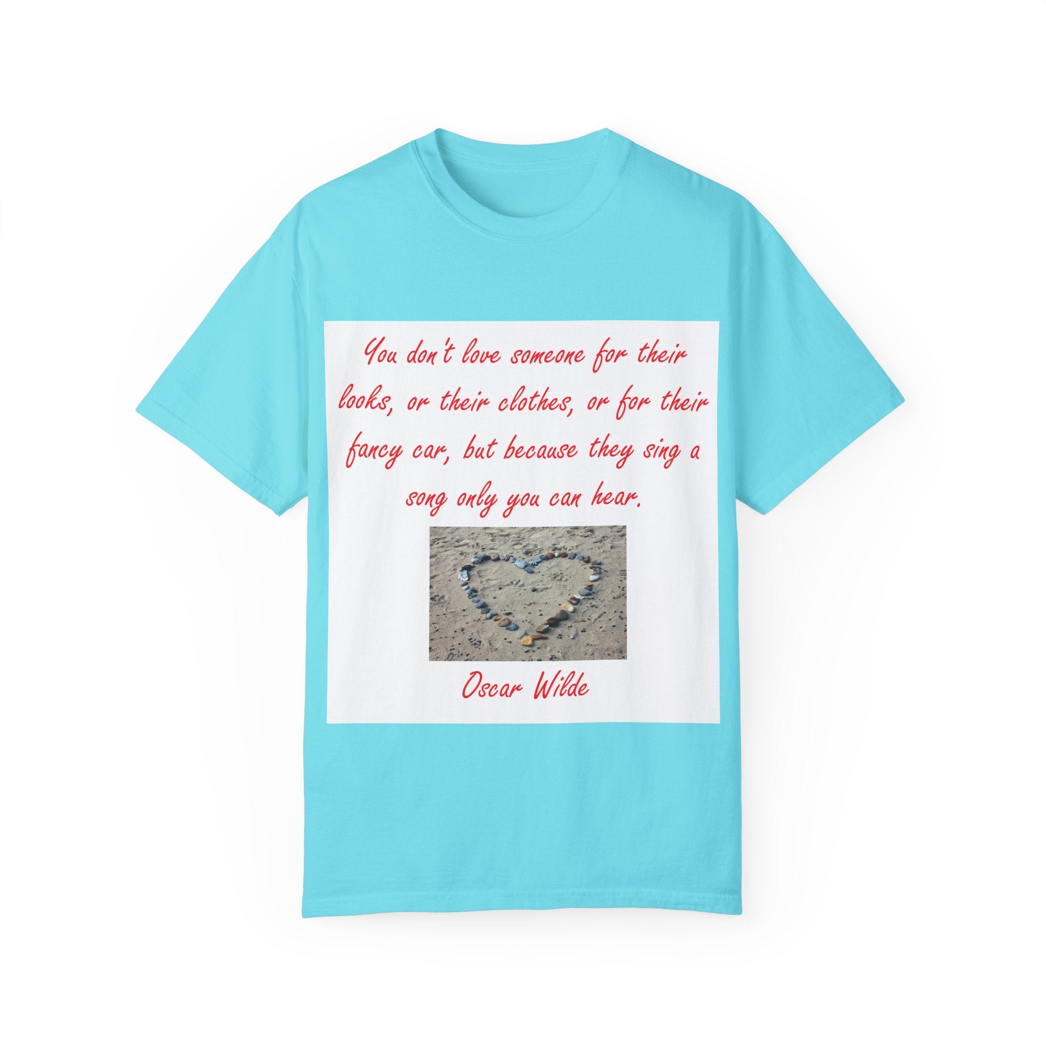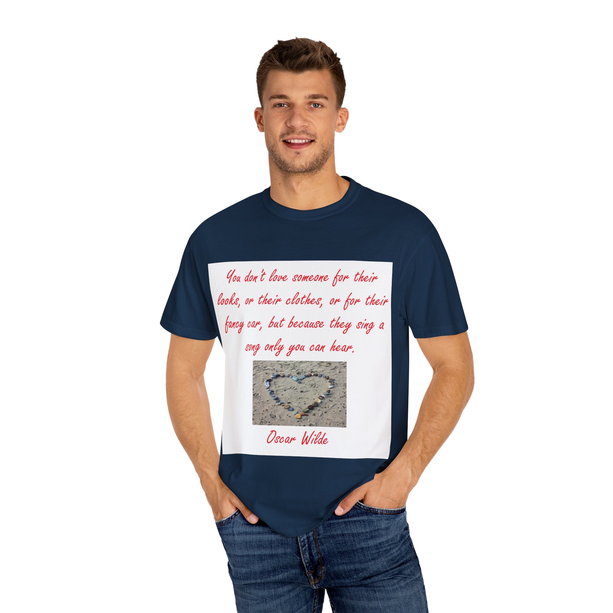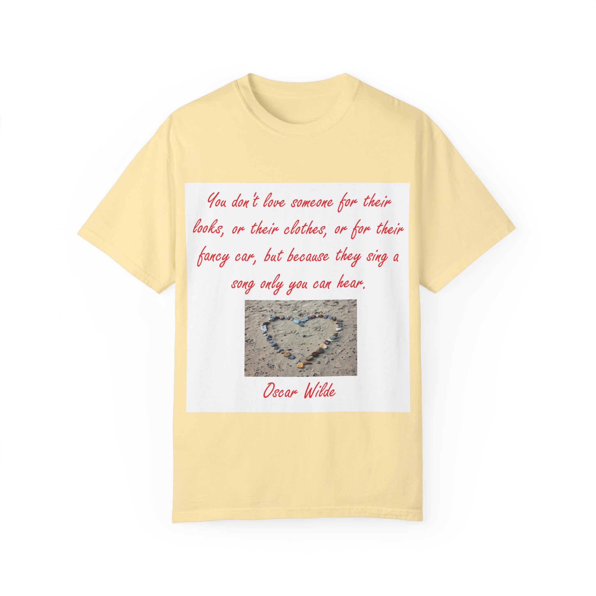 What truly sets this shirt apart is its meaningful design, featuring Oscar Wilde’s heartfelt quote: 'You don't love someone for their looks, or their clothes, or for their fancy car, but because they sing a song only you can hear.' Paired with a serene photograph of a heart outline crafted from small stones on a sandy beach, it evokes themes of love, connection, and natural beauty. Perfect for fashion-forward individuals who value both comfort and depth, this T-shirt is more than just apparel—it’s a statement of individuality and timeless connection.