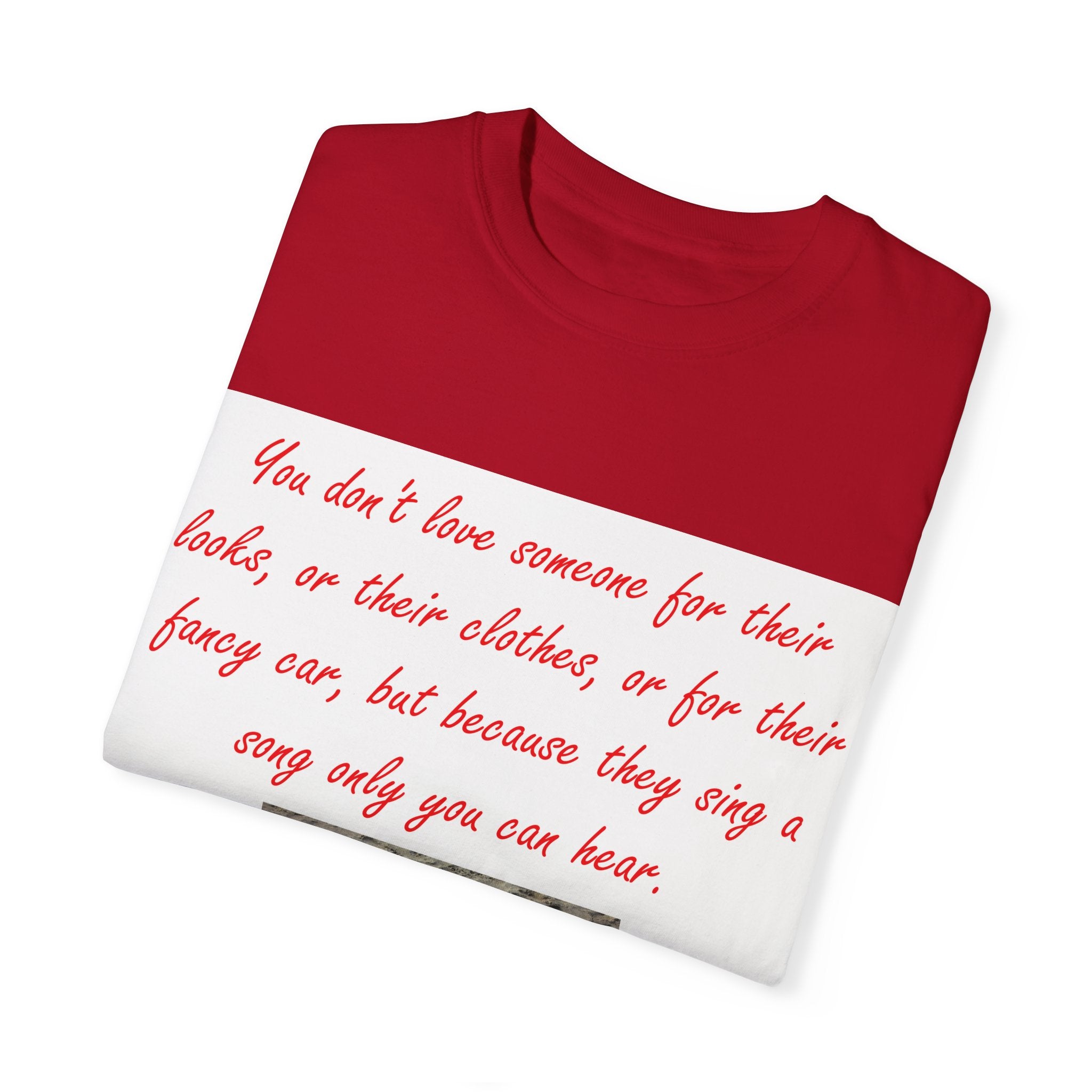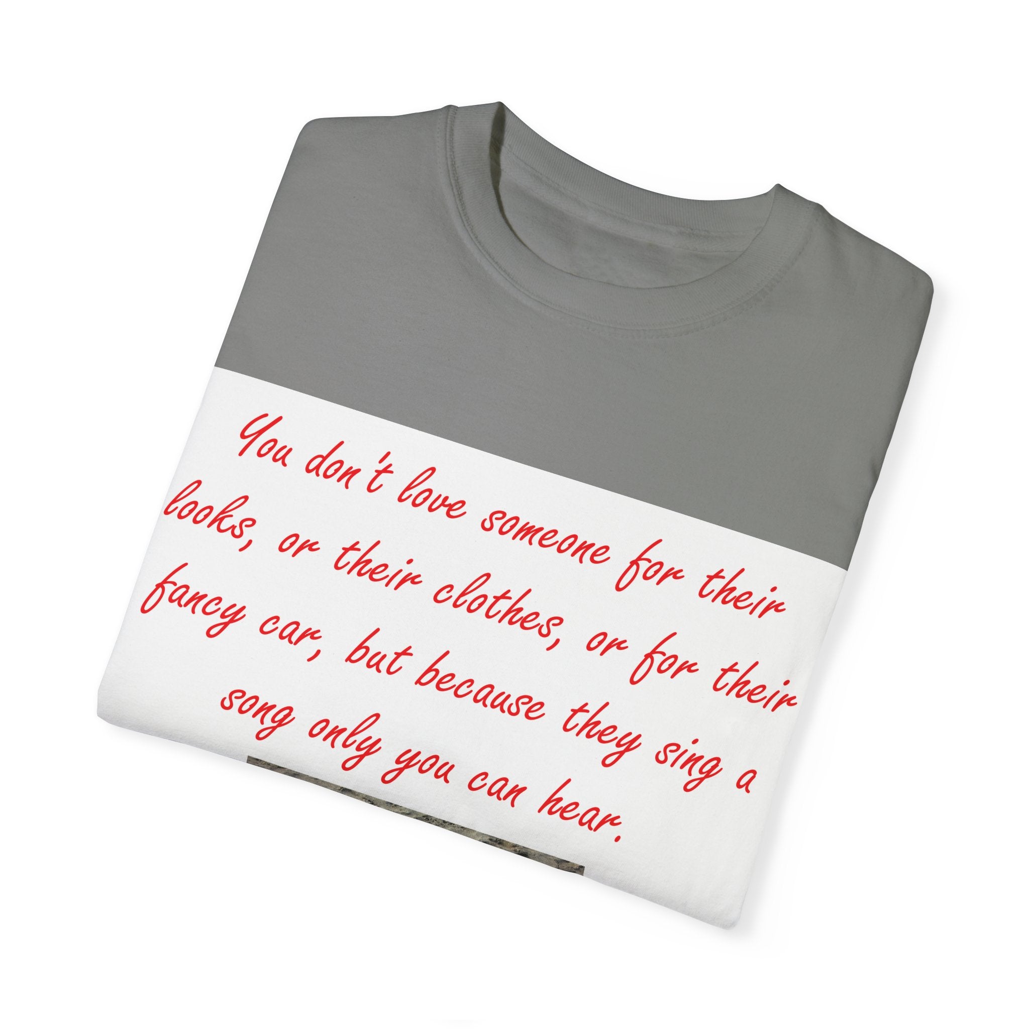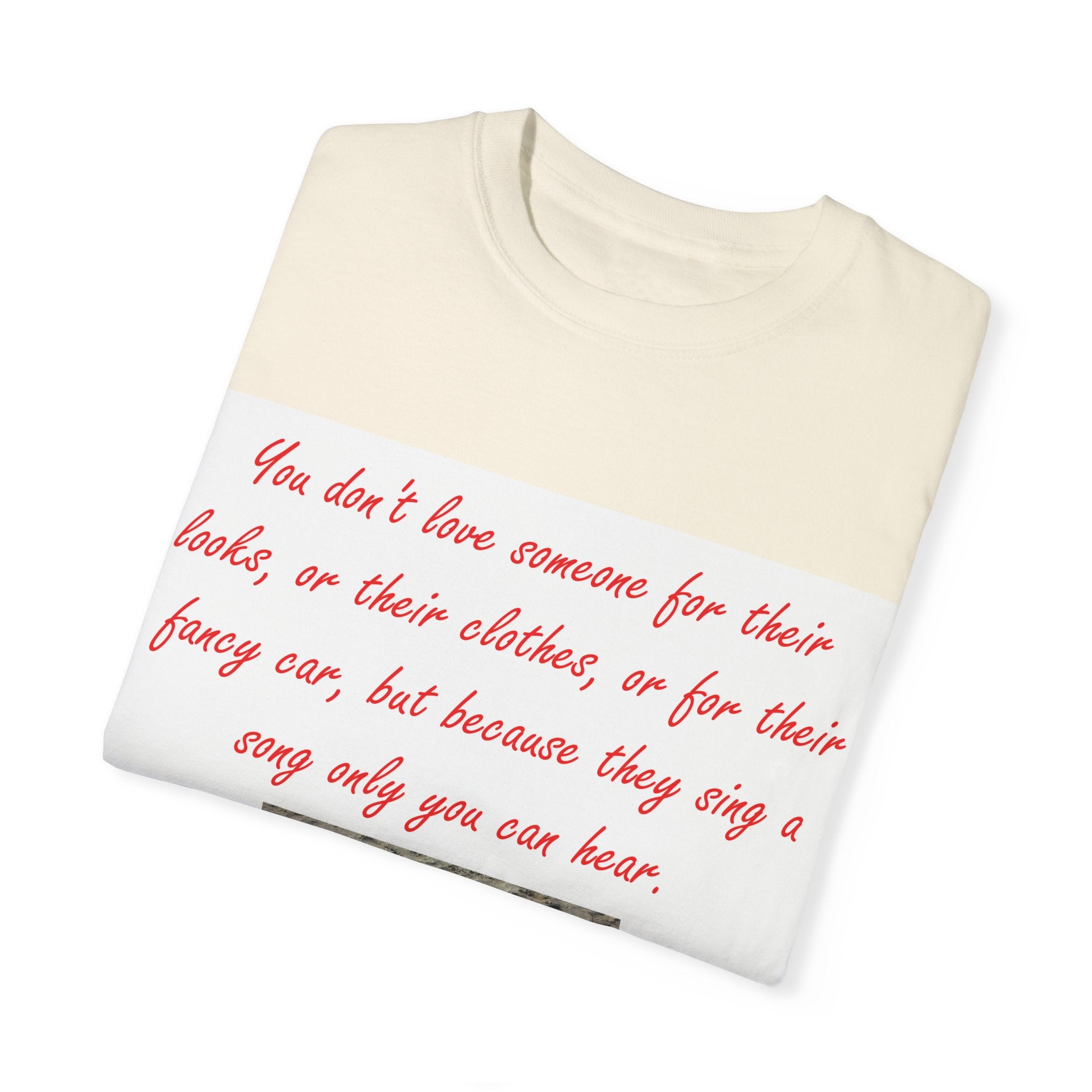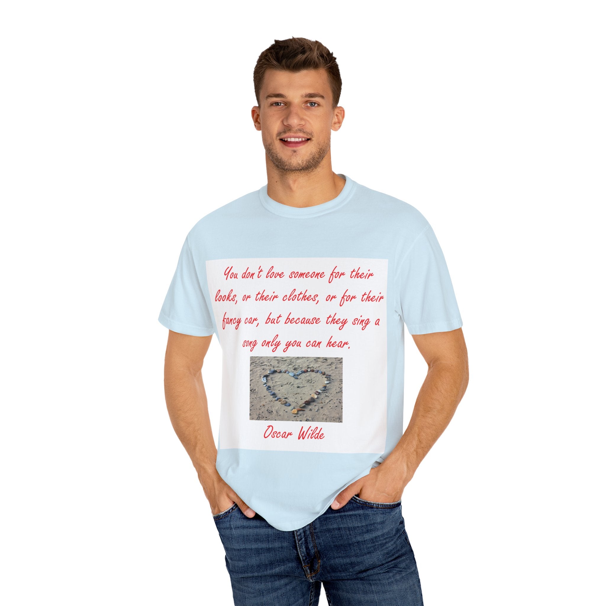 What truly sets this shirt apart is its meaningful design, featuring Oscar Wilde’s heartfelt quote: 'You don't love someone for their looks, or their clothes, or for their fancy car, but because they sing a song only you can hear.' Paired with a serene photograph of a heart outline crafted from small stones on a sandy beach, it evokes themes of love, connection, and natural beauty. Perfect for fashion-forward individuals who value both comfort and depth, this T-shirt is more than just apparel—it’s a statement of individuality and timeless connection.