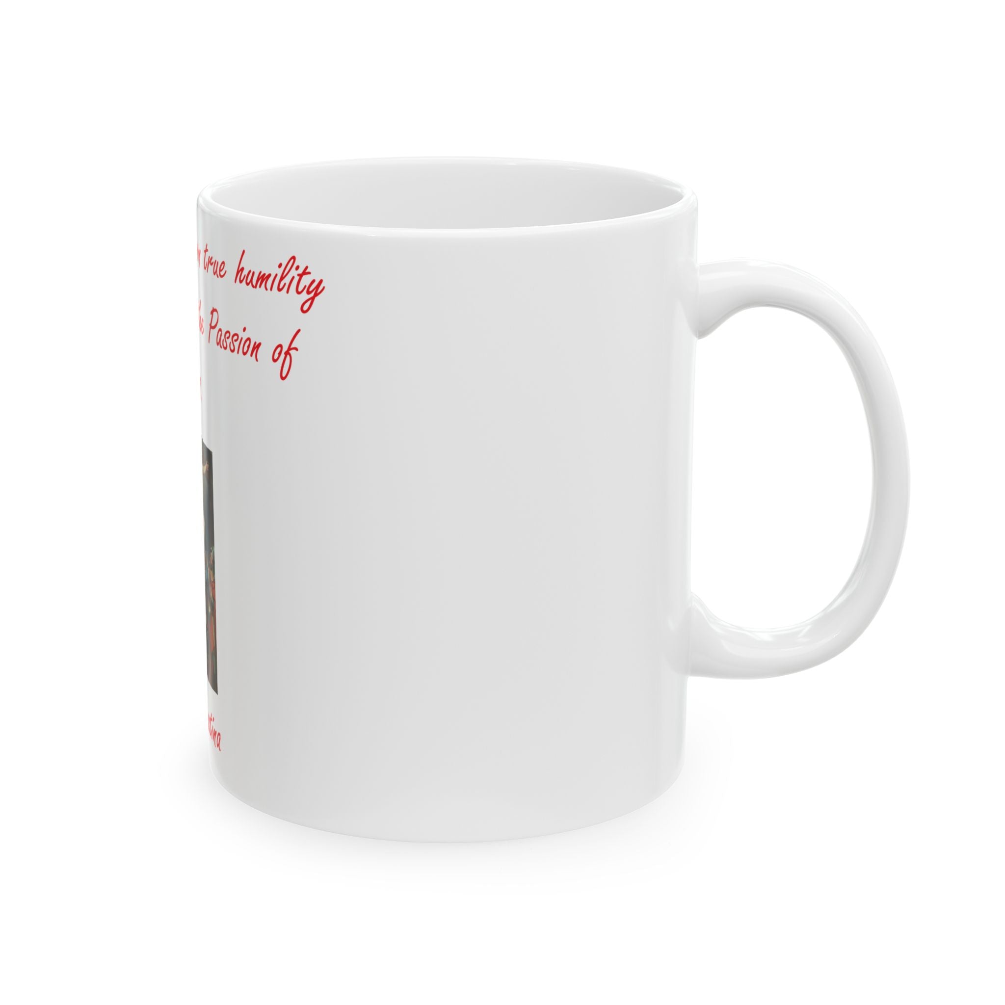 Find inspiration in every sip with this beautifully designed Ceramic Mug, featuring the profound quote from St. Faustina: 'He who wants to learn true humility should reflect on the Passion of Jesus.' Paired with a striking image of the crucifixion, this mug serves as a powerful reminder of Christ’s sacrifice and the virtue of humility.