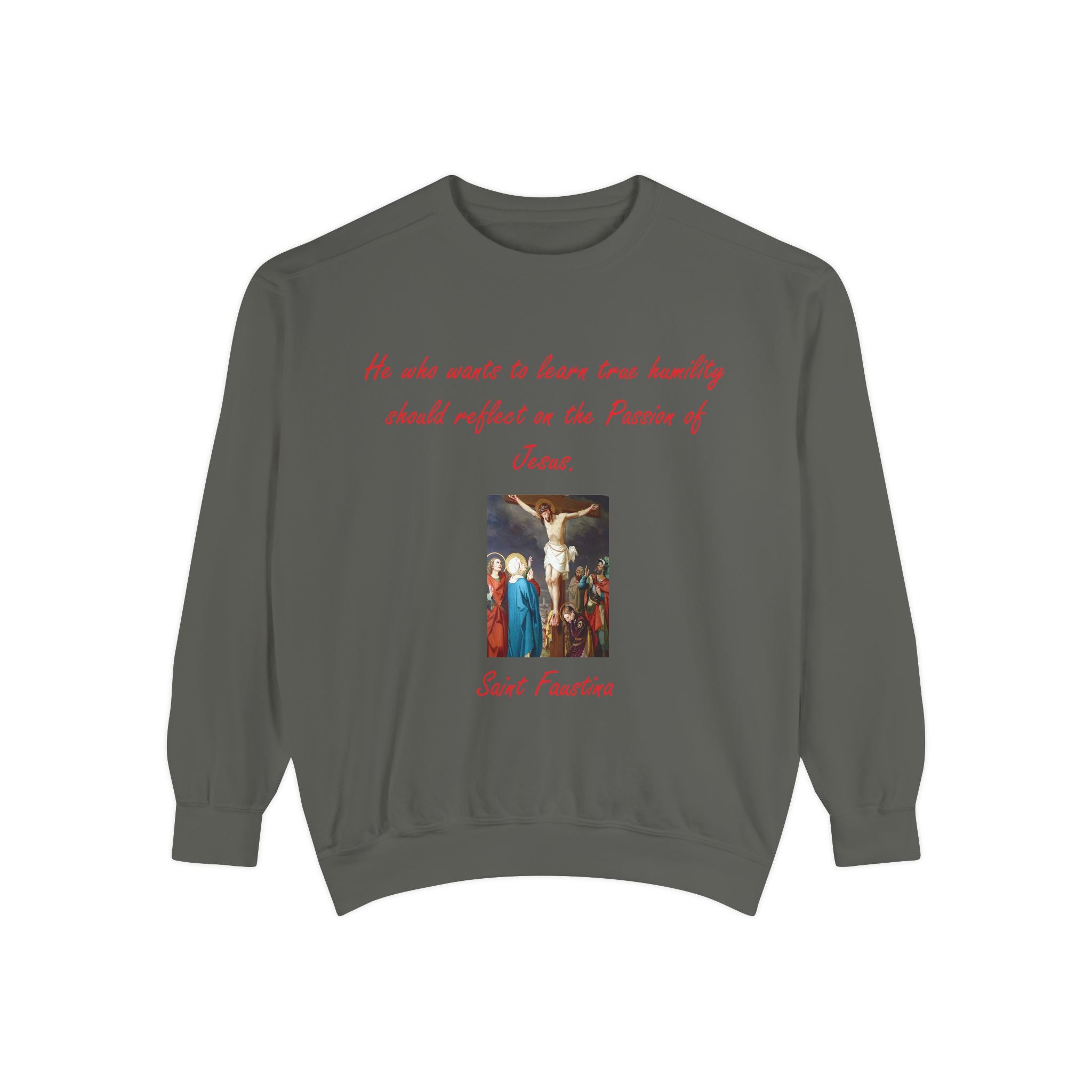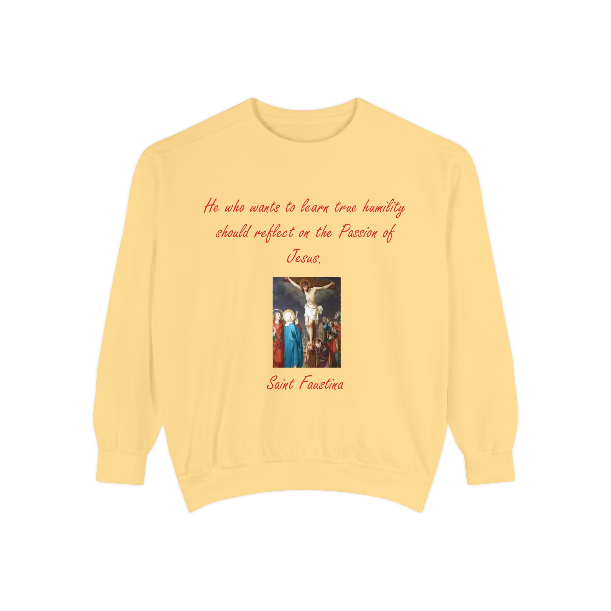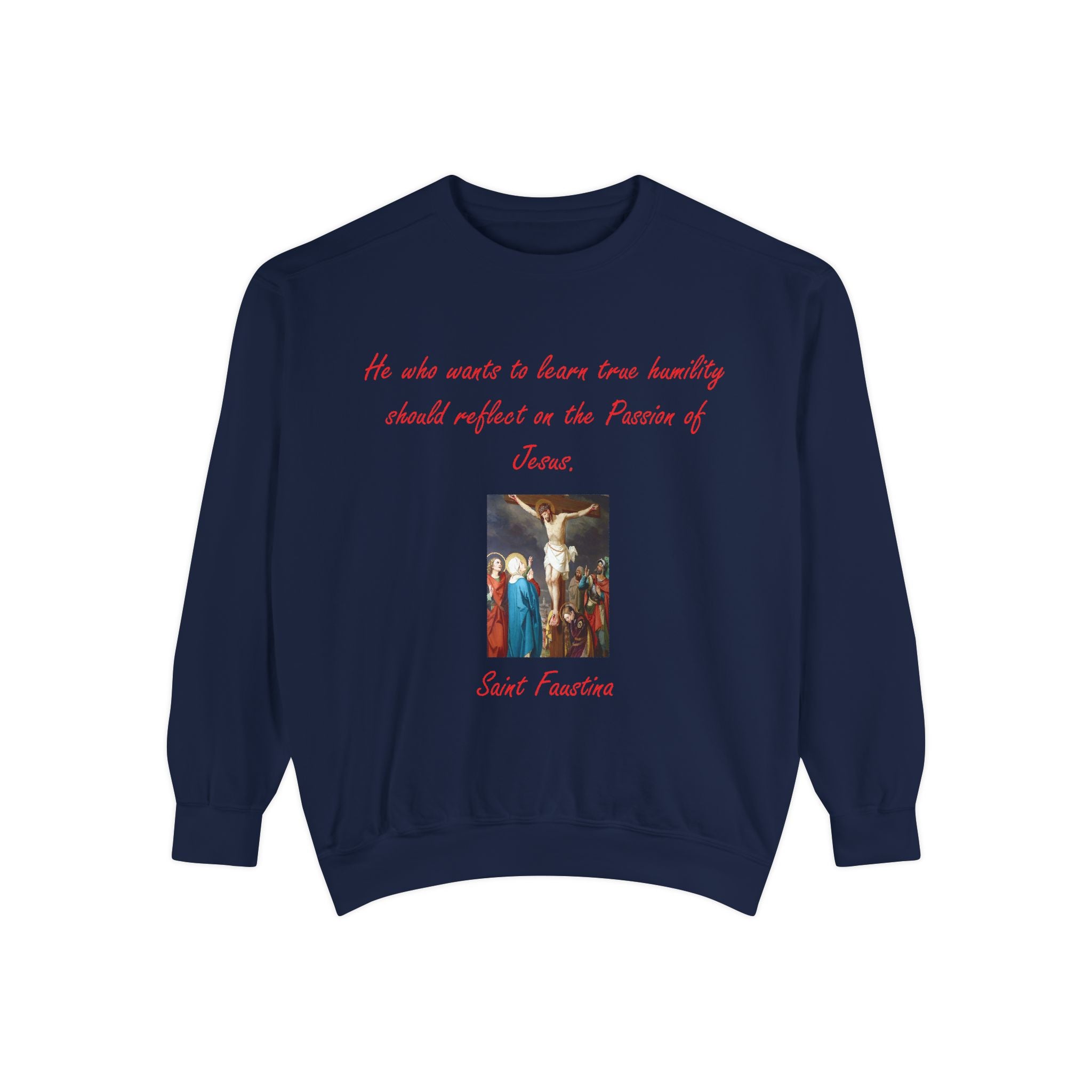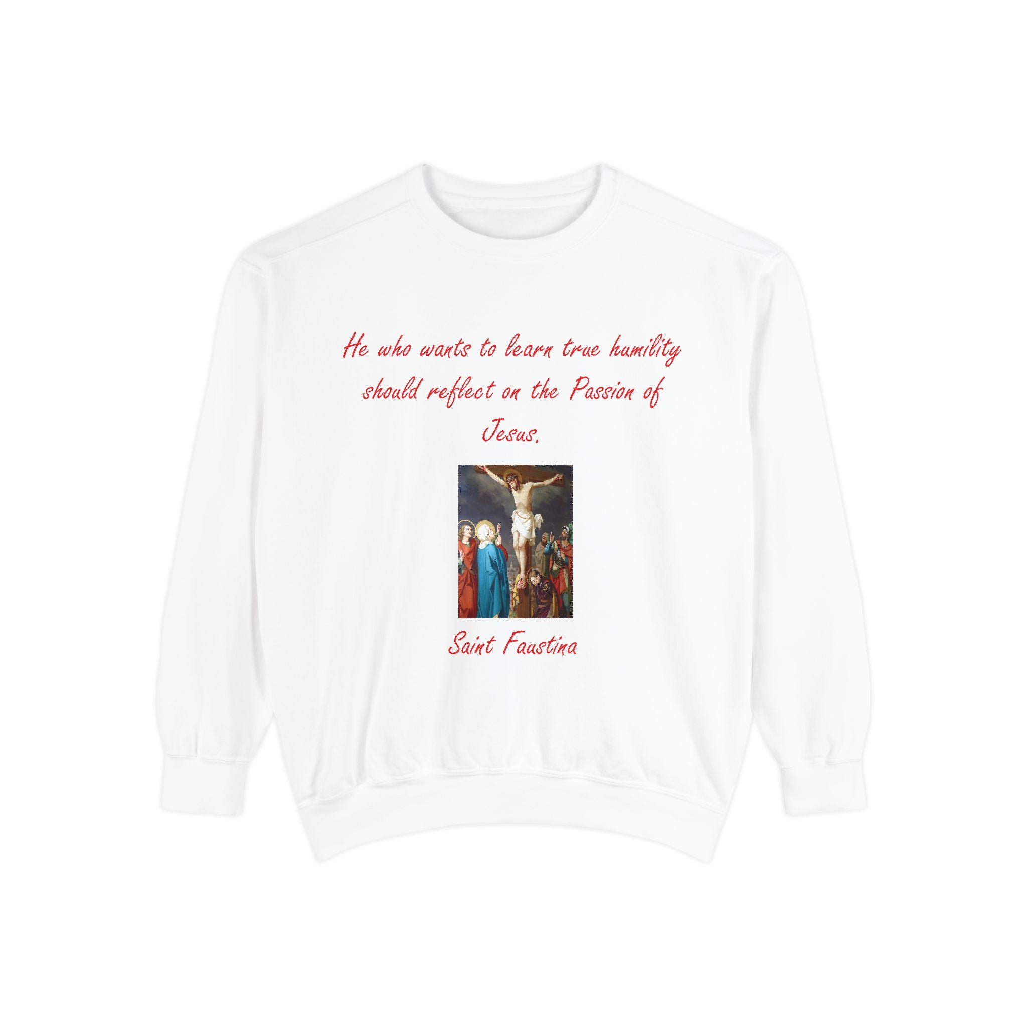 Wrap yourself in comfort and inspiration with this cozy Unisex Sweatshirt, featuring the profound words of St. Faustina: 'He who wants to learn true humility should reflect on the Passion of Jesus.' Paired with a striking depiction of the crucifixion, this design offers both warmth and a meaningful reminder of faith and humility.