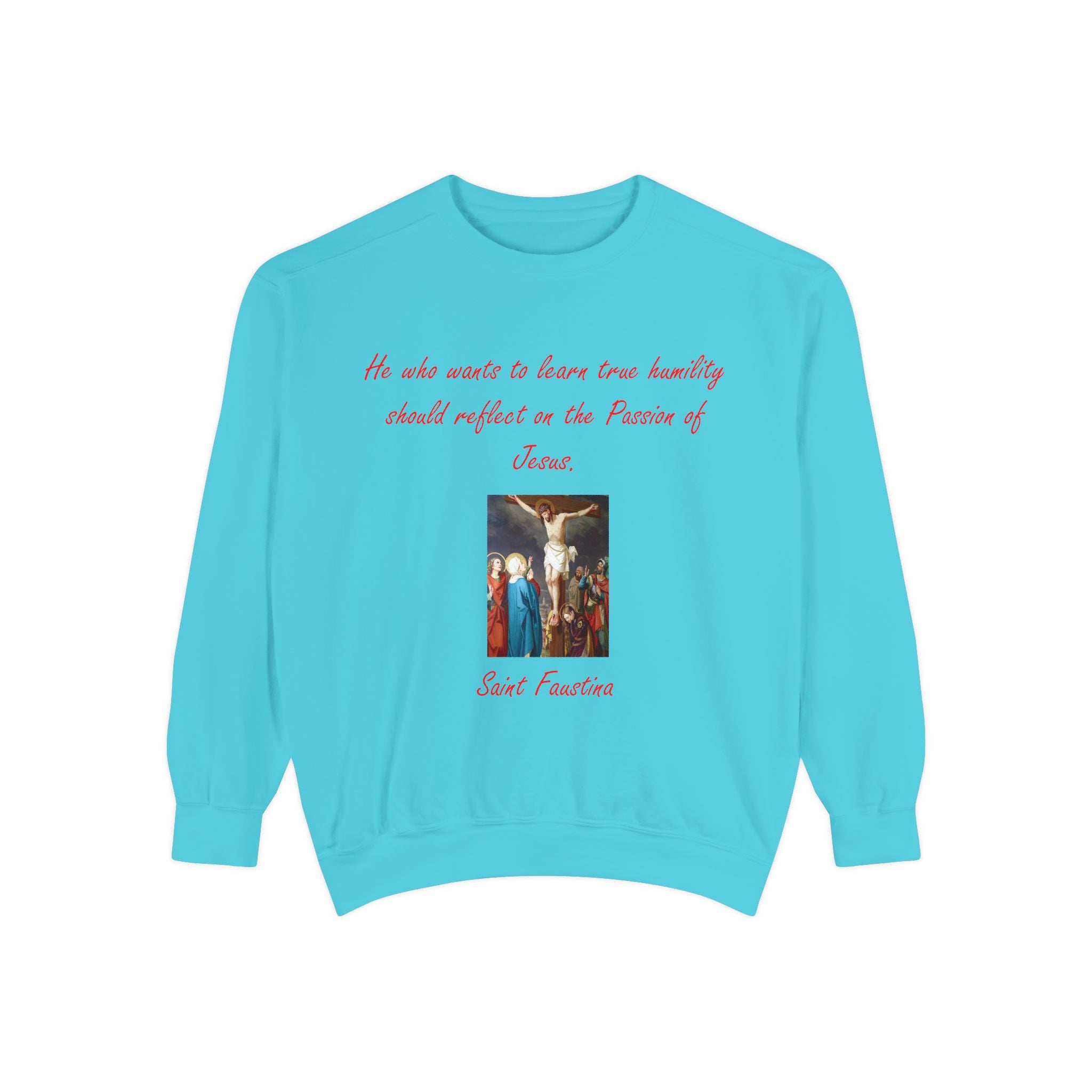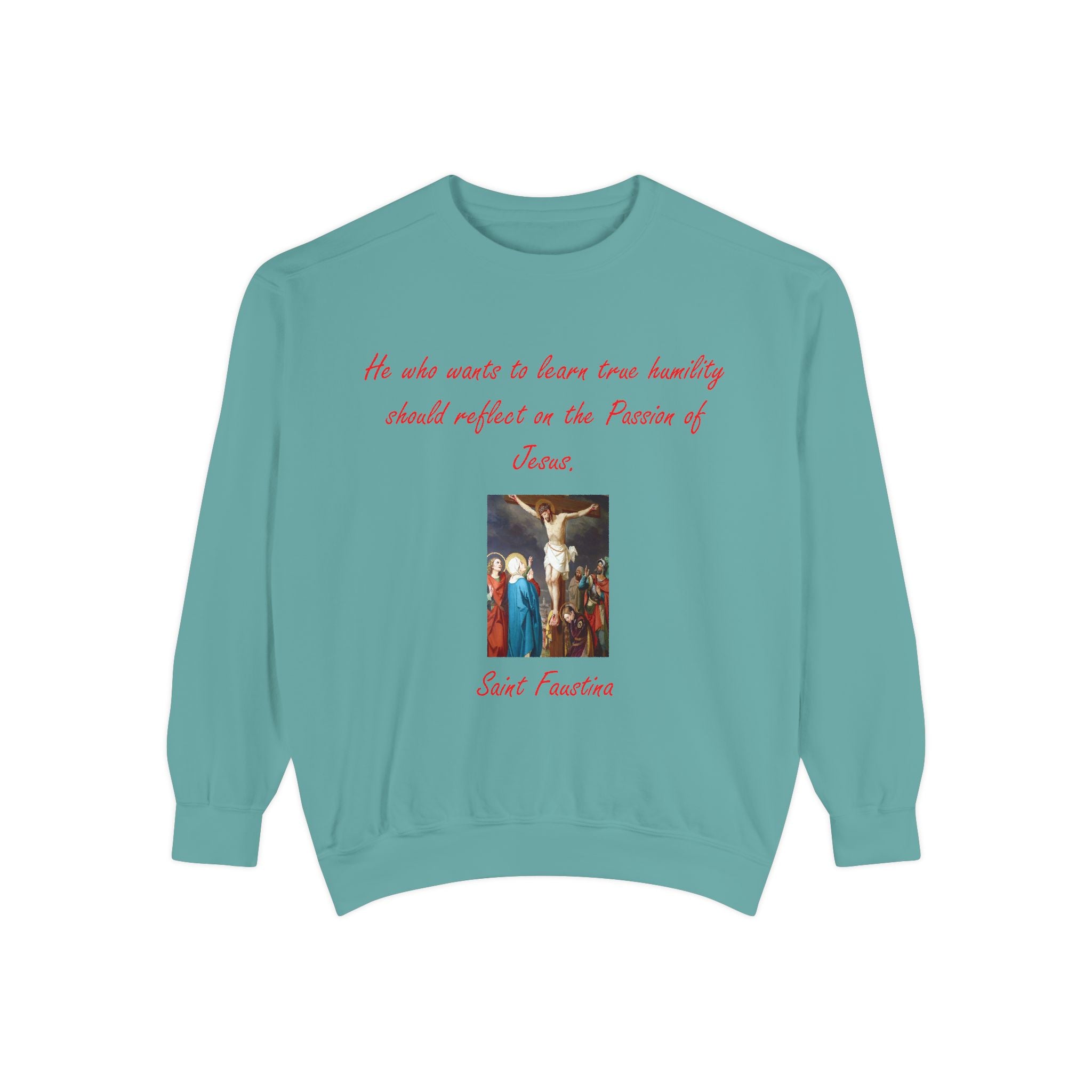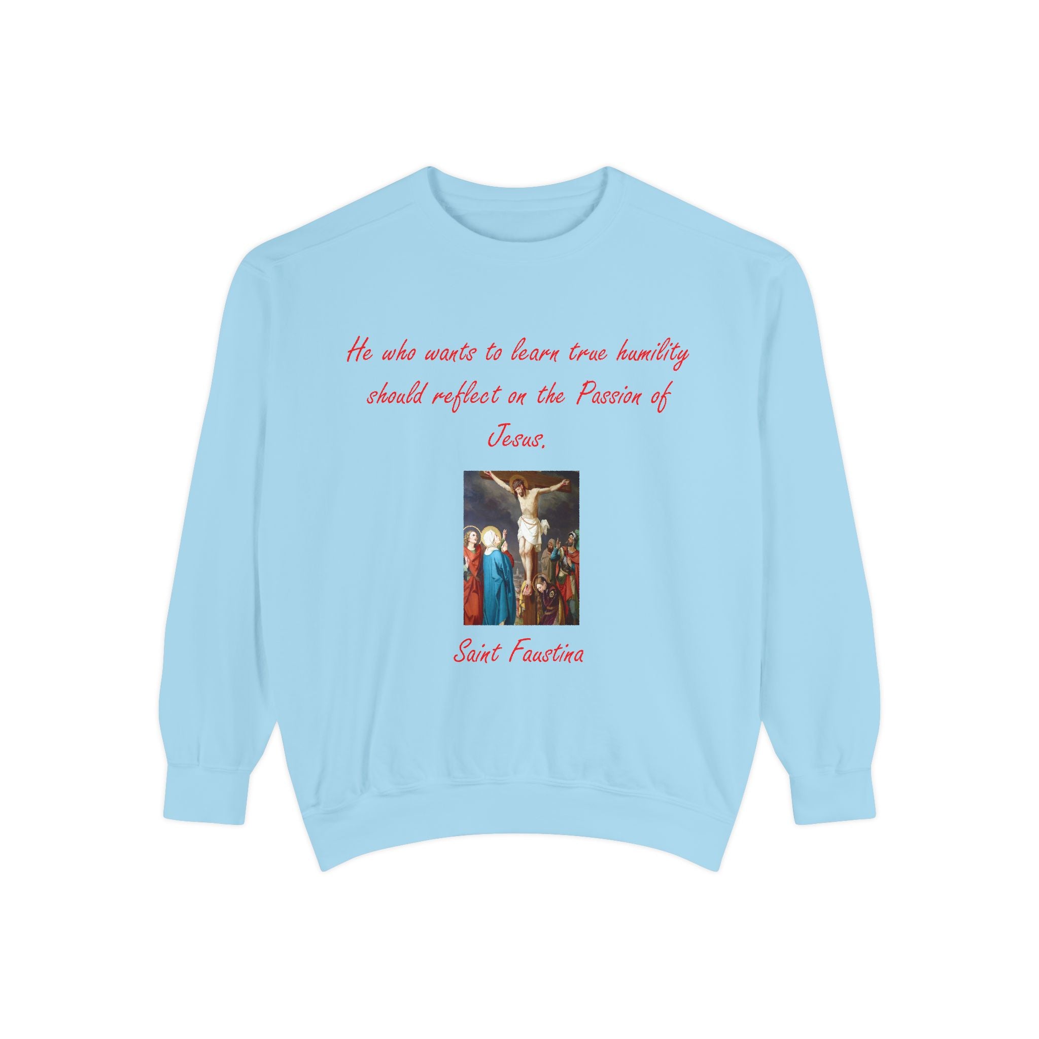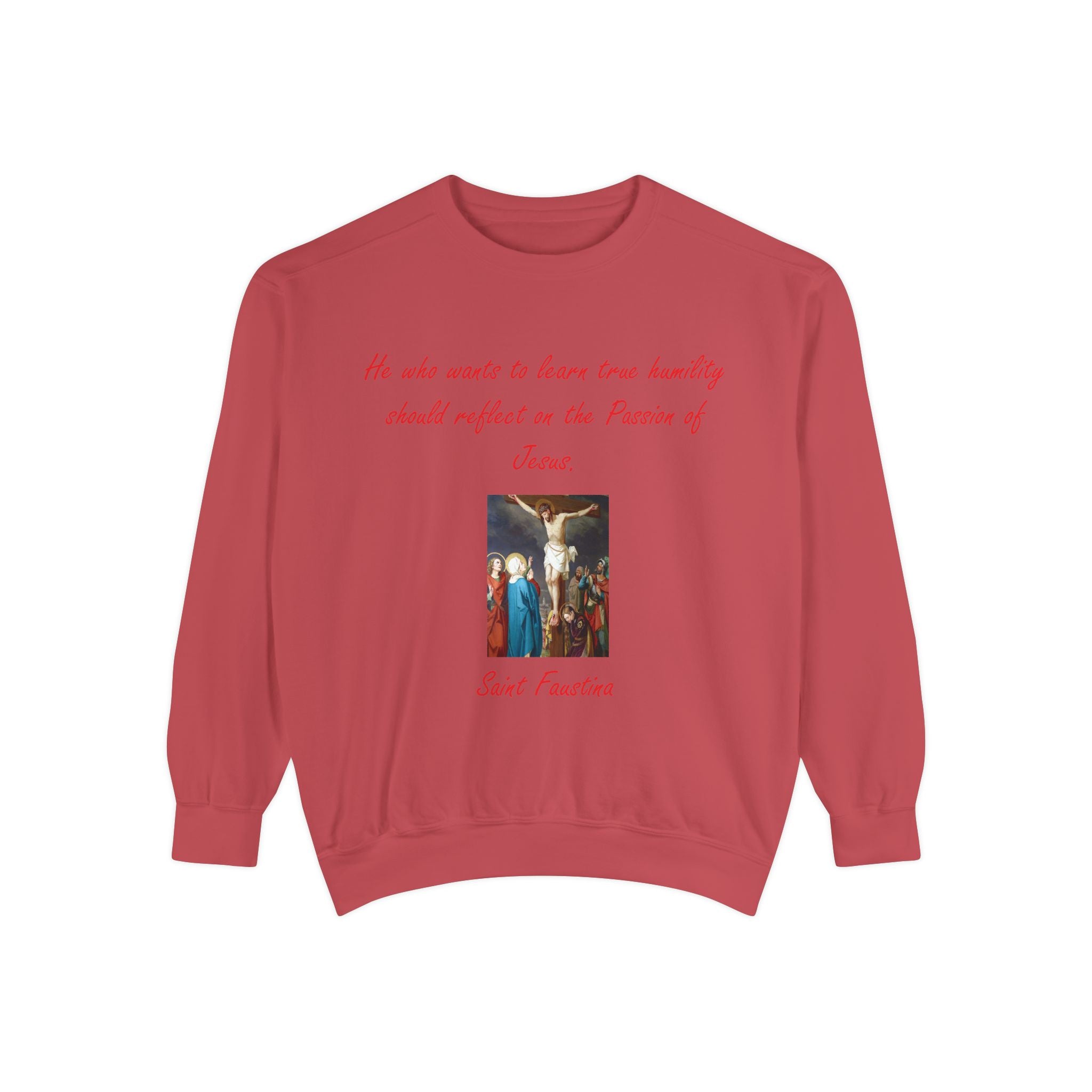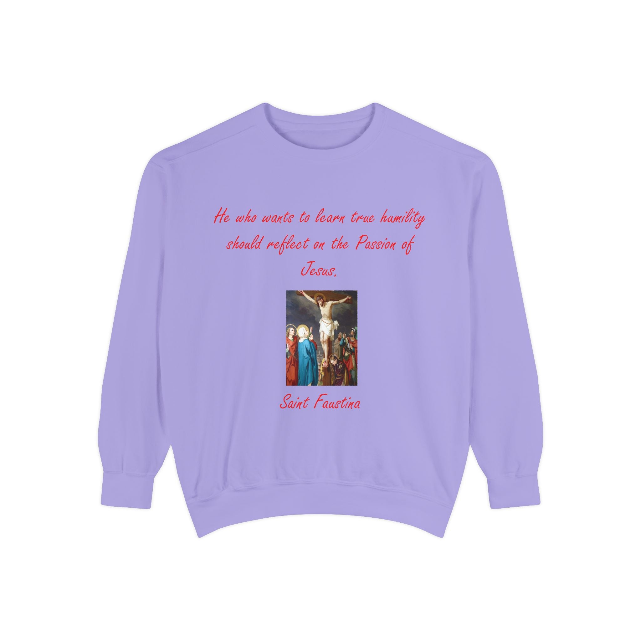 Wrap yourself in comfort and inspiration with this cozy Unisex Sweatshirt, featuring the profound words of St. Faustina: 'He who wants to learn true humility should reflect on the Passion of Jesus.' Paired with a striking depiction of the crucifixion, this design offers both warmth and a meaningful reminder of faith and humility.
